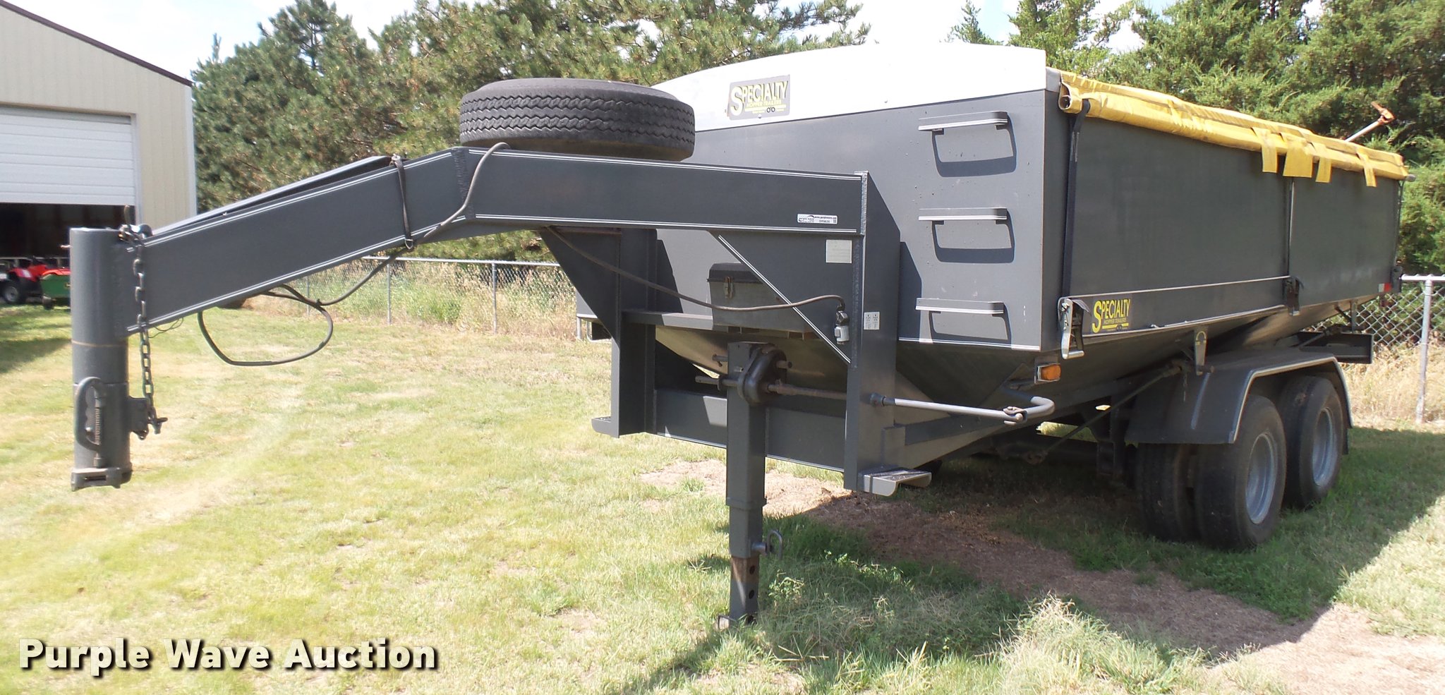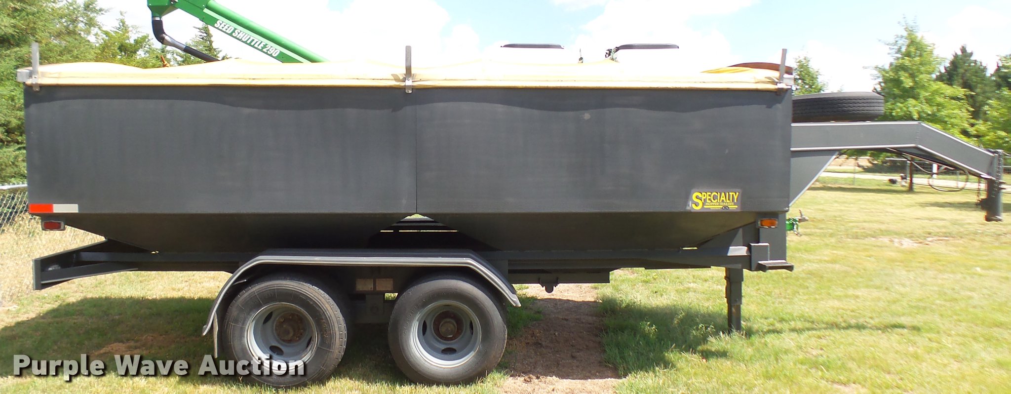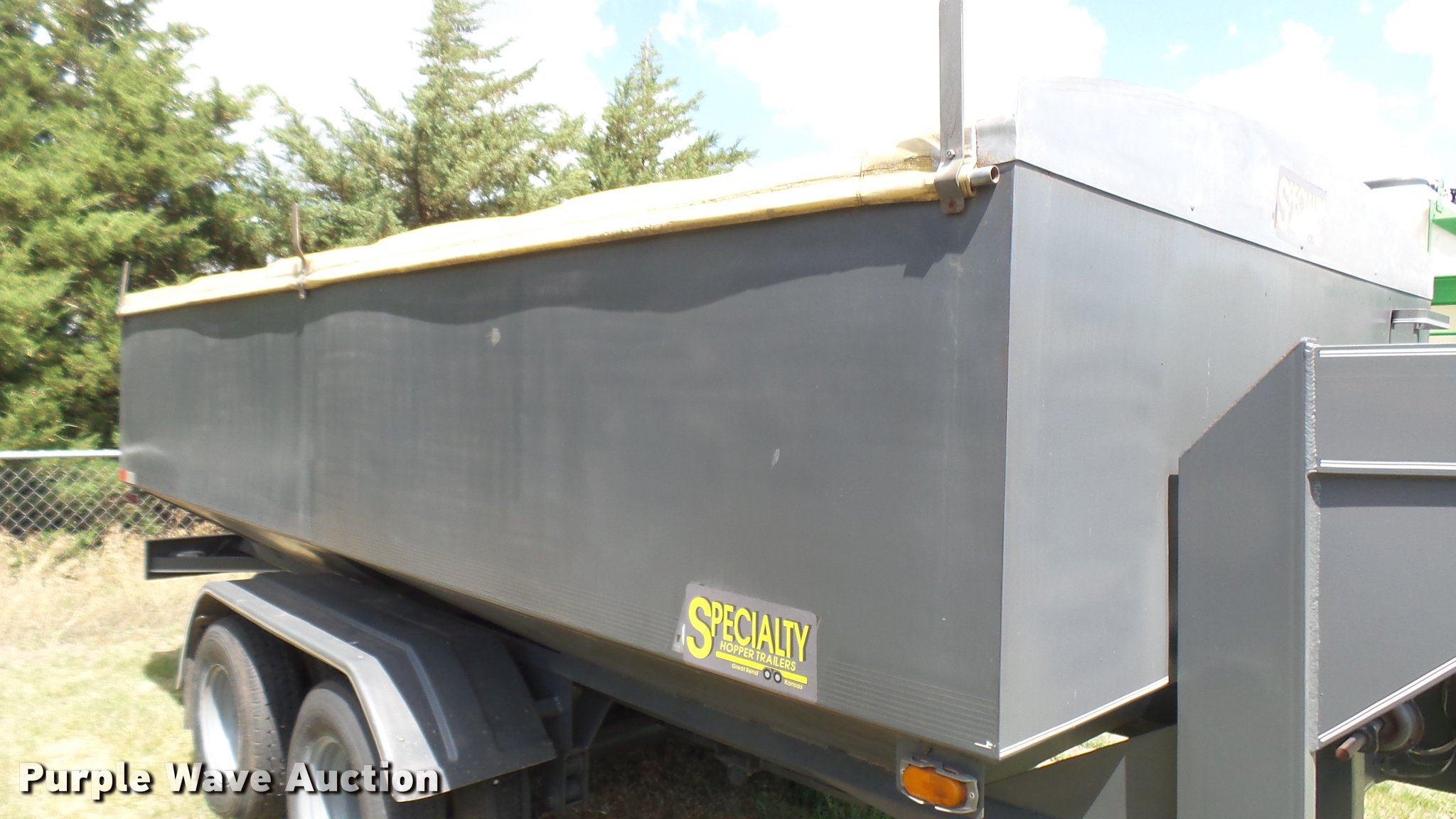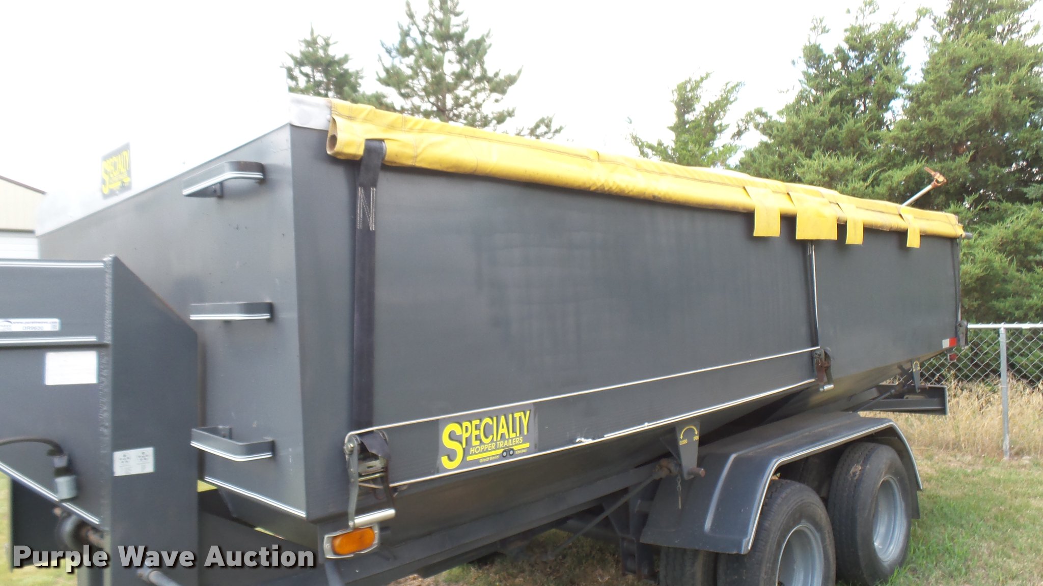 Purple Wave is selling a used Grain or Commodity Trailer in Kansas. This item is a 1993 Specialty hopper bottom grain trailer with the following: 16'L x 8'W, 36" side height, 400 bushel capacity, Rollover tarp, Gooseneck hitch, Tandem axle, 7.50R16 tires, GVWR 24,000 lbs