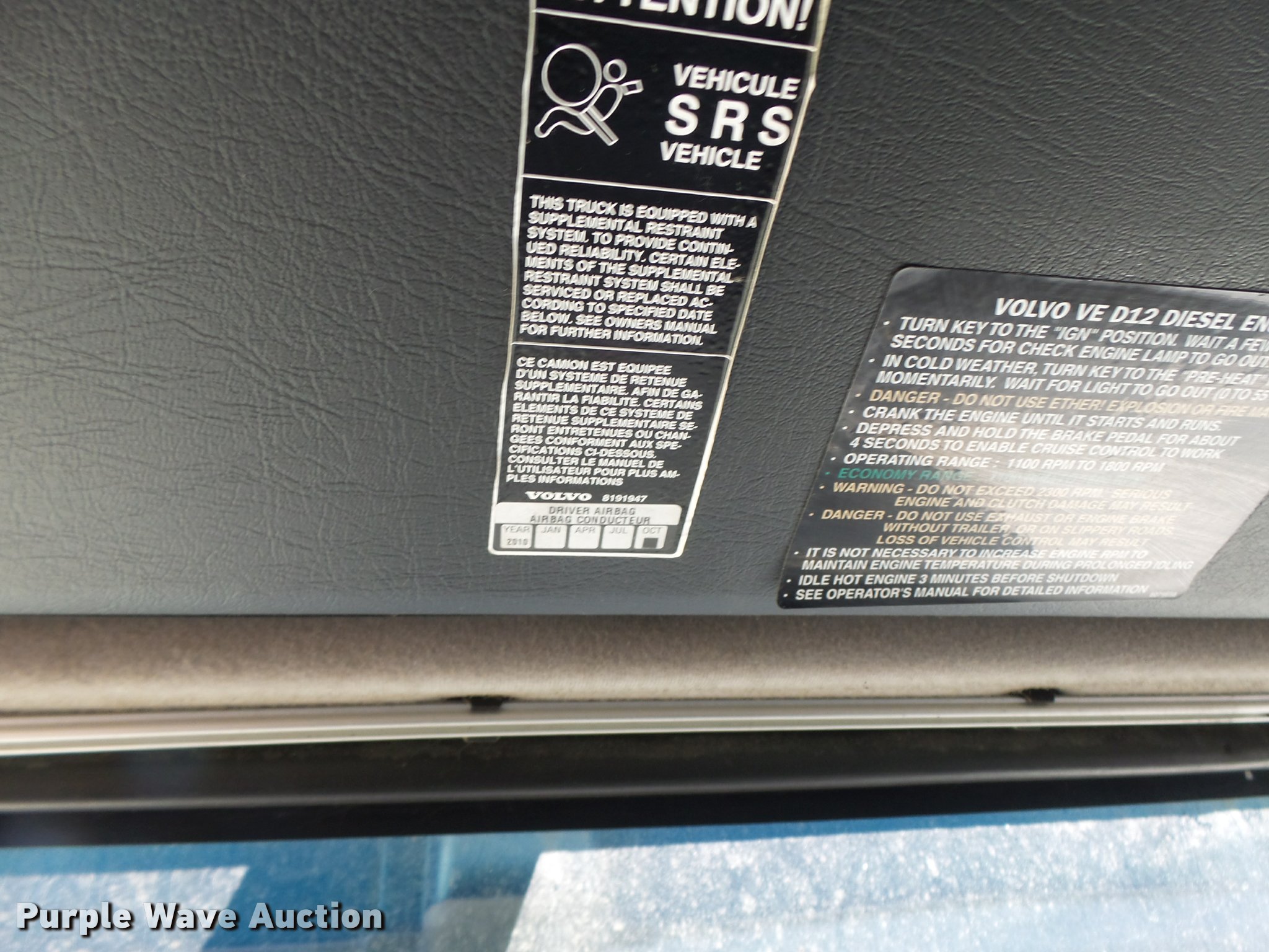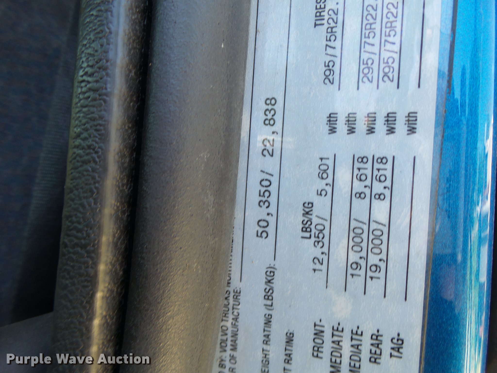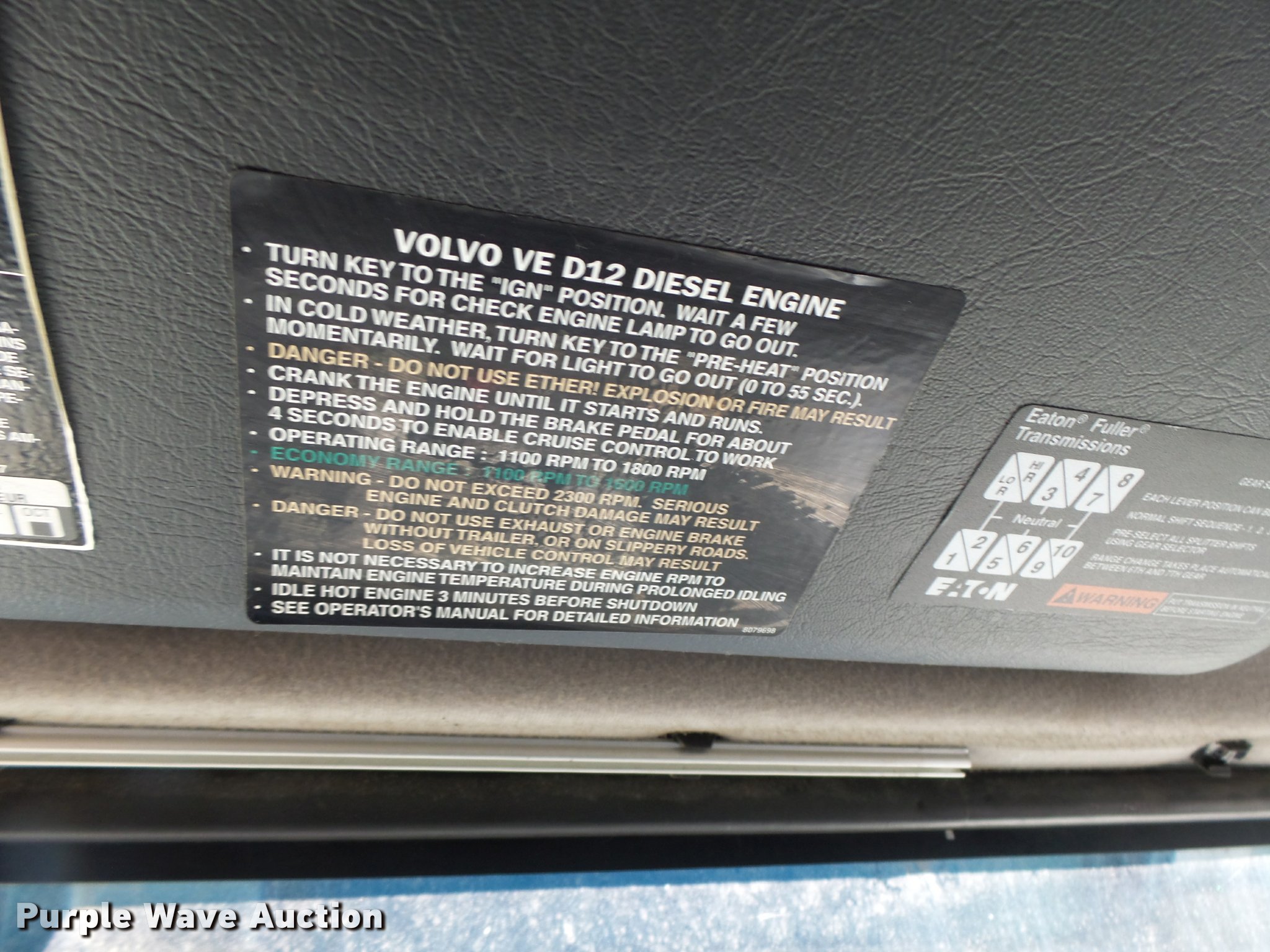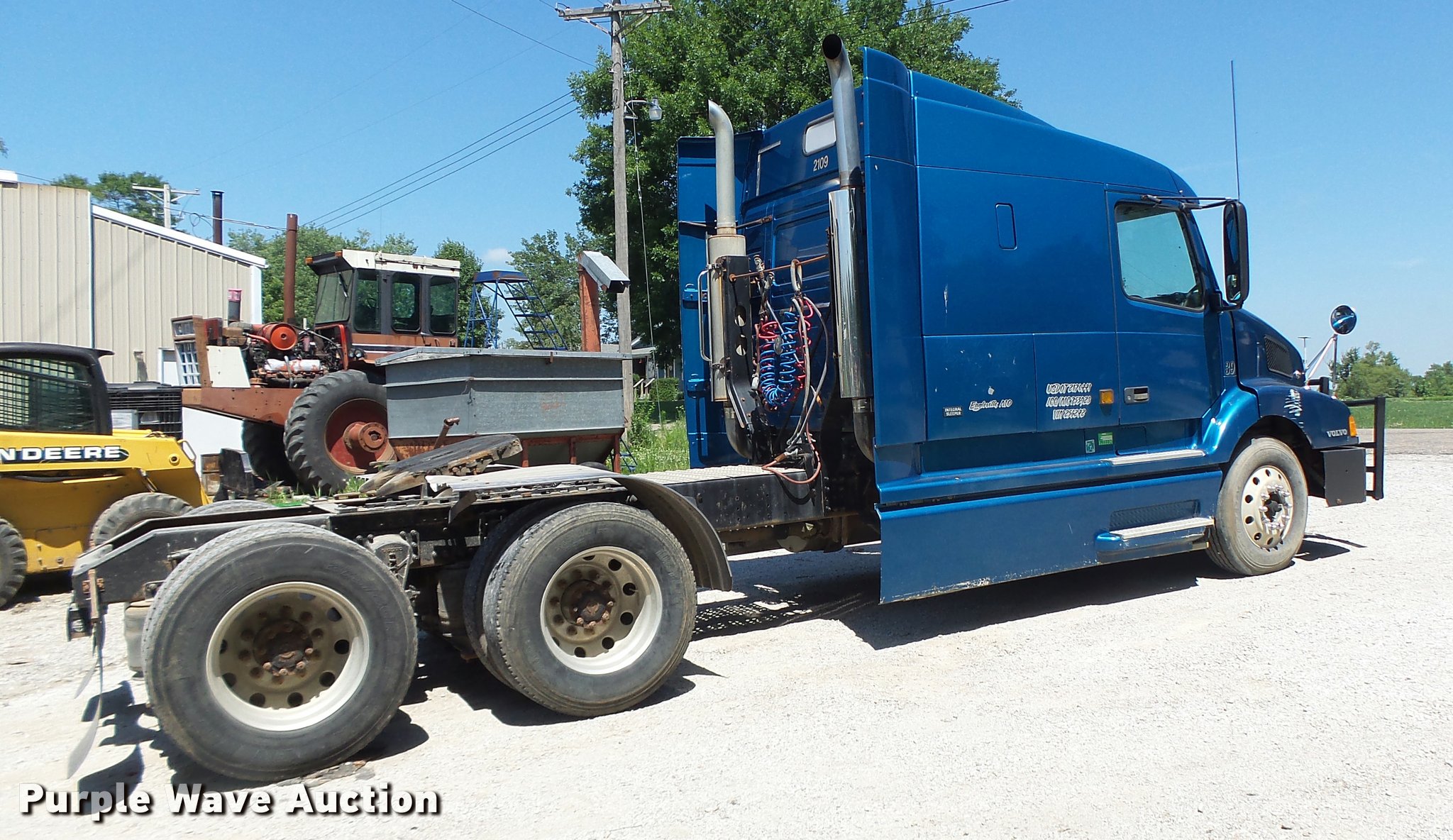 Purple Wave is selling a used Truck Tractor in Missouri. This item is a 2001 Volvo VNL semi truck with the following: 139,535 miles on odometer, Volvo VE D12 12.1L L6 turbo diesel engine, Serial D12128603, Eaton Fuller RTL0-16610B ten speed manual transmission, Tandem axle, Inter-axle differential lock, AC and heat, Cruise, AM/FM/cassette, Power windows, Heated mirrors, Air suspension seat, Sleeper, Single bed, Rear climate control, Hanging closet, Exterior visor, Dual exhaust stack, Aluminum deck plate, Sliding fifth wheel plate, Dual fuel tanks, Quarter fenders, Air suspension, Air brakes, 295/75R22.5 front tires, 295/75R22.5 rear tires, 275/80R22.5 rear tires, GVWR 50,350 lbs