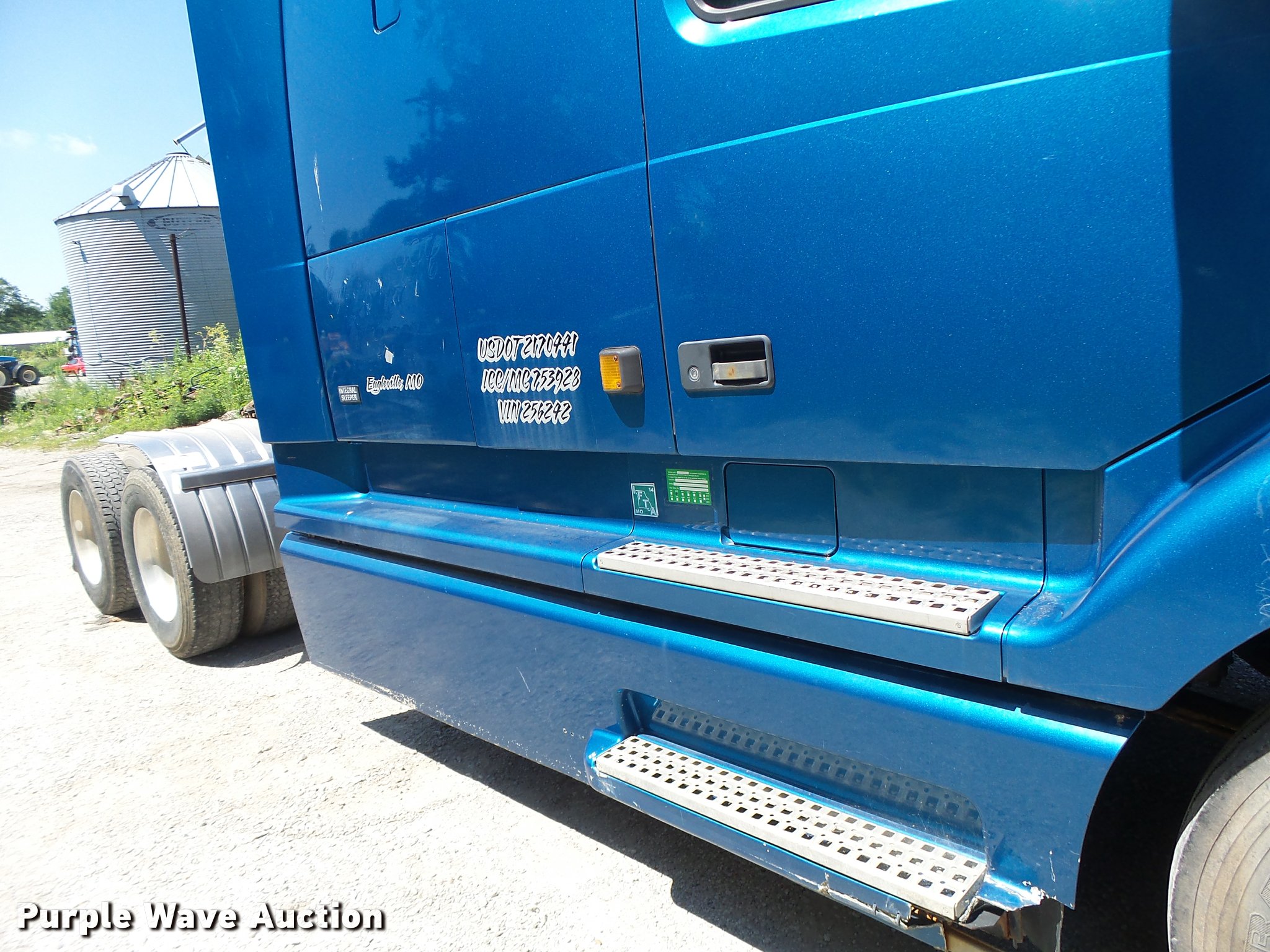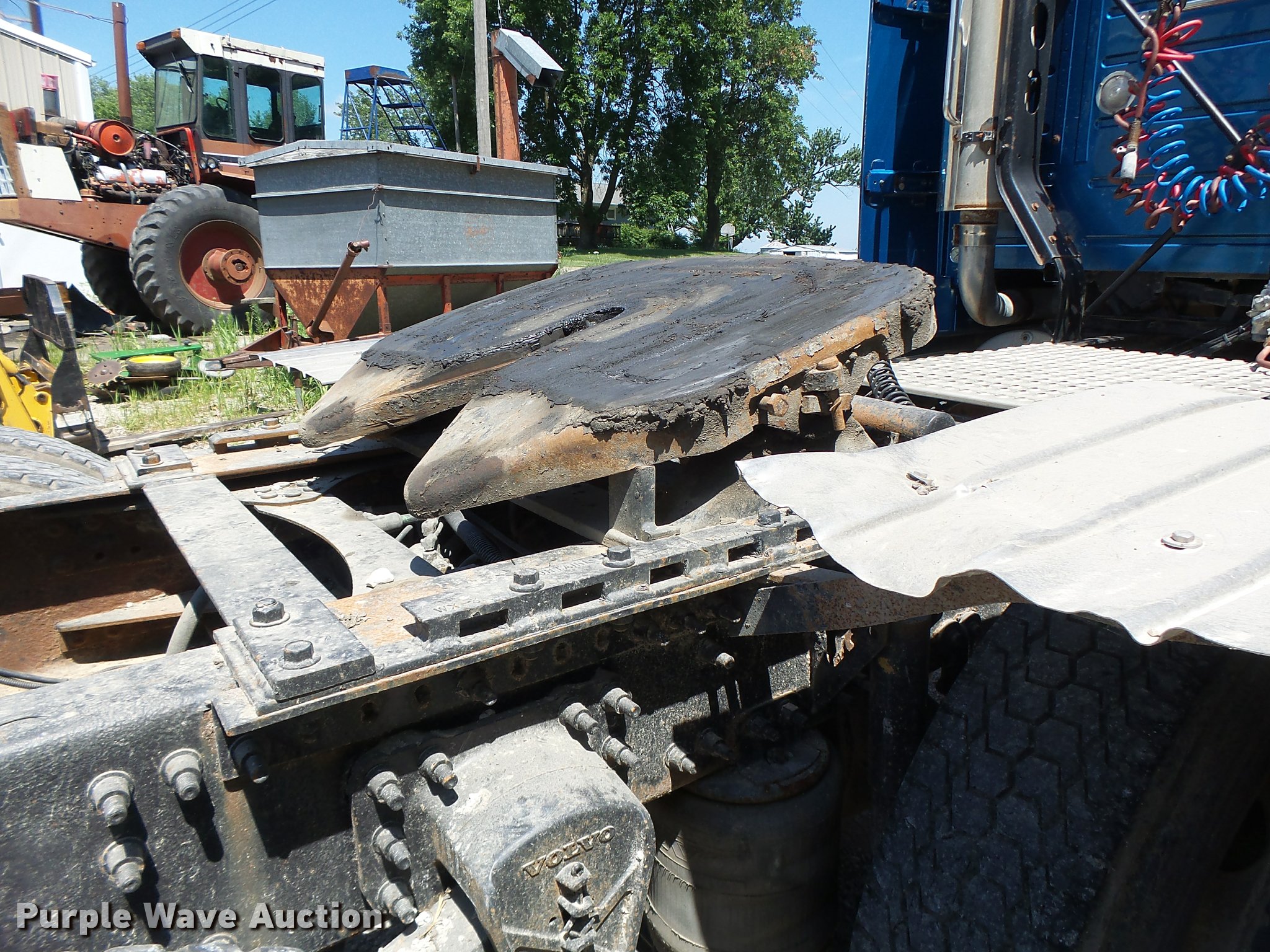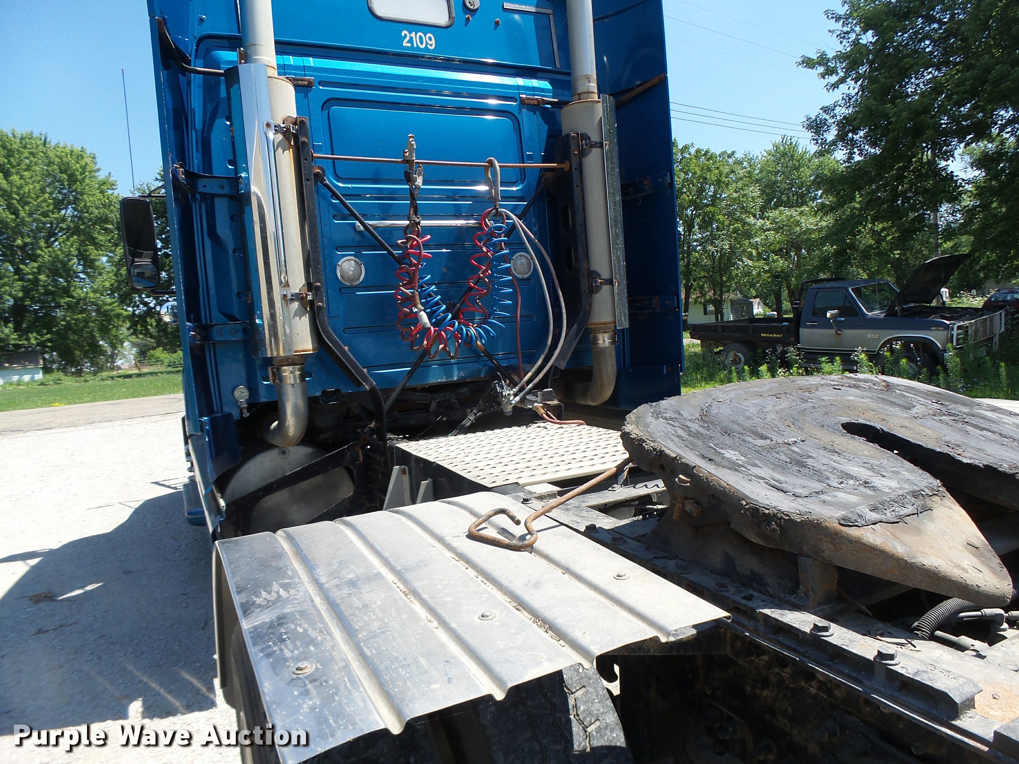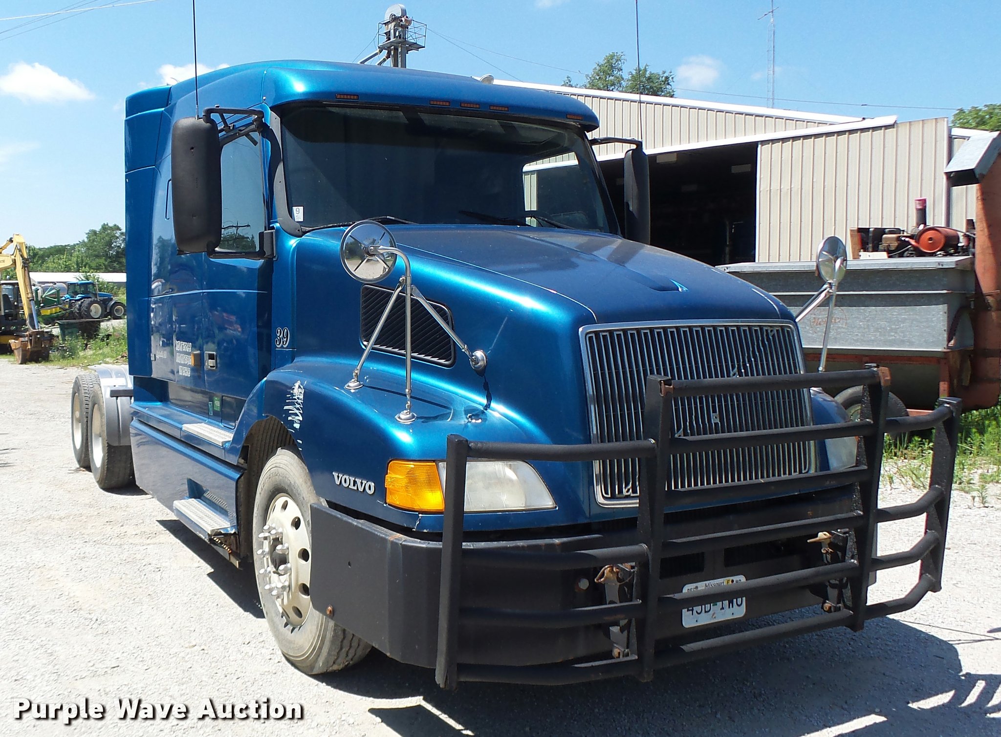 Purple Wave is selling a used Truck Tractor in Missouri. This item is a 2001 Volvo VNL semi truck with the following: 139,535 miles on odometer, Volvo VE D12 12.1L L6 turbo diesel engine, Serial D12128603, Eaton Fuller RTL0-16610B ten speed manual transmission, Tandem axle, Inter-axle differential lock, AC and heat, Cruise, AM/FM/cassette, Power windows, Heated mirrors, Air suspension seat, Sleeper, Single bed, Rear climate control, Hanging closet, Exterior visor, Dual exhaust stack, Aluminum deck plate, Sliding fifth wheel plate, Dual fuel tanks, Quarter fenders, Air suspension, Air brakes, 295/75R22.5 front tires, 295/75R22.5 rear tires, 275/80R22.5 rear tires, GVWR 50,350 lbs