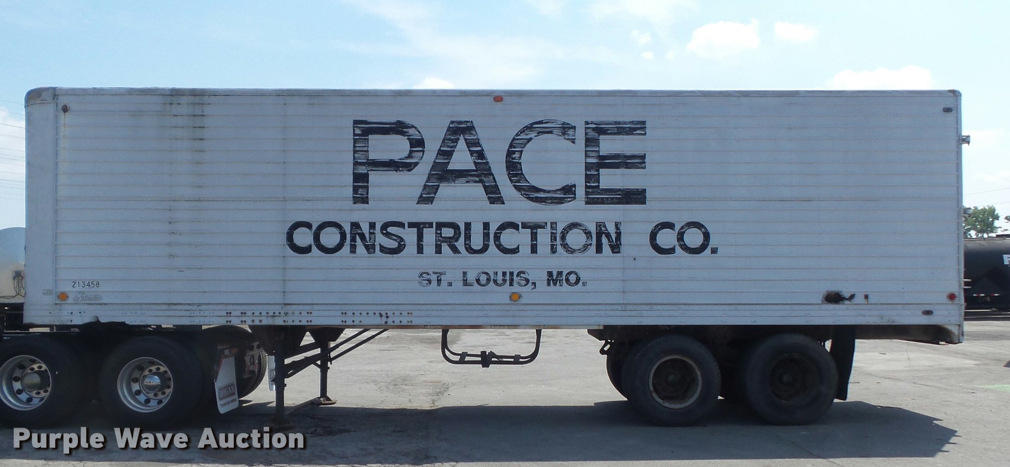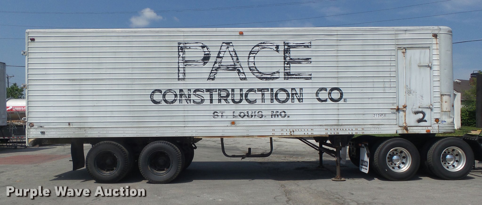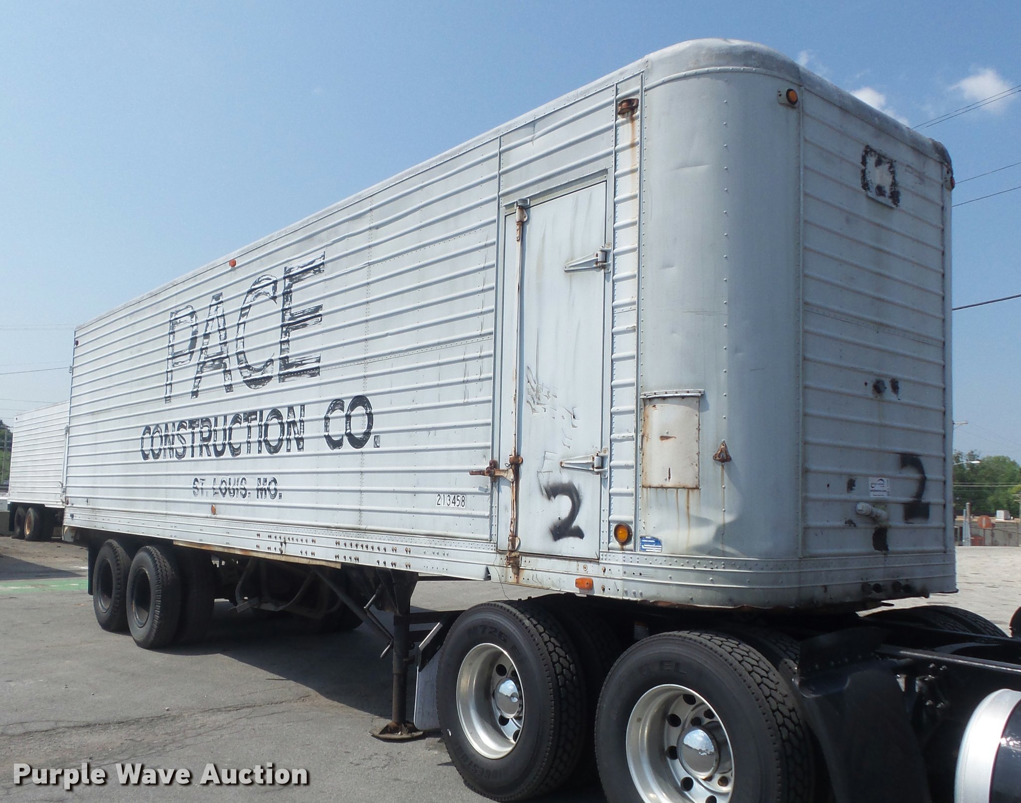 Purple Wave is selling a used Dry Van Trailer in Missouri. This item is a 1951 Brown dry van trailer with the following: 34'L x 8'W, Wood deck, Swinging rear doors, Right side door, Fifth wheel plate, Dual leg landing gear, Spring suspension, Air brakes, Steel wheels, 10.00-20 tires, Unit# 213458