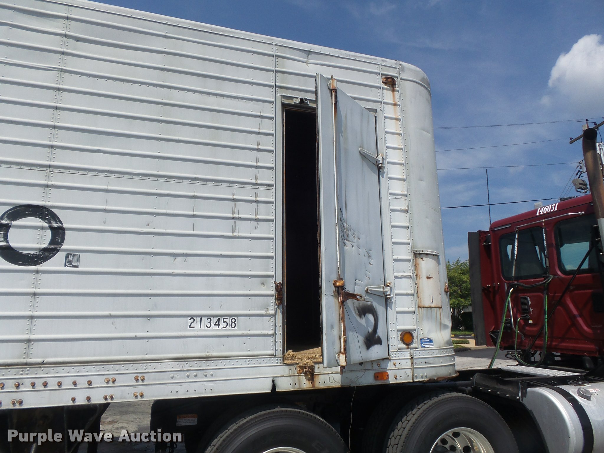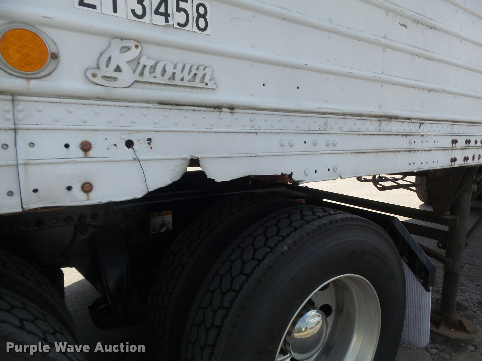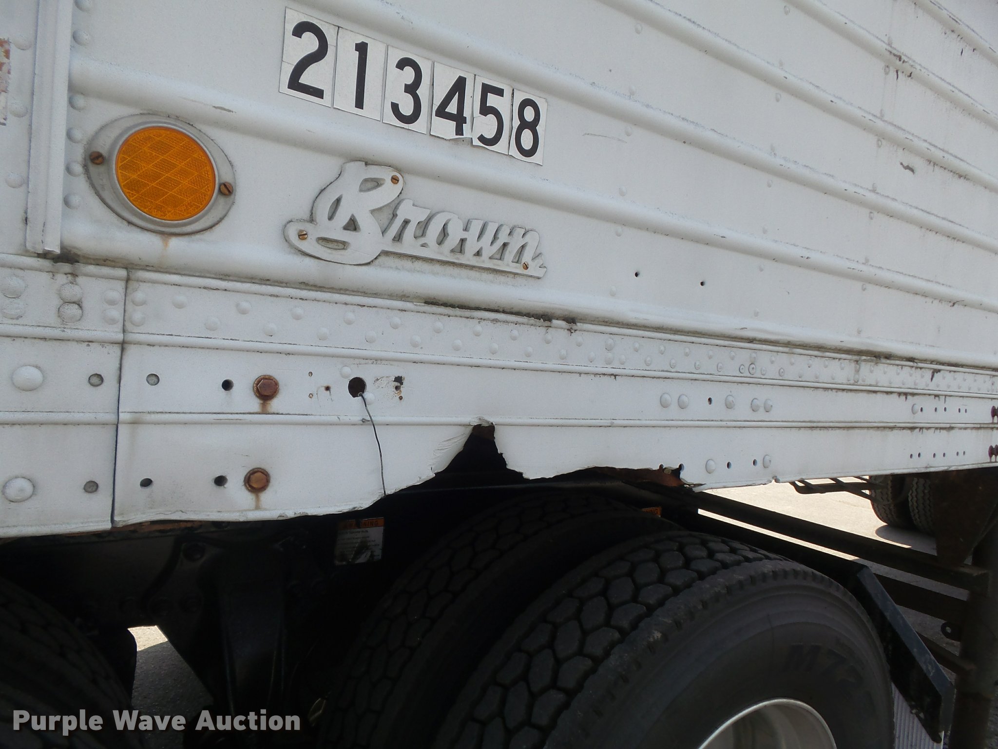 Purple Wave is selling a used Dry Van Trailer in Missouri. This item is a 1951 Brown dry van trailer with the following: 34'L x 8'W, Wood deck, Swinging rear doors, Right side door, Fifth wheel plate, Dual leg landing gear, Spring suspension, Air brakes, Steel wheels, 10.00-20 tires, Unit# 213458