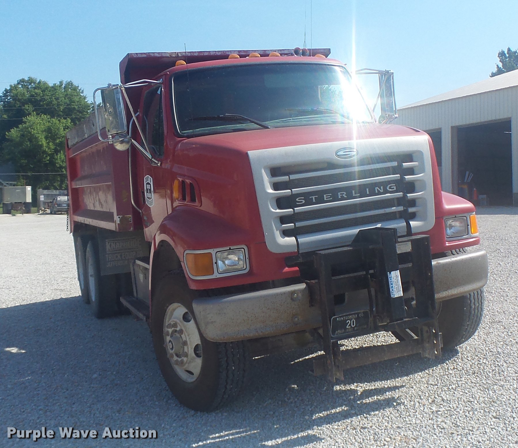 Purple Wave is selling a used Construction Dump Truck in Missouri. This item is a 2003 Sterling L7500 dump truck with the following: 359,838 miles on odometer, 17,226 hours on meter, Caterpillar 3126 7.2L L6 turbo diesel engine, Eaton Fuller Road Ranger RTO8LL 10 speed manual transmission, Tandem axle, Inter-axle differential lock, AC and heat, Cruise, AM/FM/CD, Heated mirrors, Air suspension seat, PTO, Henderson XDX15X44 steel dump bed, 15'L x 8'W, 44" side height, 12" side board height, Air operated end gate, Single ramp hoist, Single fuel tank, Pintle hitch, Trailer wiring, Spring suspension, Air brakes, 315/80R22.5 front tires, 11R22.5 rear tires, GVWR 56,000 lbs