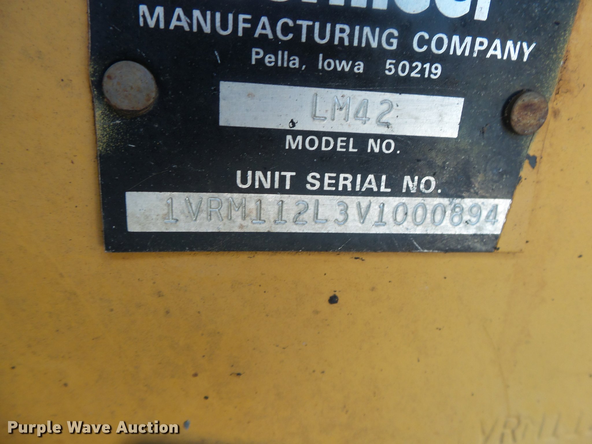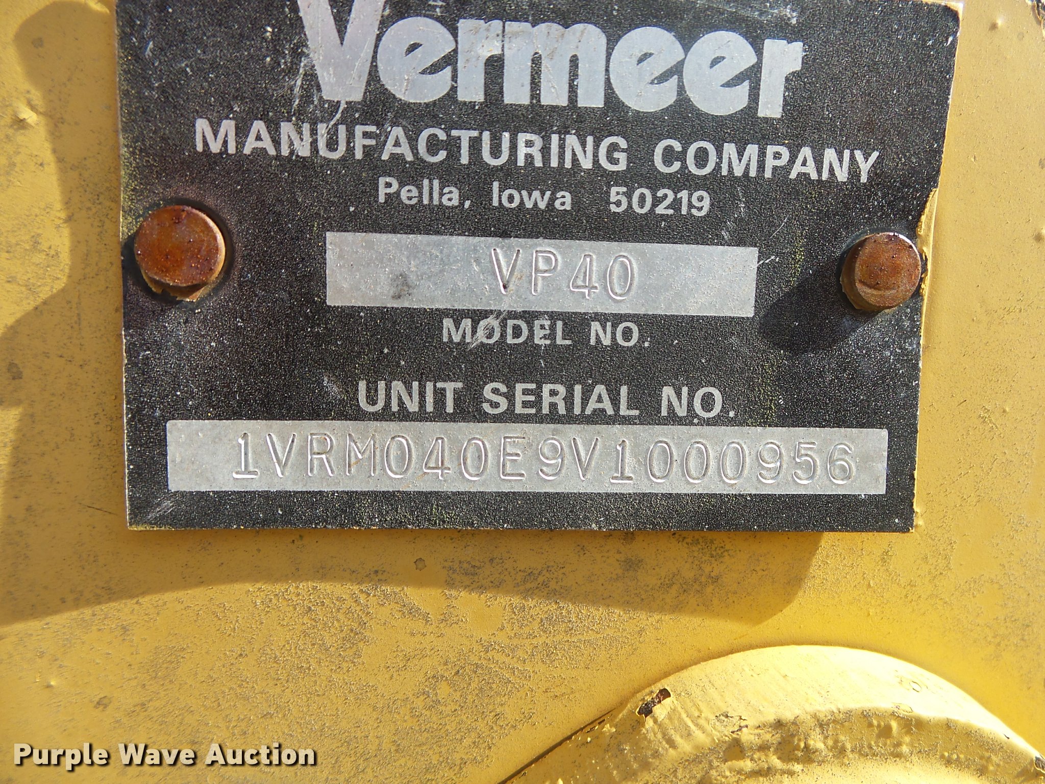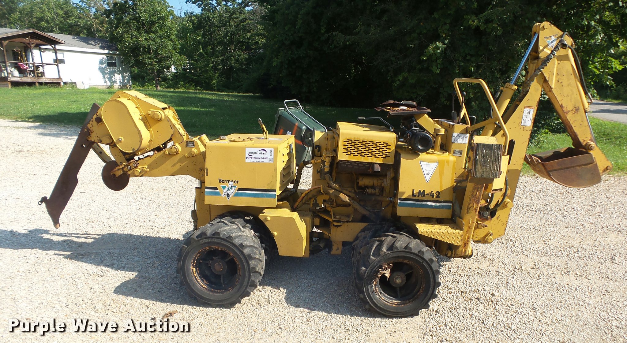Purple Wave is selling a used Cable Plow in Missouri. This item is a Vermeer LM-42 cable plow with the following: 960 hours on meter, Deutz F3L1011F three cylinder diesel engine, Serial 00182804, Hydrostatic transmission, Four wheel drive, B500 backhoe, 28" stick length, Wobble stick controls, 12"W three tooth bucket, Hydraulic outriggers, VP40 vibratory plow, 2'6" maximum digging depth, Hydraulic lift, Serial LVRM40E9V1000956, Center mounted wights, 23 x 10.50-12 tires, Seat damaged, parts missing, Serial VRM112L3V1000894