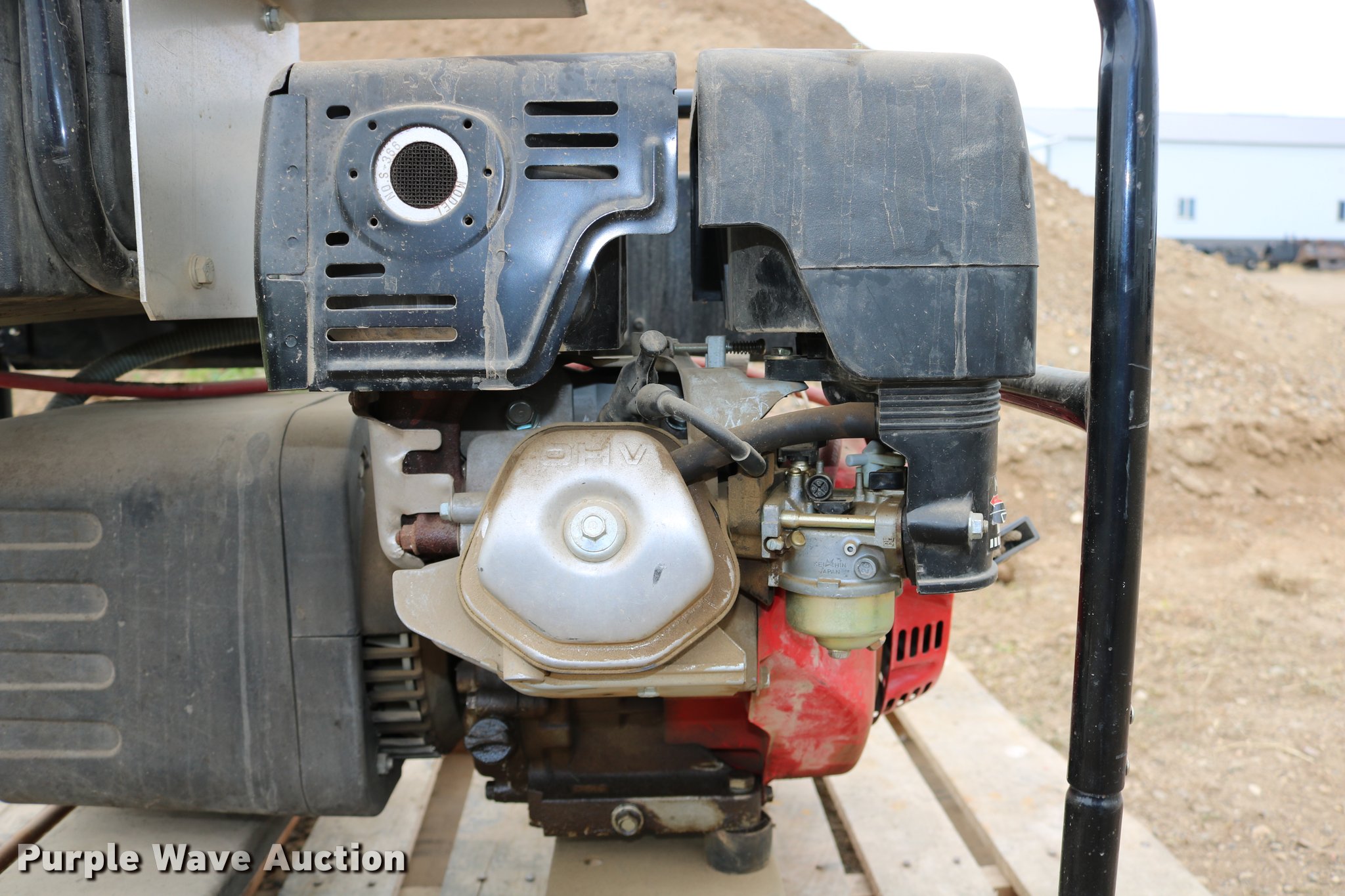 Onan Dunlite Power Equipment 5GRBA-378A generator. Honda GX340 337 cu. cm single cylinder gas engine 11 HP, Serial GC05-3096120, Dunlite generator 4,500 watts, Single phase, 7" x 1.5" solid wheel, Serial G99D953794. Badger Works. 17859 438th Ave. Henry, SD 57243