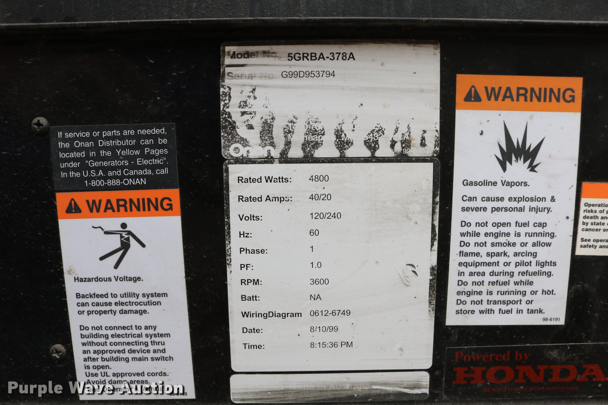 Purple Wave is selling a used Generator Set in South Dakota. This item is a Onan Dunlite Power Equipment 5GRBA-378A generator with the following: Honda GX340 337 cu. cm single cylinder gas engine, 11 HP, Serial GC05-3096120, Dunlite generator, 4,500 watts, Single phase, 7" x 1.5" solid wheel, Serial G99D953794