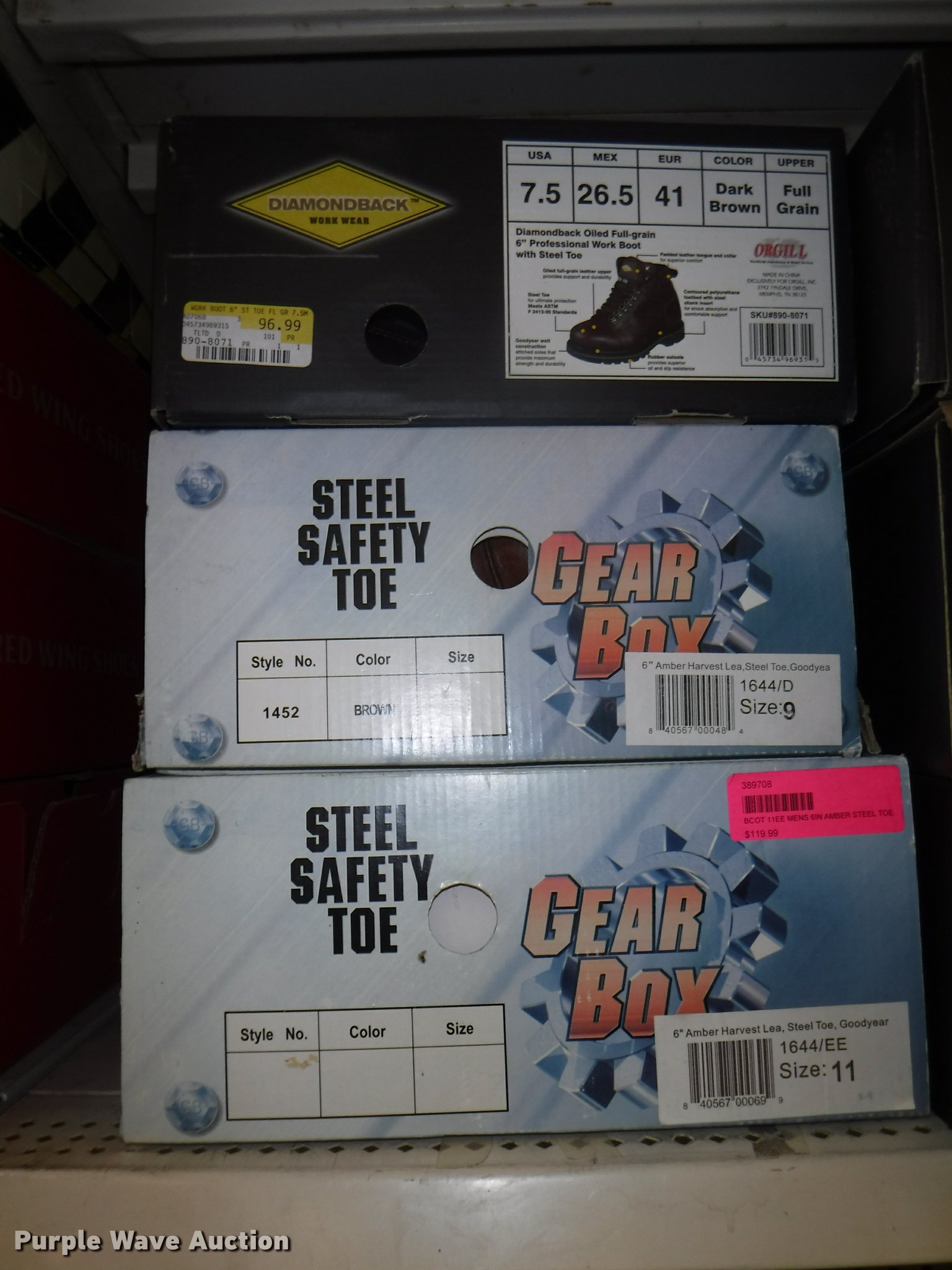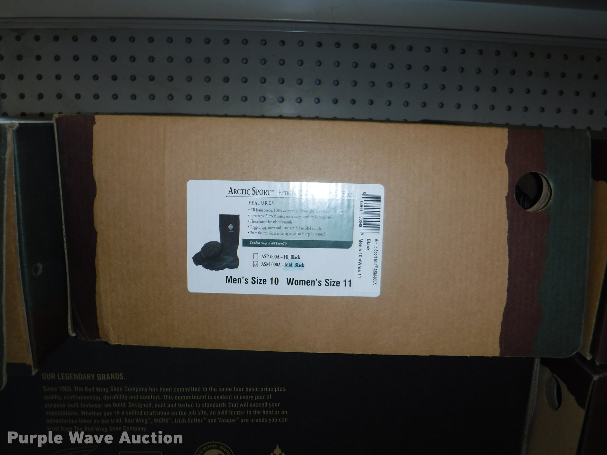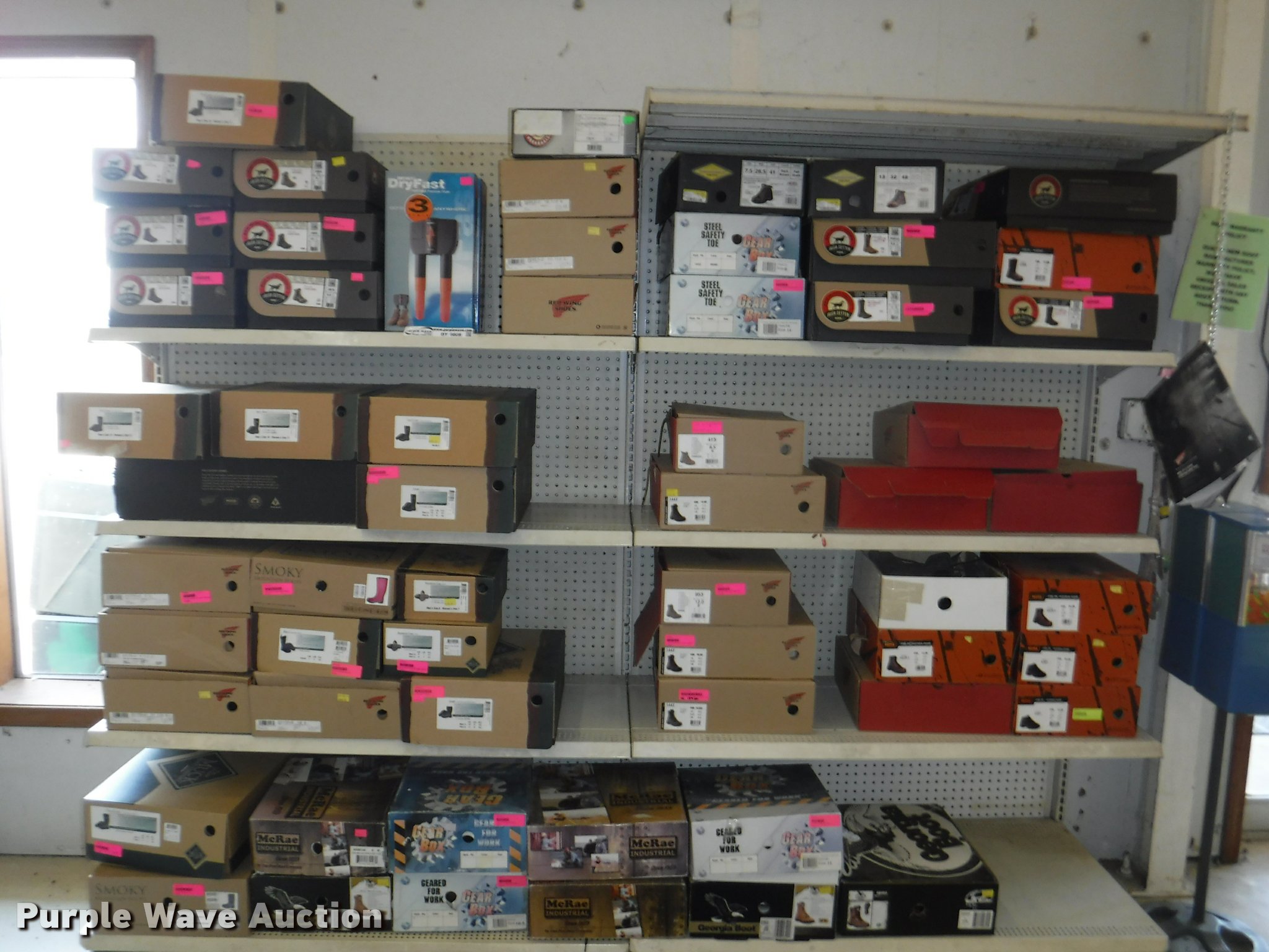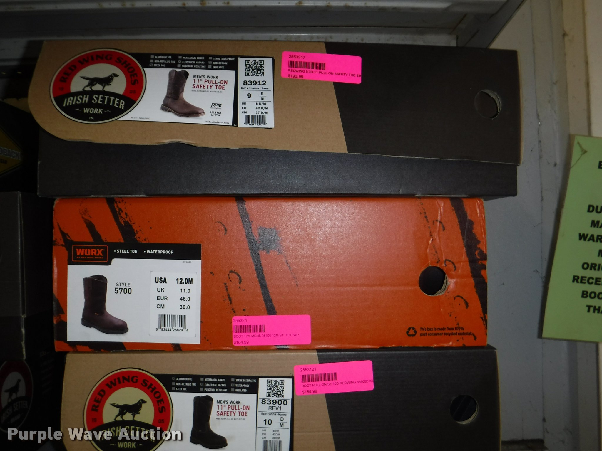 Purple Wave is selling a used All Other Household Items in Missouri. This item is a Work boots with the following: Red Wing Irish Setter Work, Pull on safety toe, Size 9, 10, 8.5, Soft toe, Size 10,, Irish Setter Hunt, Vaprtrek, (2) size 8, Size 10, 9.5, 8.5, 11, 10.5,, Super Sole, Size 10.5, 11.5, 9, Waterproof, Size 9, 11.5, 8.5, (4) size 9.5, (4) size 10, (4) size 12, Worx, Size 13, (2) size 12, (2) 9.5, Justin, Size 5, Diamond Back, Size 7.5, 13, Gear Box, Size 9, (2) size 11, (2) size 10.5, (6) Tack Classic, Size 10, 13 men, Size 11 women, Georgia, Size 12W, 8, McRae, Size 8, 7.5, 10.5, 13, Smoky Mountain rain boots, Size 10 women, All counts are approximate