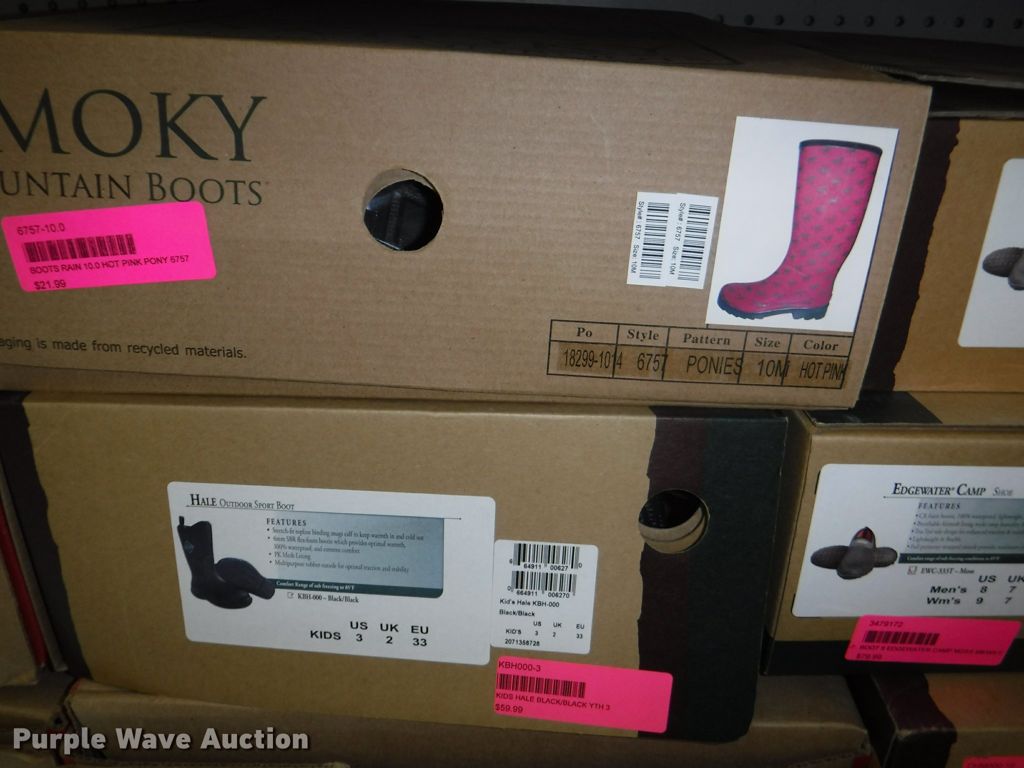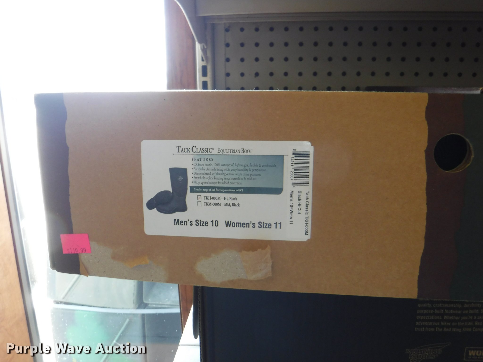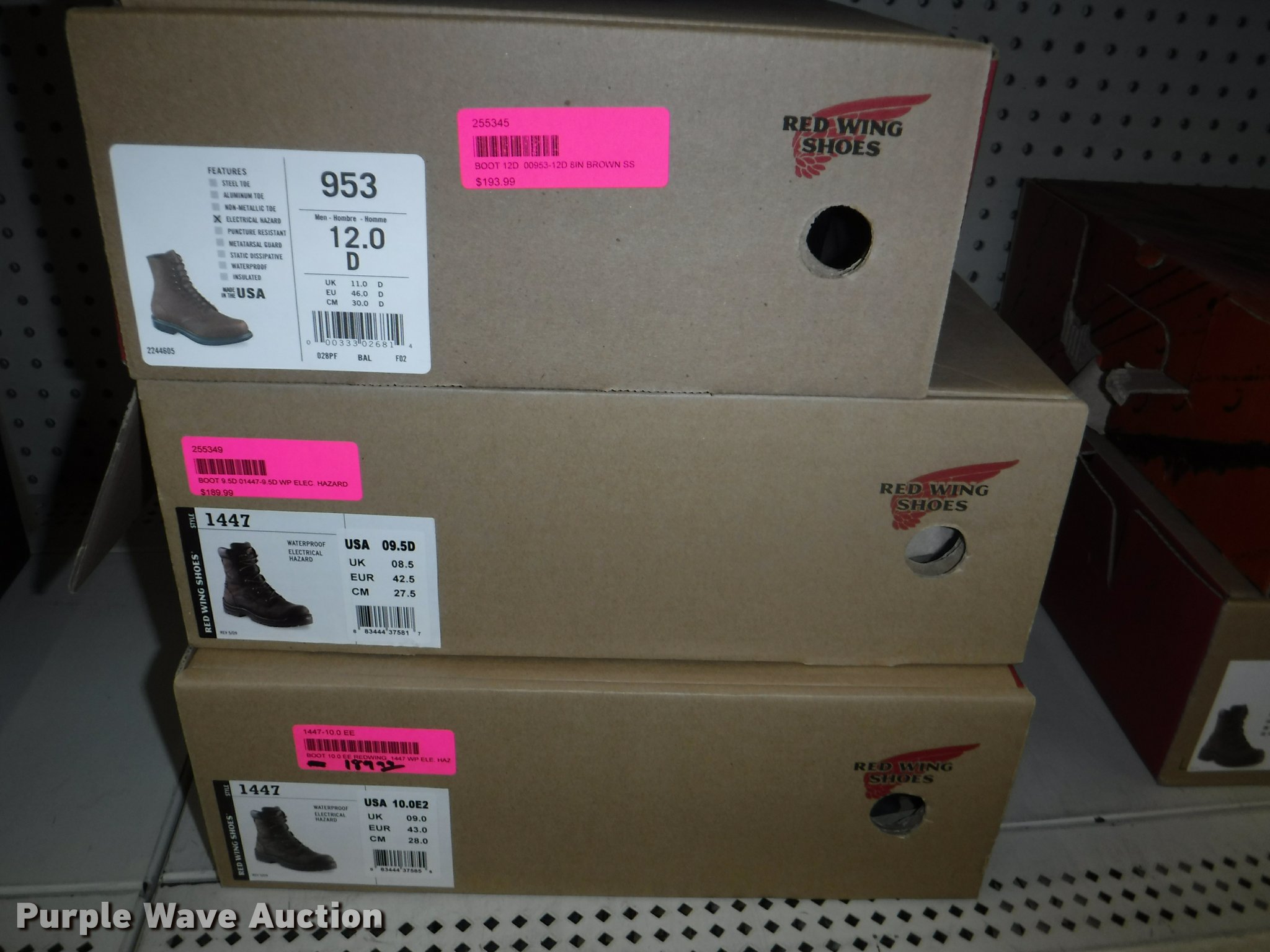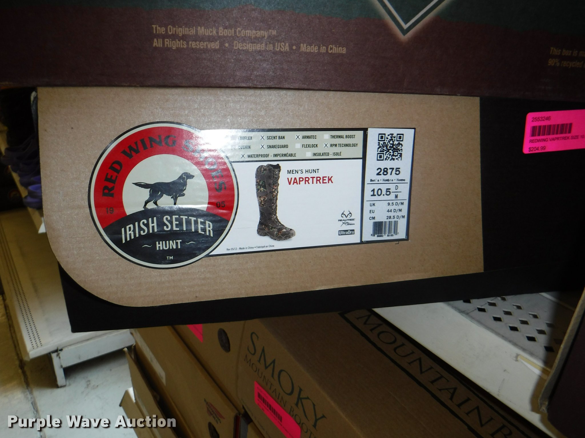 Purple Wave is selling a used All Other Household Items in Missouri. This item is a Work boots with the following: Red Wing Irish Setter Work, Pull on safety toe, Size 9, 10, 8.5, Soft toe, Size 10,, Irish Setter Hunt, Vaprtrek, (2) size 8, Size 10, 9.5, 8.5, 11, 10.5,, Super Sole, Size 10.5, 11.5, 9, Waterproof, Size 9, 11.5, 8.5, (4) size 9.5, (4) size 10, (4) size 12, Worx, Size 13, (2) size 12, (2) 9.5, Justin, Size 5, Diamond Back, Size 7.5, 13, Gear Box, Size 9, (2) size 11, (2) size 10.5, (6) Tack Classic, Size 10, 13 men, Size 11 women, Georgia, Size 12W, 8, McRae, Size 8, 7.5, 10.5, 13, Smoky Mountain rain boots, Size 10 women, All counts are approximate