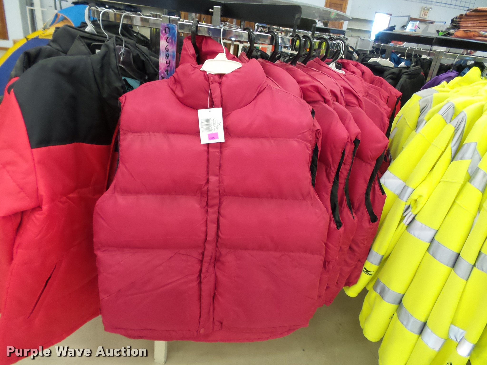 Purple Wave is selling a used All Other Household Items in Missouri. This item is a Vests, coats, and shirts with the following: Approx 12 down vests, Approx 160 coats, Approx 25 thermal T-shirts, Approx 25 T-shirts, Assorted sizes, Displays included