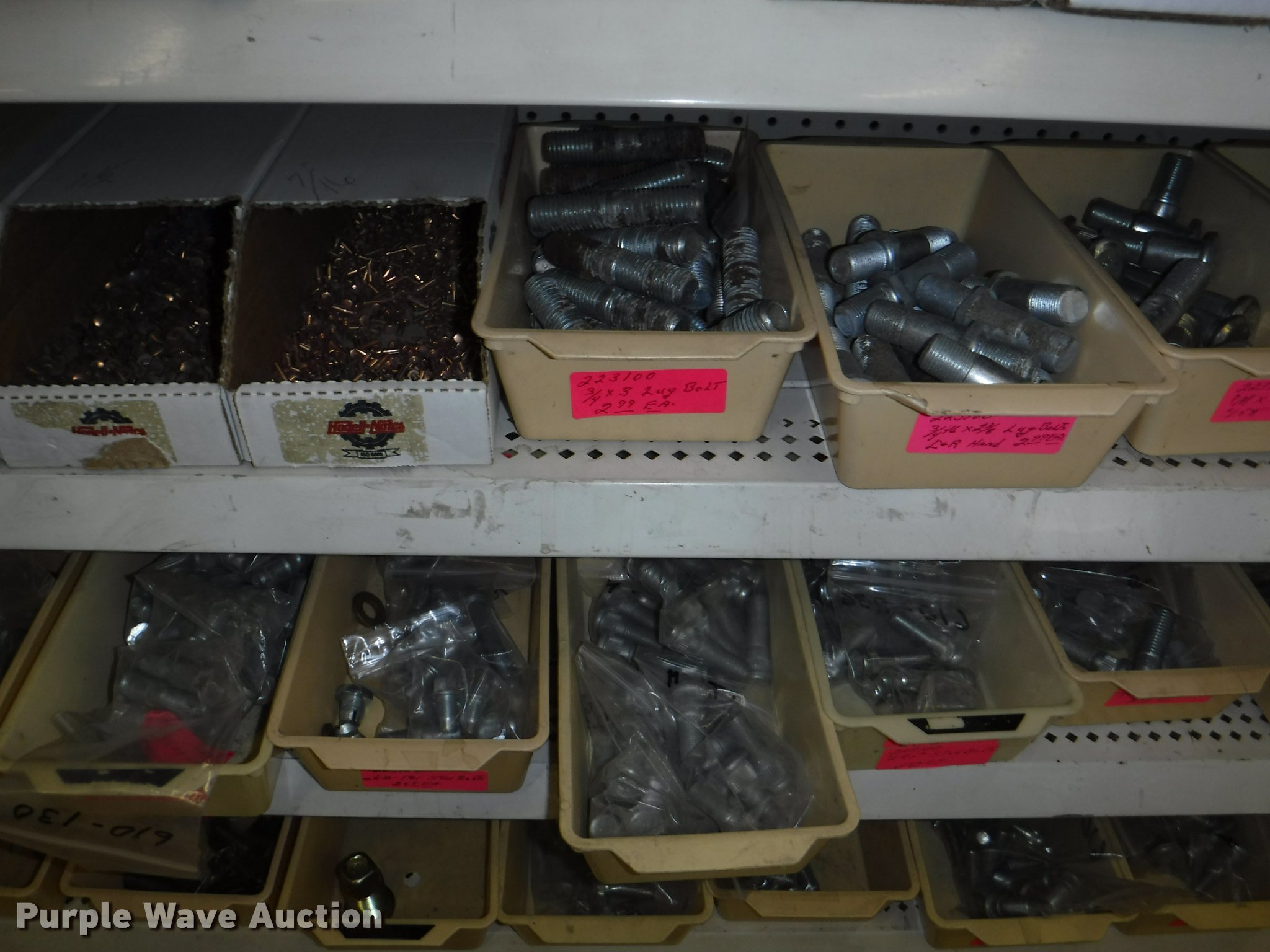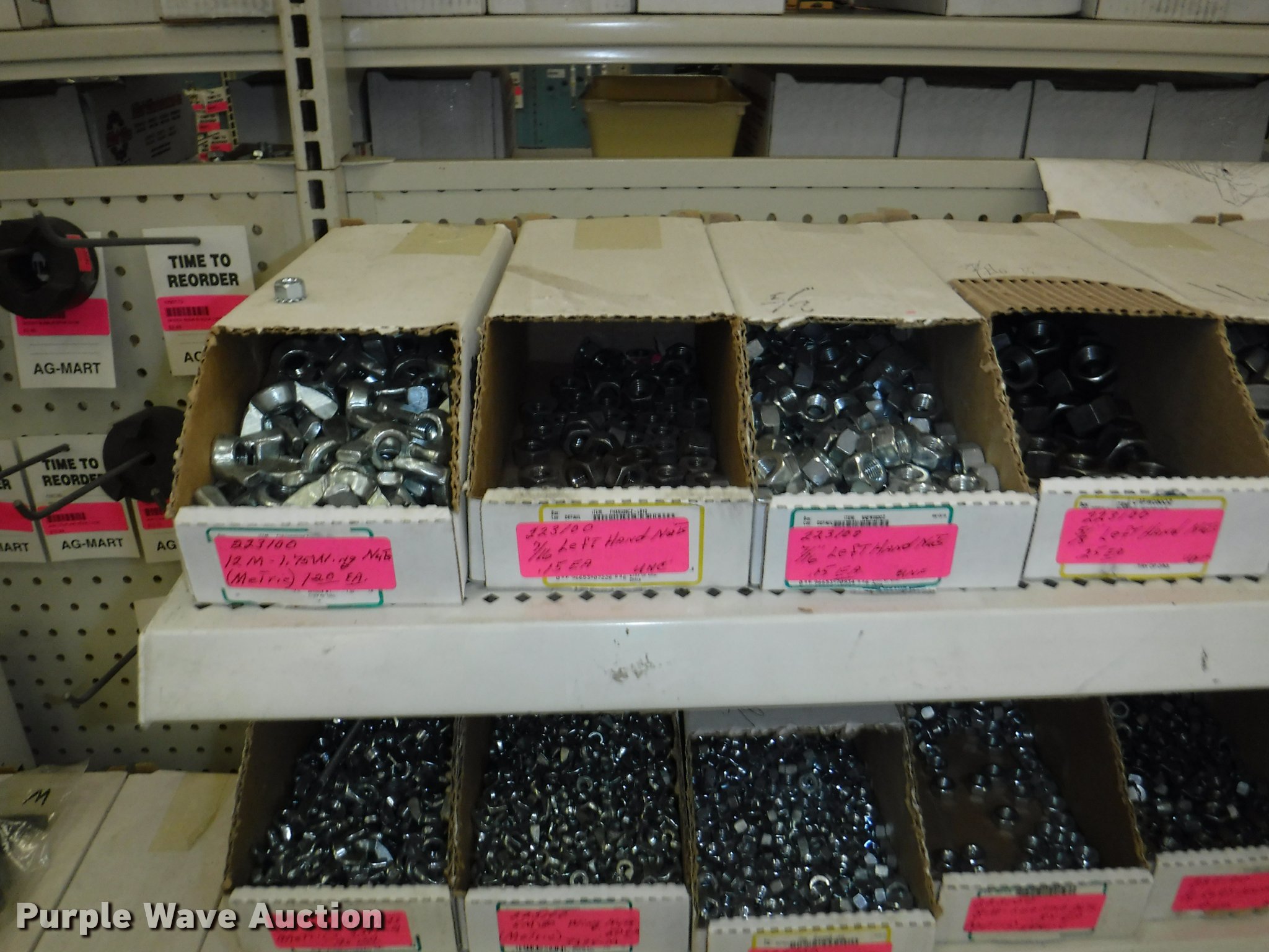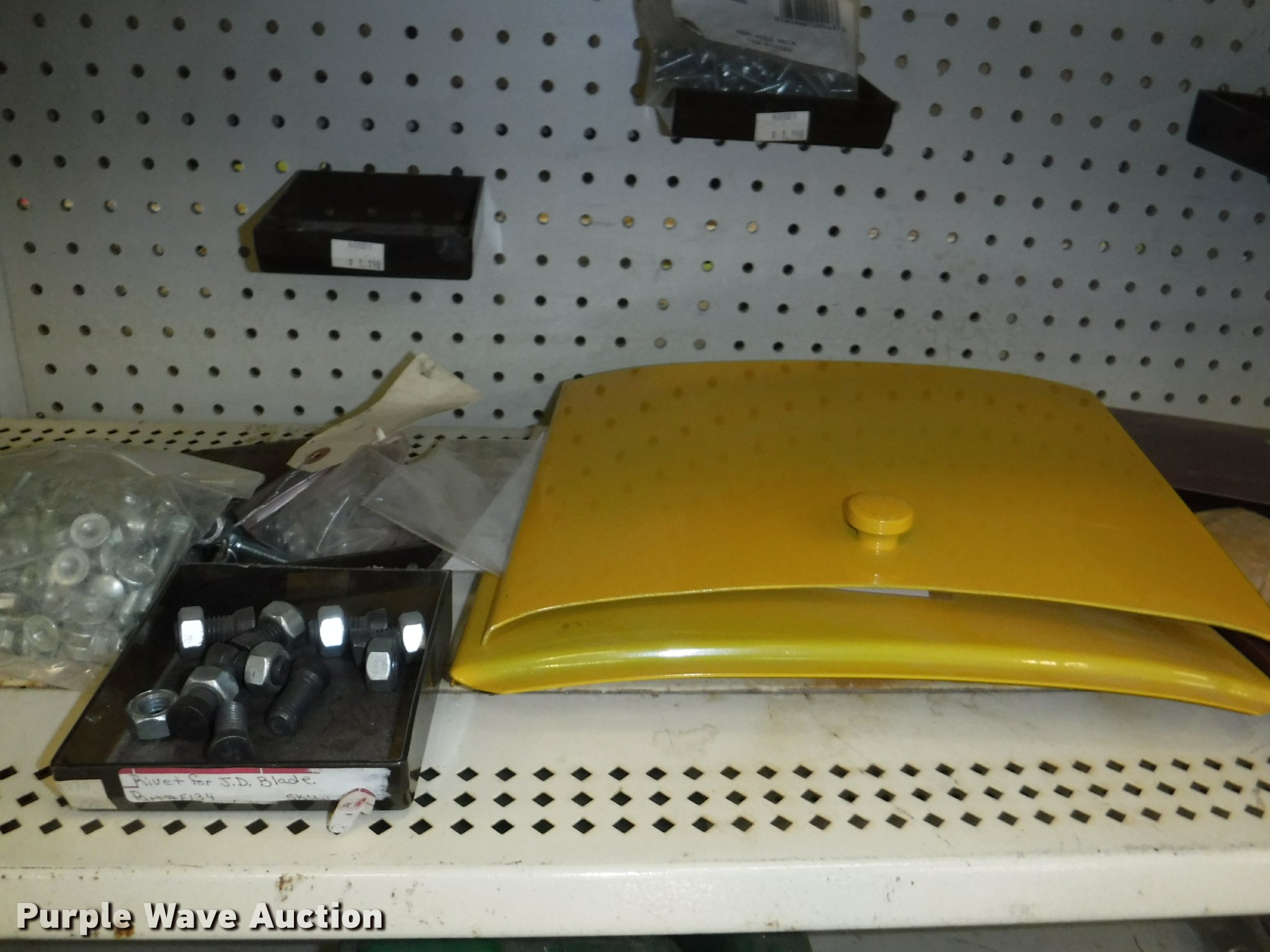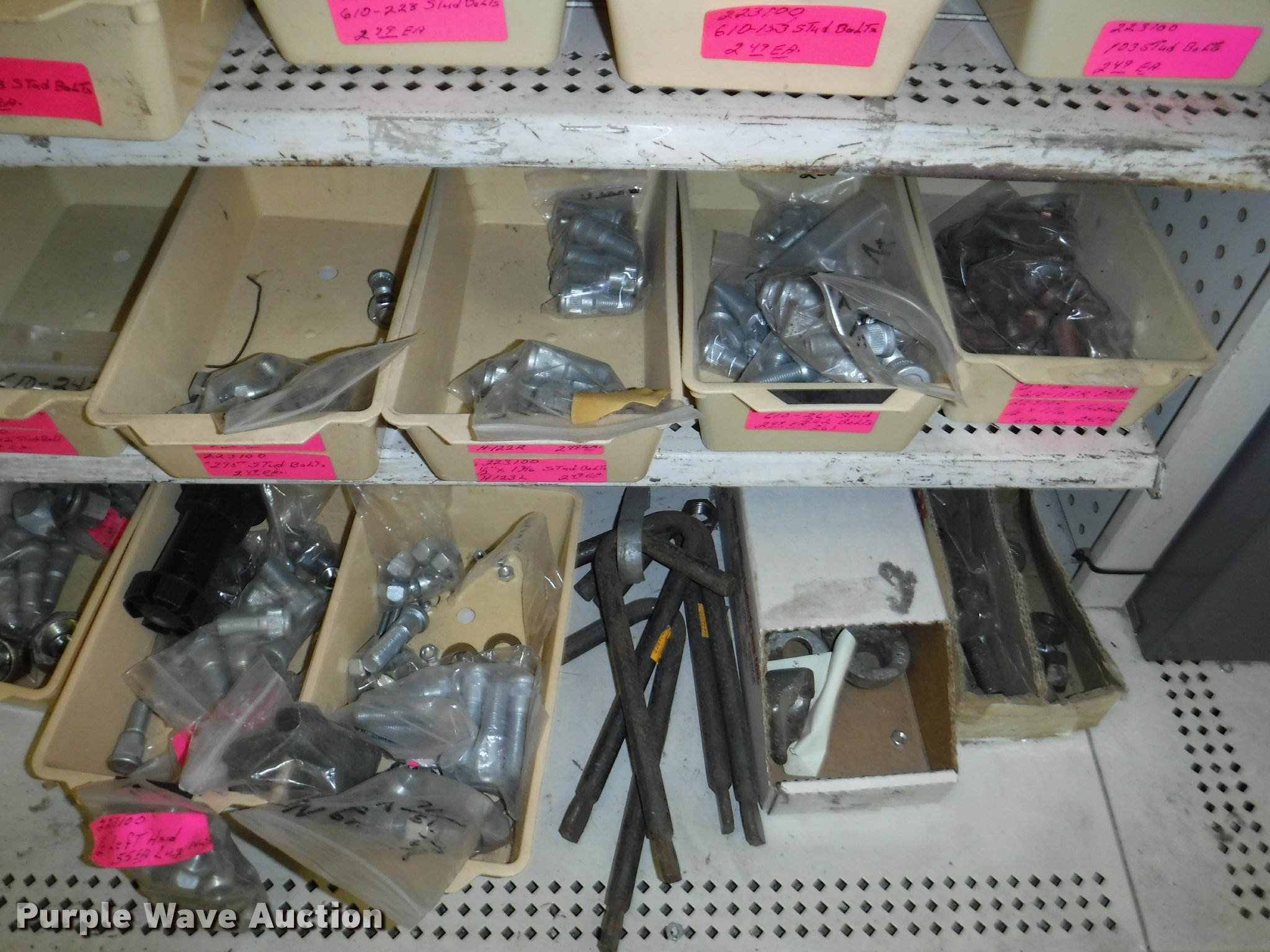 Purple Wave is selling a used Ag Equip. Other in Missouri. This item is a Ag equipment parts and hardware with the following: Nuts, Bolts, Screws, Planter talc, John Deere steering wheel, John Deere nose cone, John Deere grill plates, John Deere screen sides, Radiator, Massey grill screens, John Deere baler belts, (2) 525" x 7", (2) 531" x 7", Case baler belts, (3) 420.5" x 7", PTO covers, Gaskets, Manifolds, Fuel strainers, Cultivator shanks and shoes, Closing wheels, (7) boxes of Tuf-Cutter FS85-2 guards and more