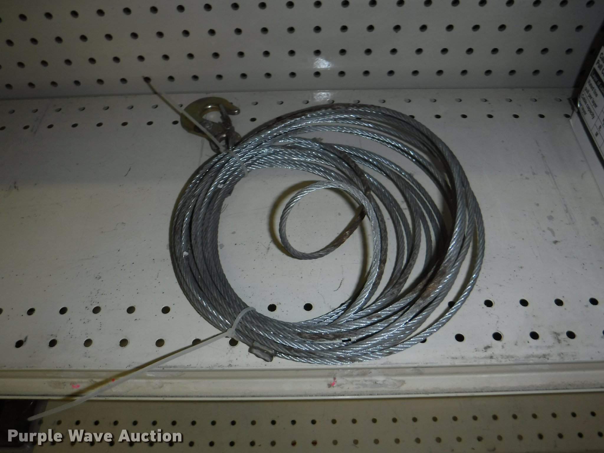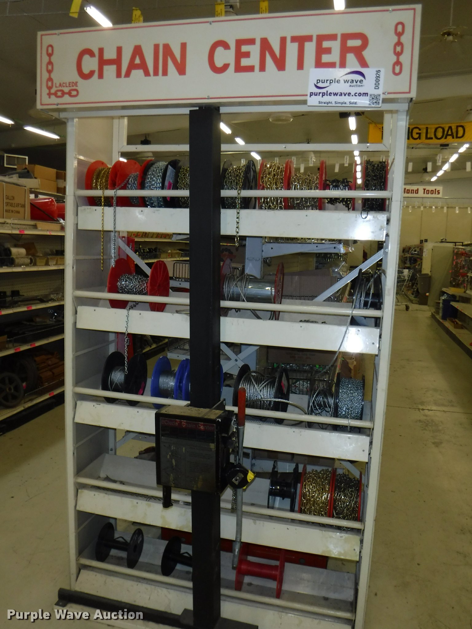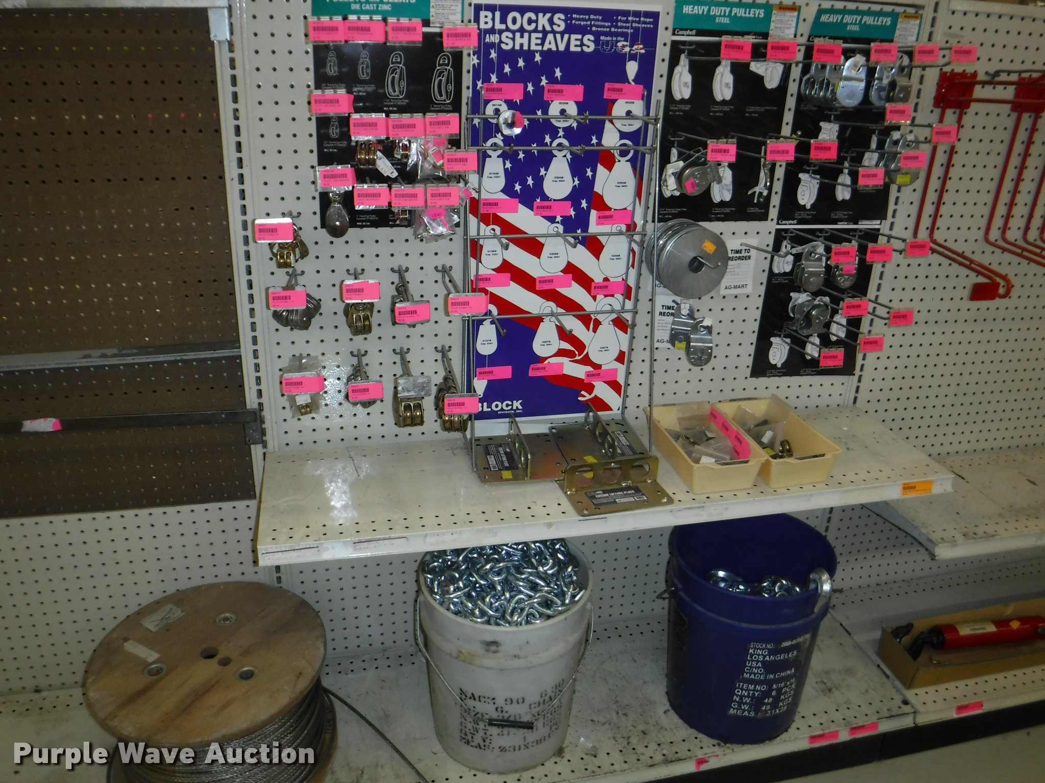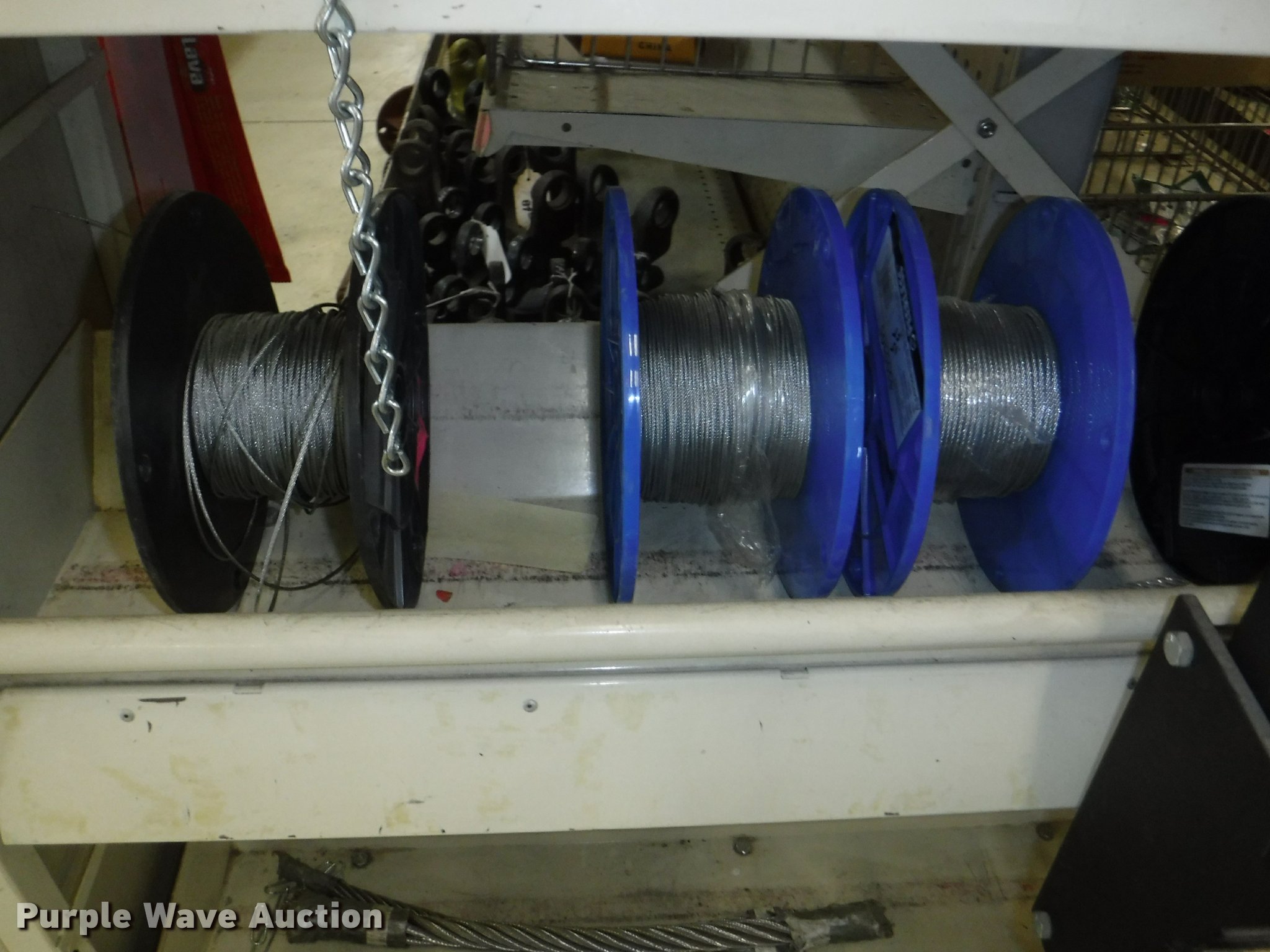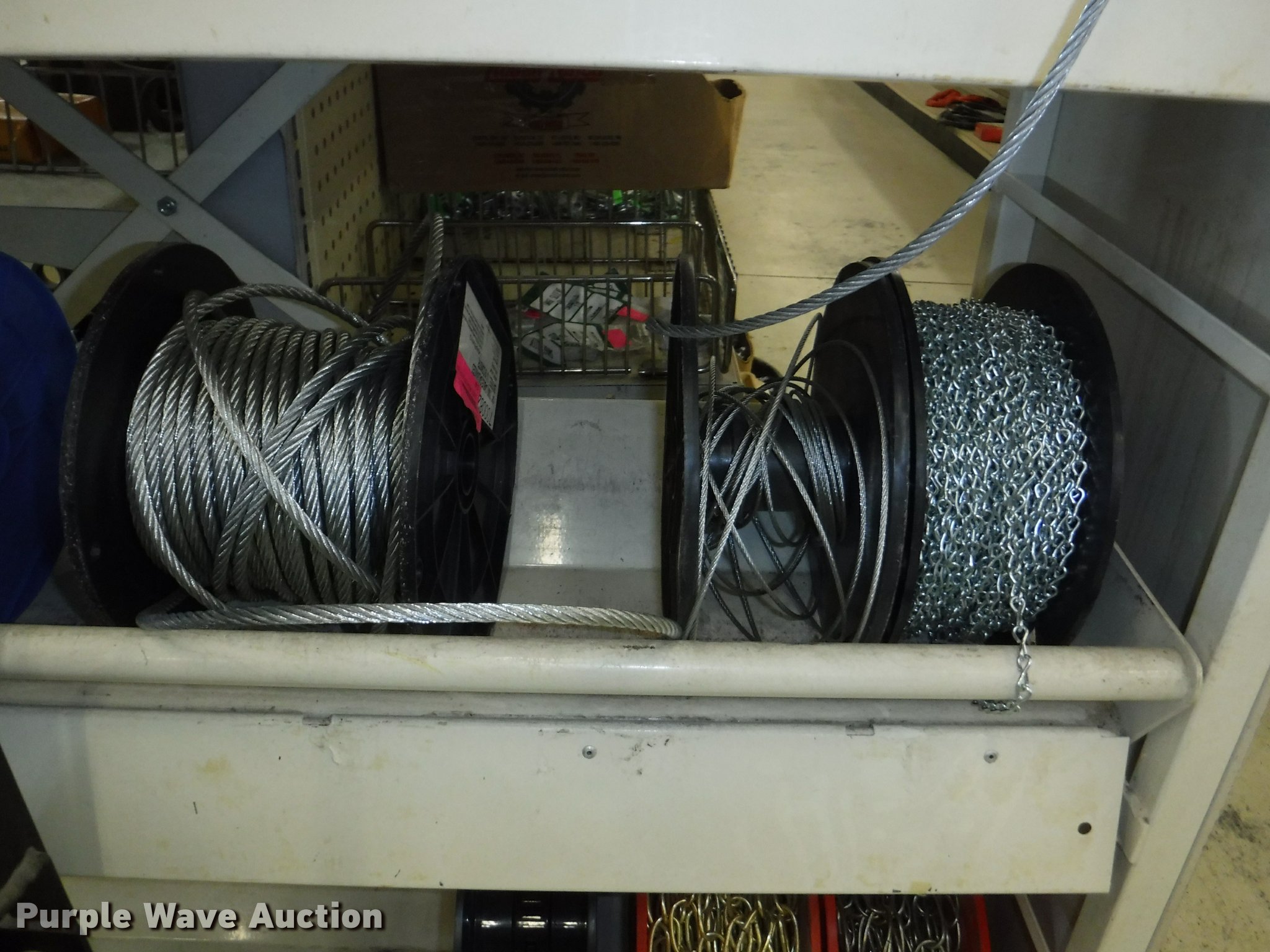 Purple Wave is selling a used Tools in Missouri. This item is a Hardware with the following: Safety chain, 1/4", 5'L, 4'L, 32"L, 12'L, 15'L, 3/16", 5'L, 3/8", 16'L, 5/16", 16'L,, Mini booms, S-hooks, Wire/rope thimbles and clips, Welded rings and swivels, Quick links, Slip hooks, Shackles, Eye hooks, Grab hooks, Cotter pins, Double clevis hooks, (3) 165' x 1" pp strapping, Tie down straps, Load strap, Pulleys, Cleats, Wood Power 2000 winch, Super Winch receiver hitches, Cable locks, Pit Bull 20 to 45" support rod, Grip two ton hand puller, Air suspension pod, 10 ton winch cylinder, 1/4" and 5/16" cable spools, (5) rolls of assorted cable, Decorative chain and cable with display and LaClede cutter and more