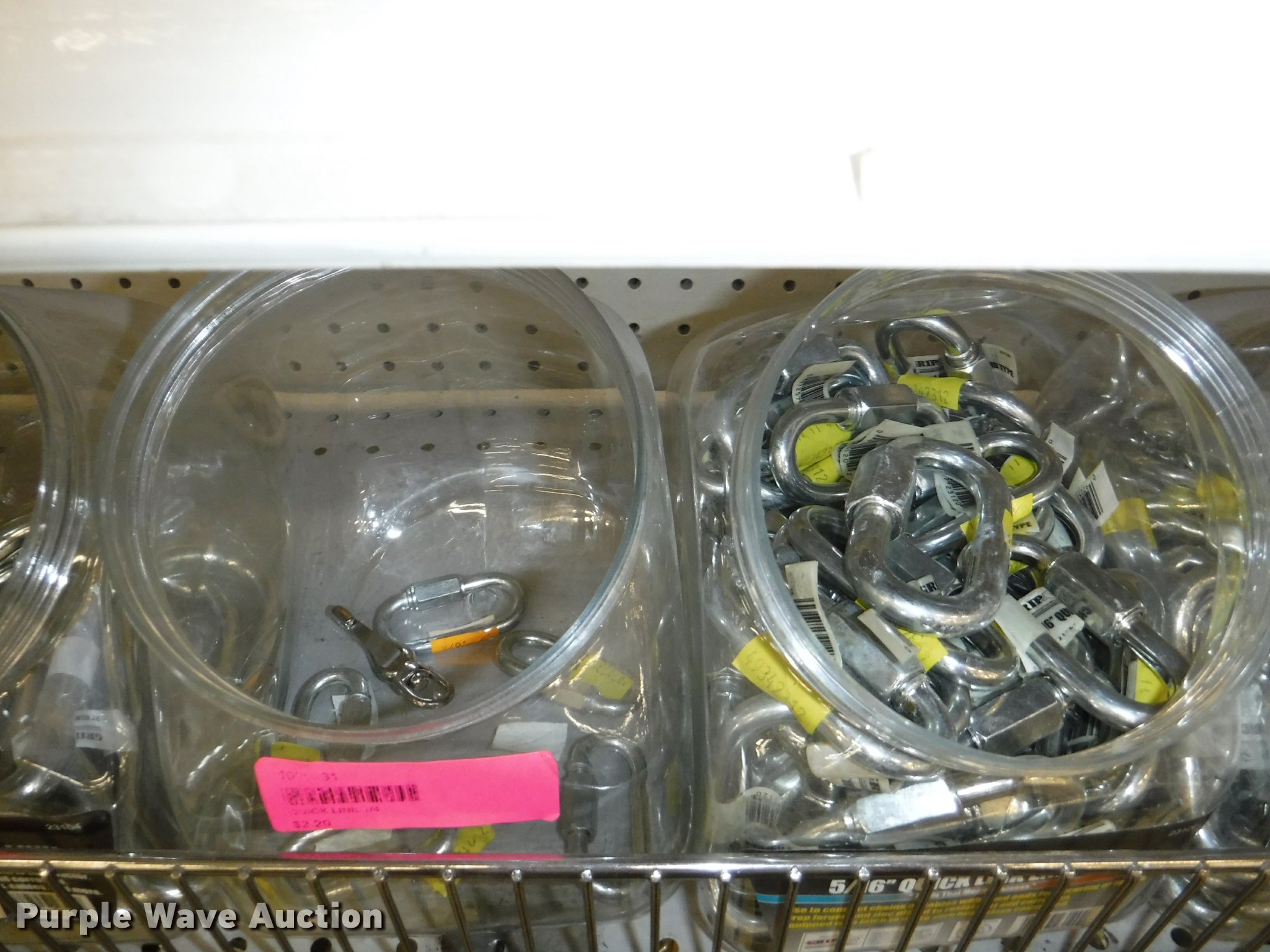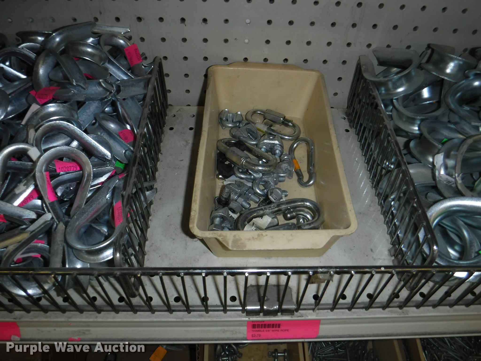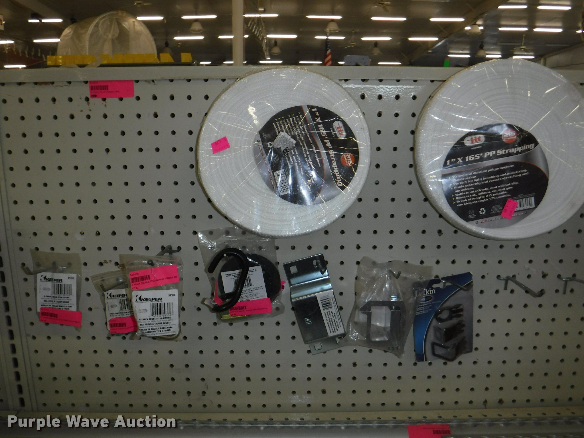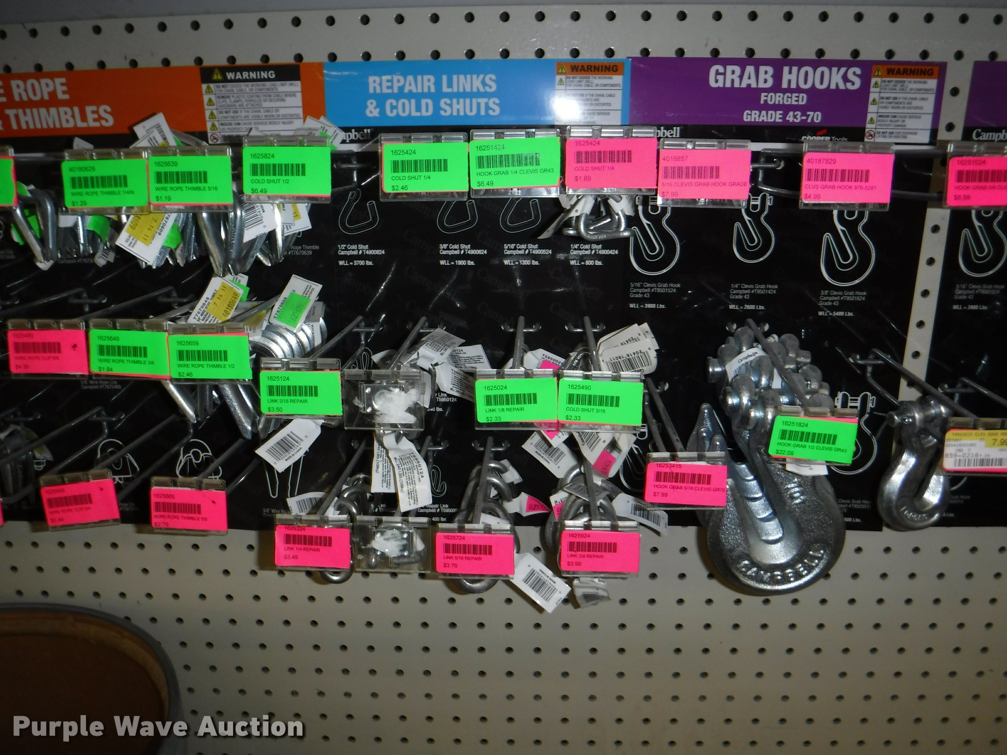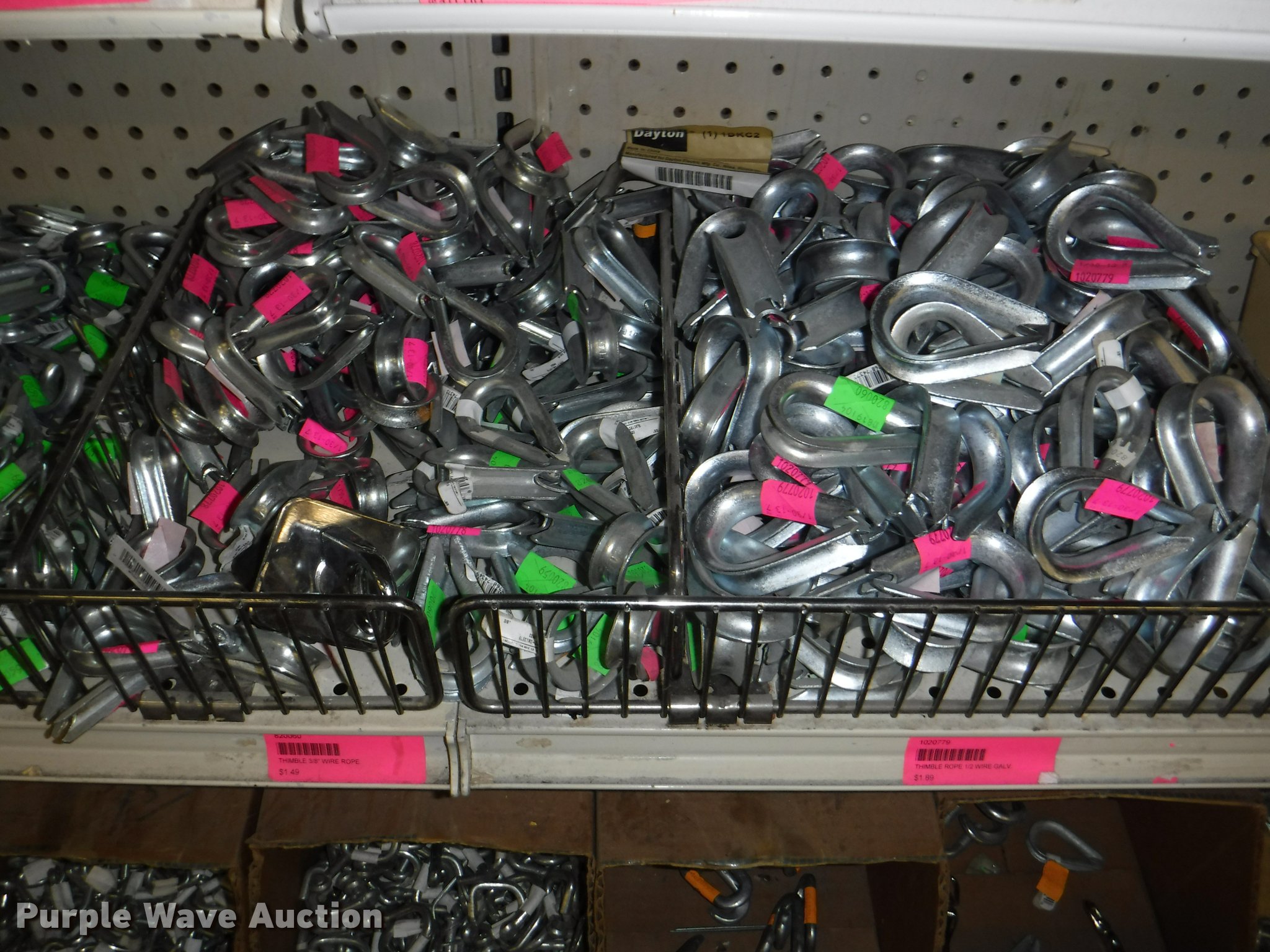 Purple Wave is selling a used Tools in Missouri. This item is a Hardware with the following: Safety chain, 1/4", 5'L, 4'L, 32"L, 12'L, 15'L, 3/16", 5'L, 3/8", 16'L, 5/16", 16'L,, Mini booms, S-hooks, Wire/rope thimbles and clips, Welded rings and swivels, Quick links, Slip hooks, Shackles, Eye hooks, Grab hooks, Cotter pins, Double clevis hooks, (3) 165' x 1" pp strapping, Tie down straps, Load strap, Pulleys, Cleats, Wood Power 2000 winch, Super Winch receiver hitches, Cable locks, Pit Bull 20 to 45" support rod, Grip two ton hand puller, Air suspension pod, 10 ton winch cylinder, 1/4" and 5/16" cable spools, (5) rolls of assorted cable, Decorative chain and cable with display and LaClede cutter and more
