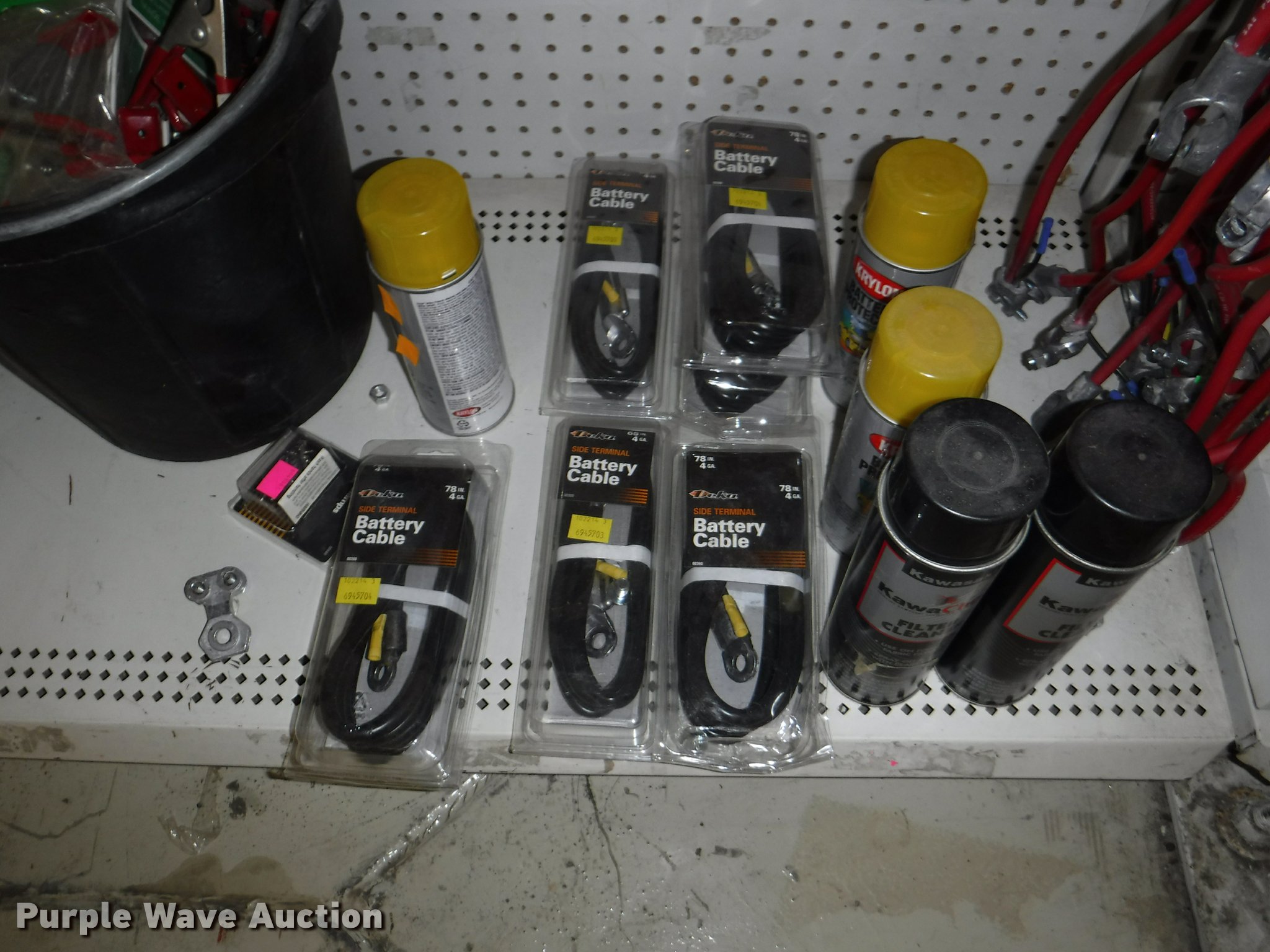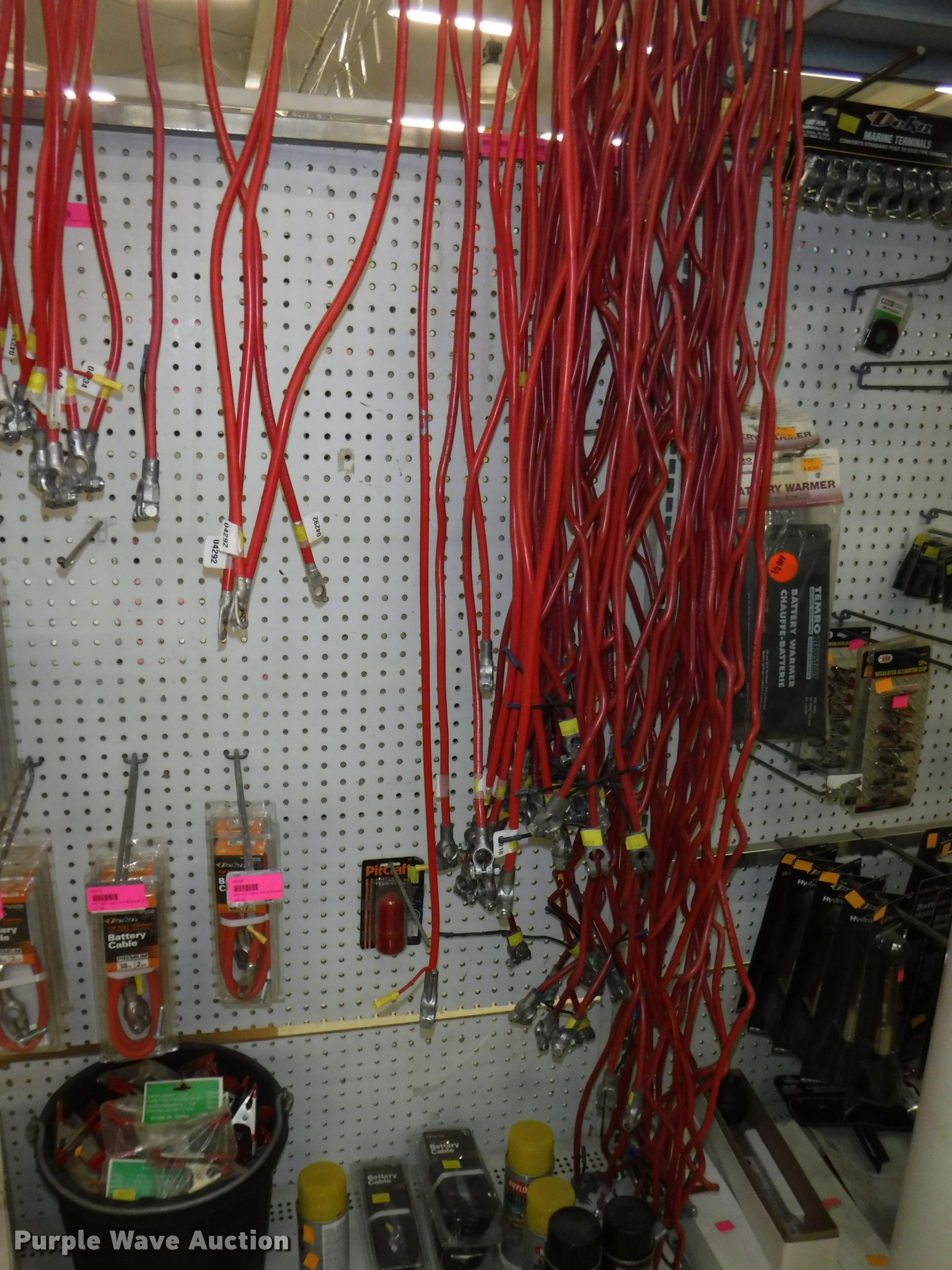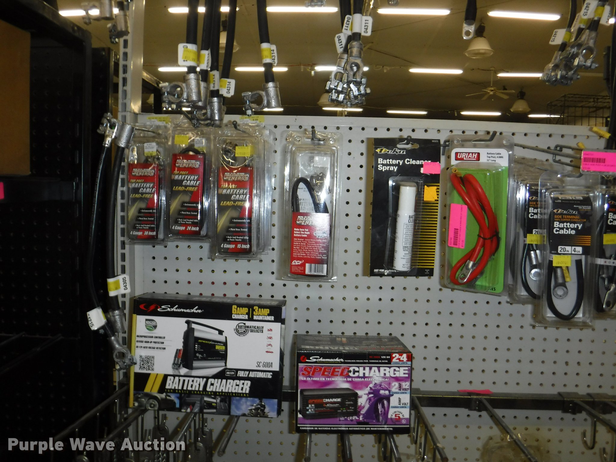 Purple Wave is selling a used Tools in Missouri. This item is a Battery center accessories with the following: (25) batteries, Motorcycle, Vehicle, Tractor, (2) battery chargers, 2 to 4 amp, 6 amp, Approx. 2,478 battery cables, Battery post cleaner tools, Post protectors and kits, Posts, Adapters, Lugs, Clamps, Terminals, Schummacher 10/30/200 amp charger