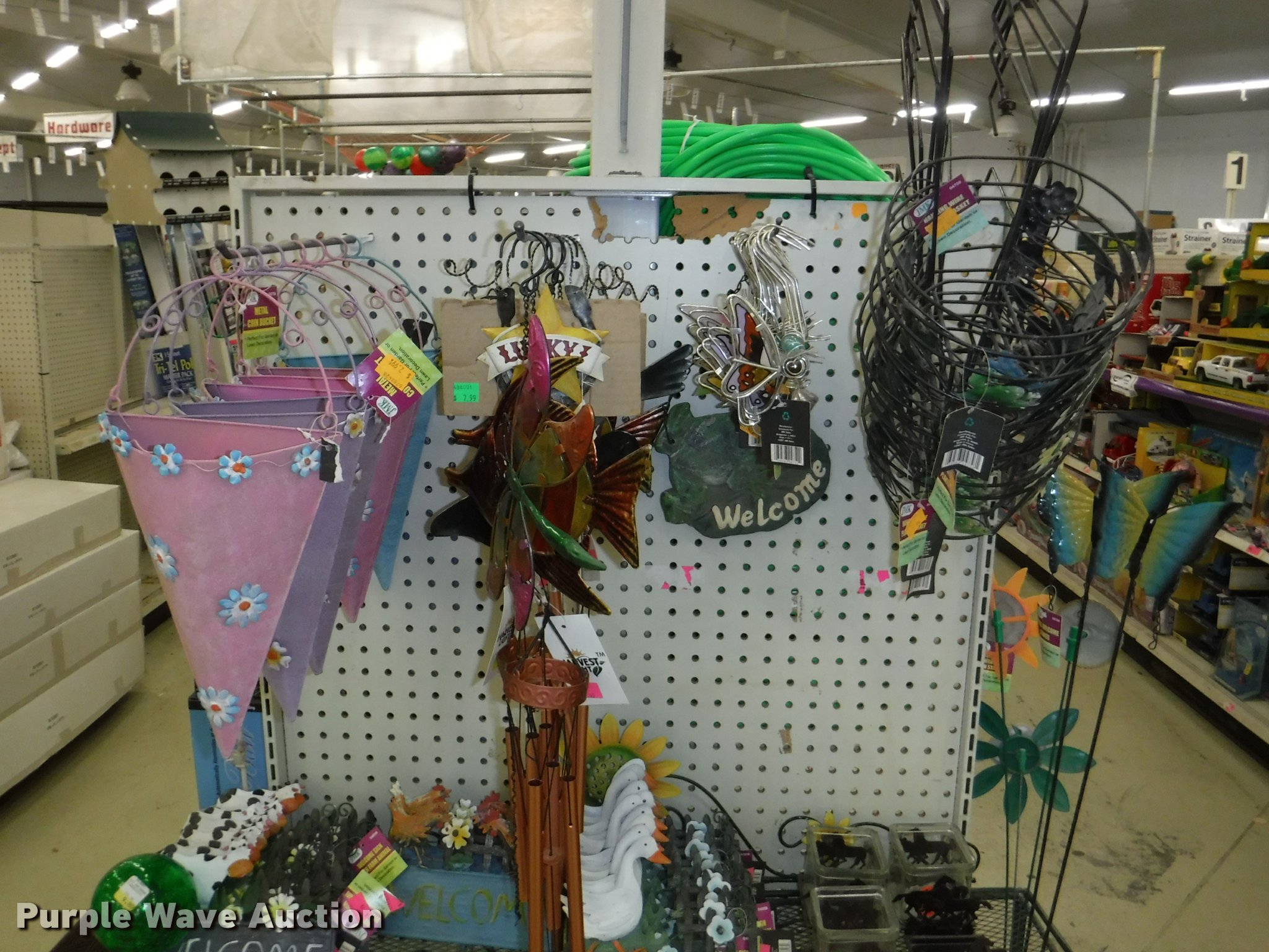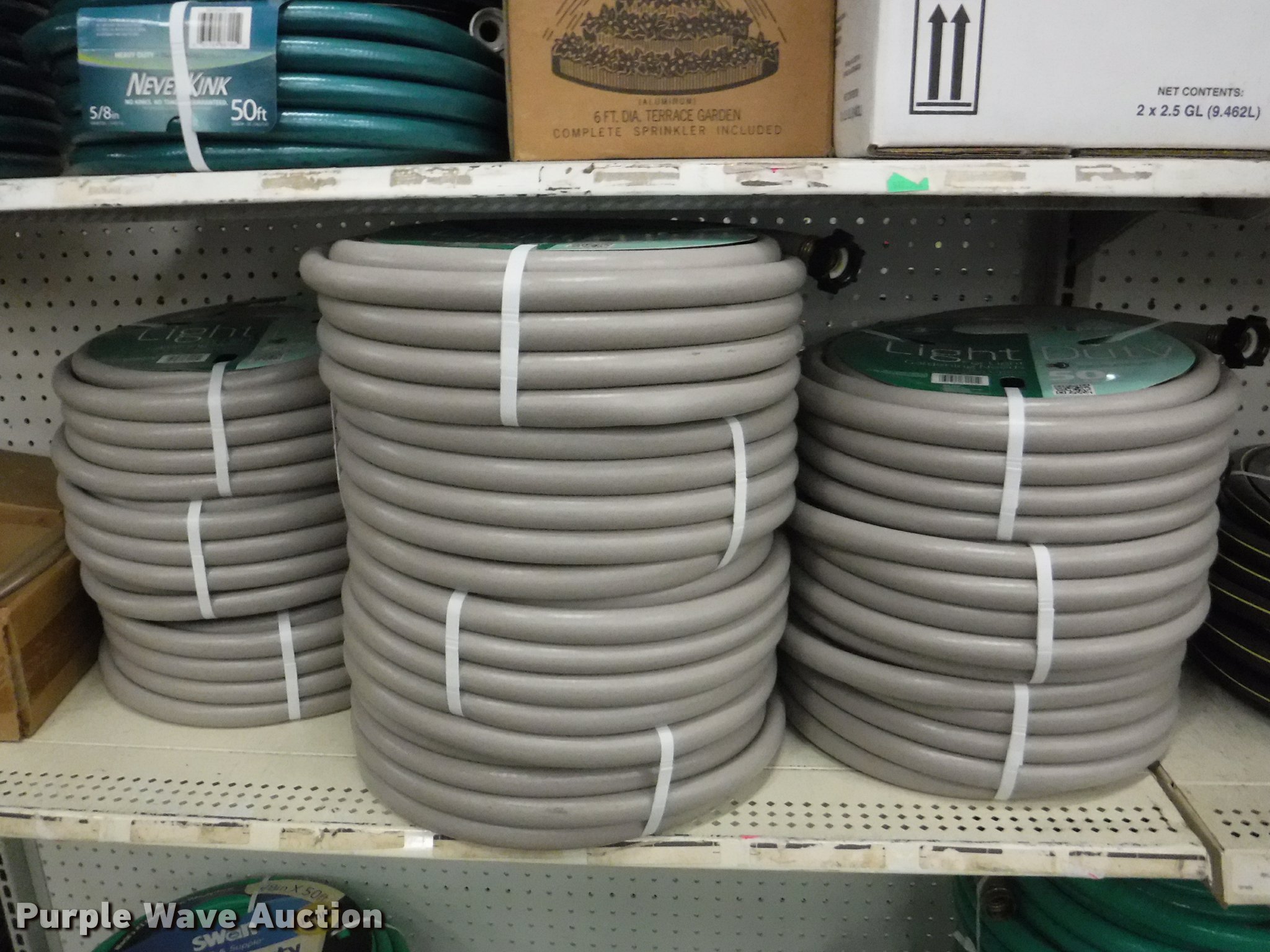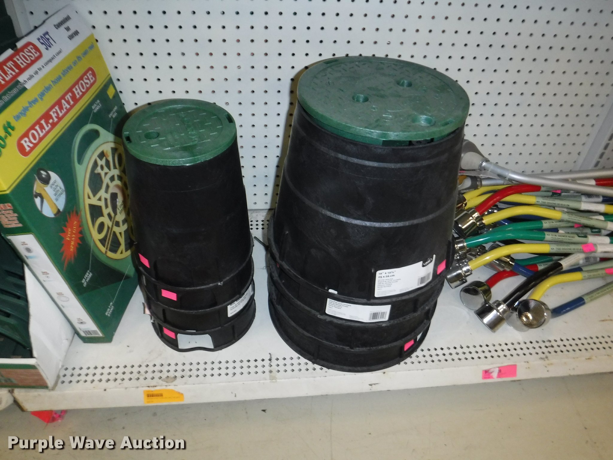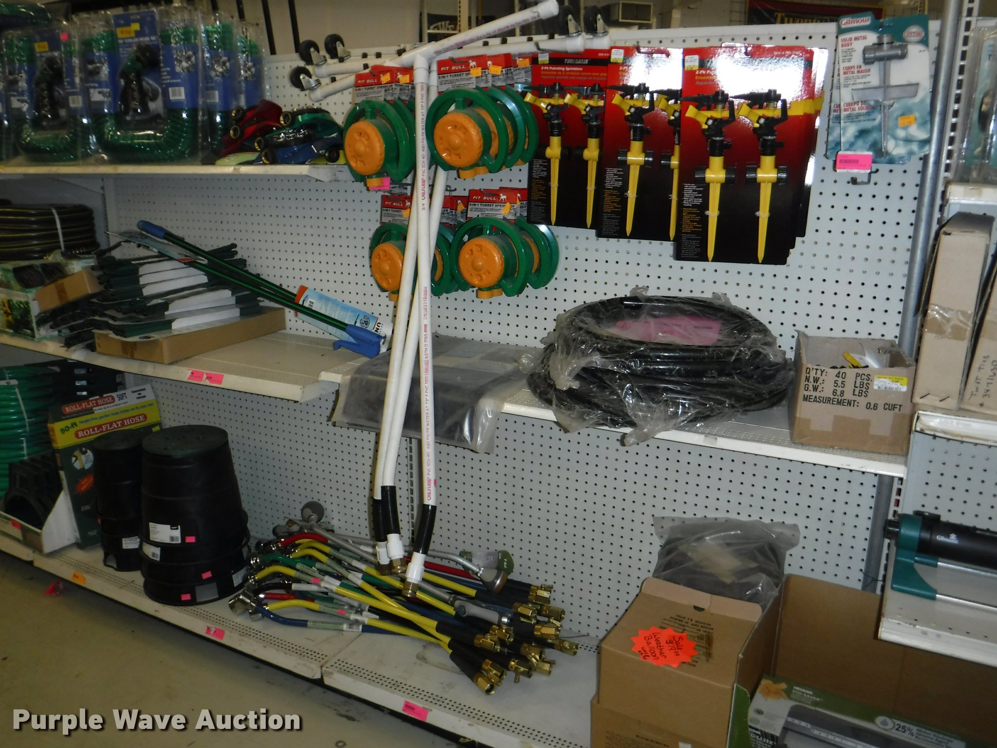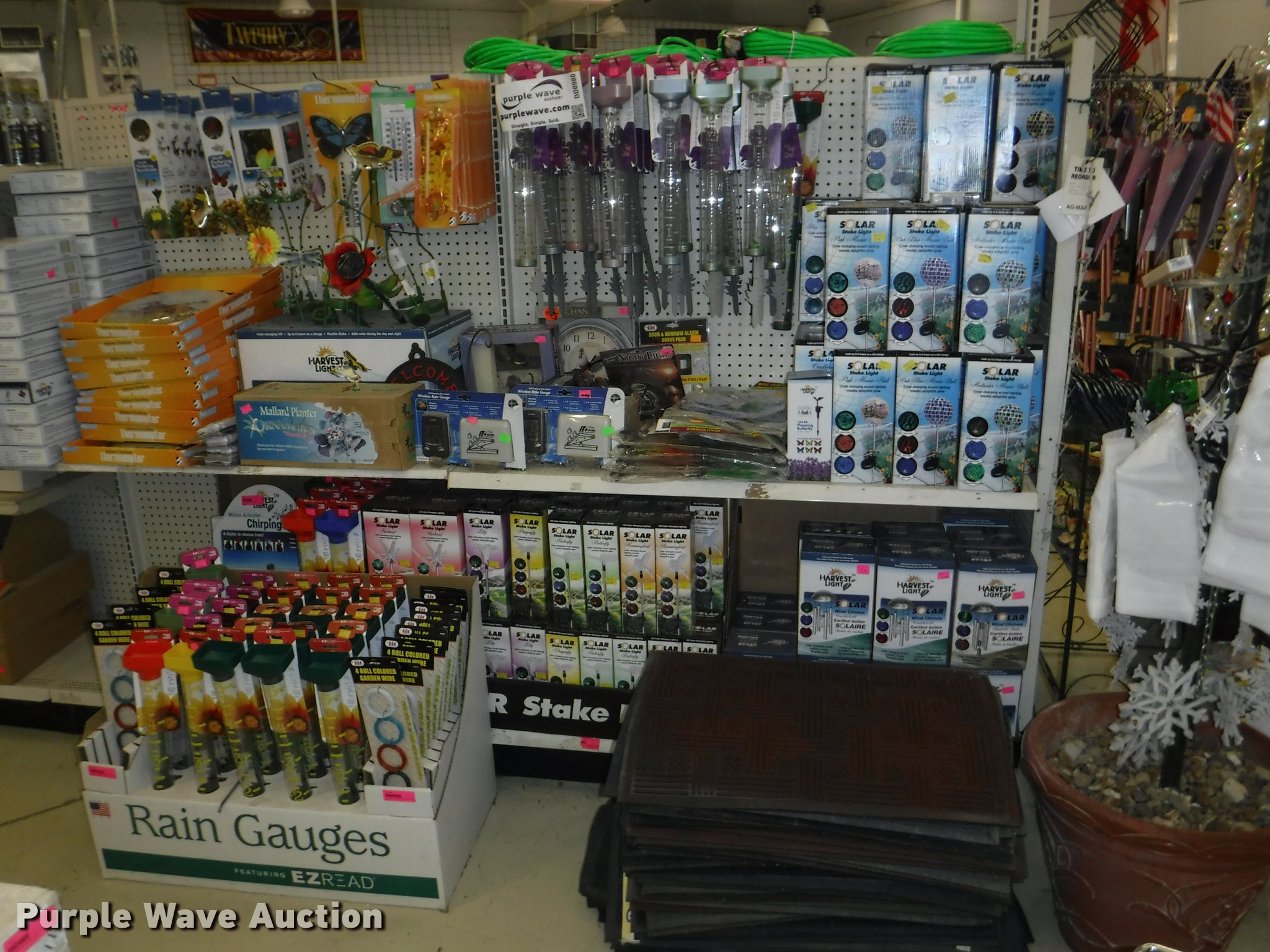 Purple Wave is selling a used Lawn and Garden in Missouri. This item is a Lawn and garden accessories with the following: Solar stake globes and lights, Door mats, Rain gauges, Thermometers, Wind chimes, Irrigation parts, Hose couplers and connectors, Sprinklers, Hose wands, Trash grabbers, 50' hose sets, Hose hangers, (25) water hoses, Pond filter, Greenhouse, Needs to be disassembled, Pond chemicals, (16) greenhouses in boxes, One display model