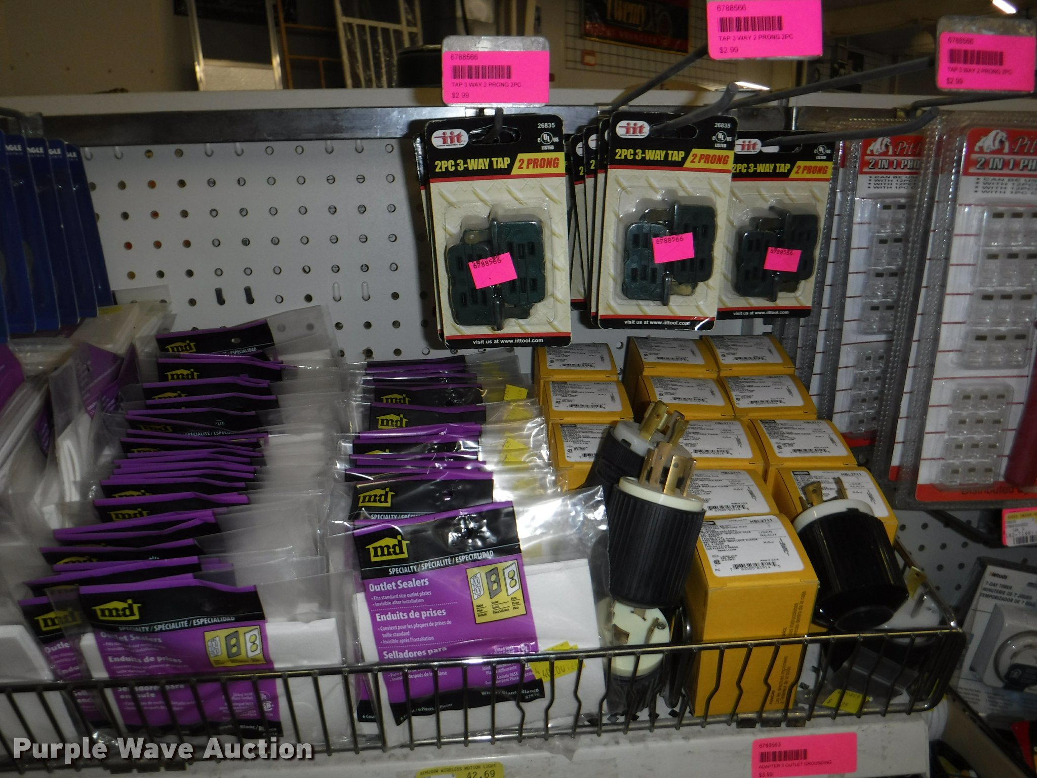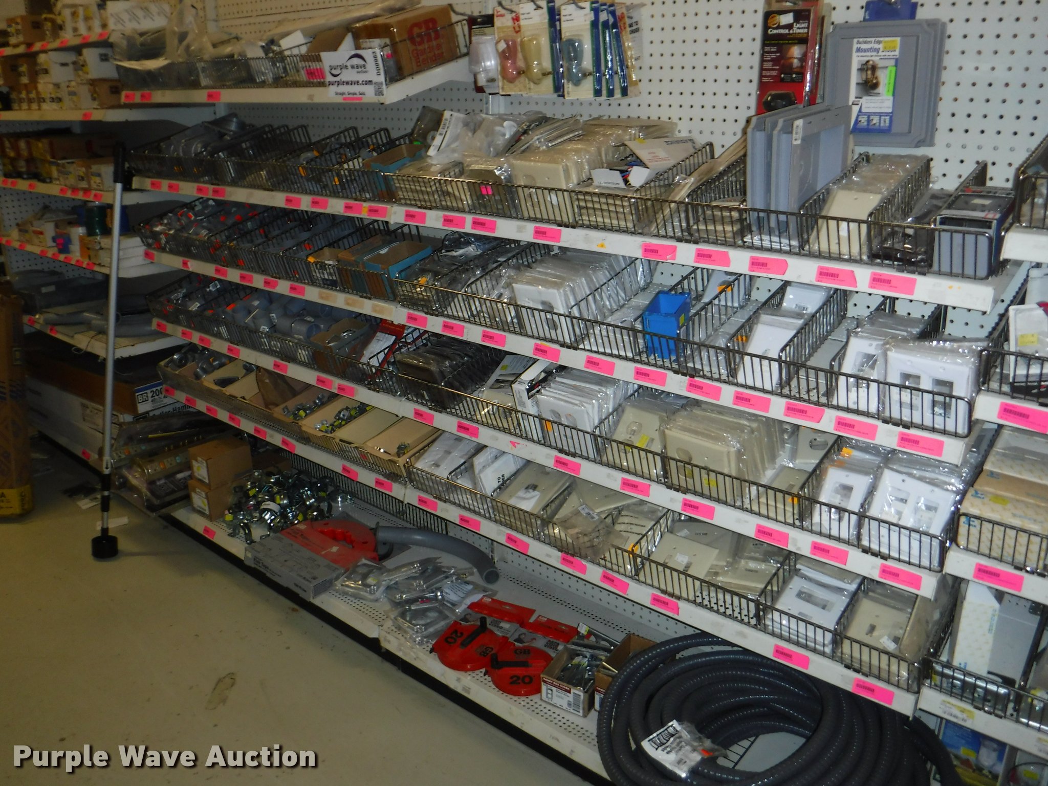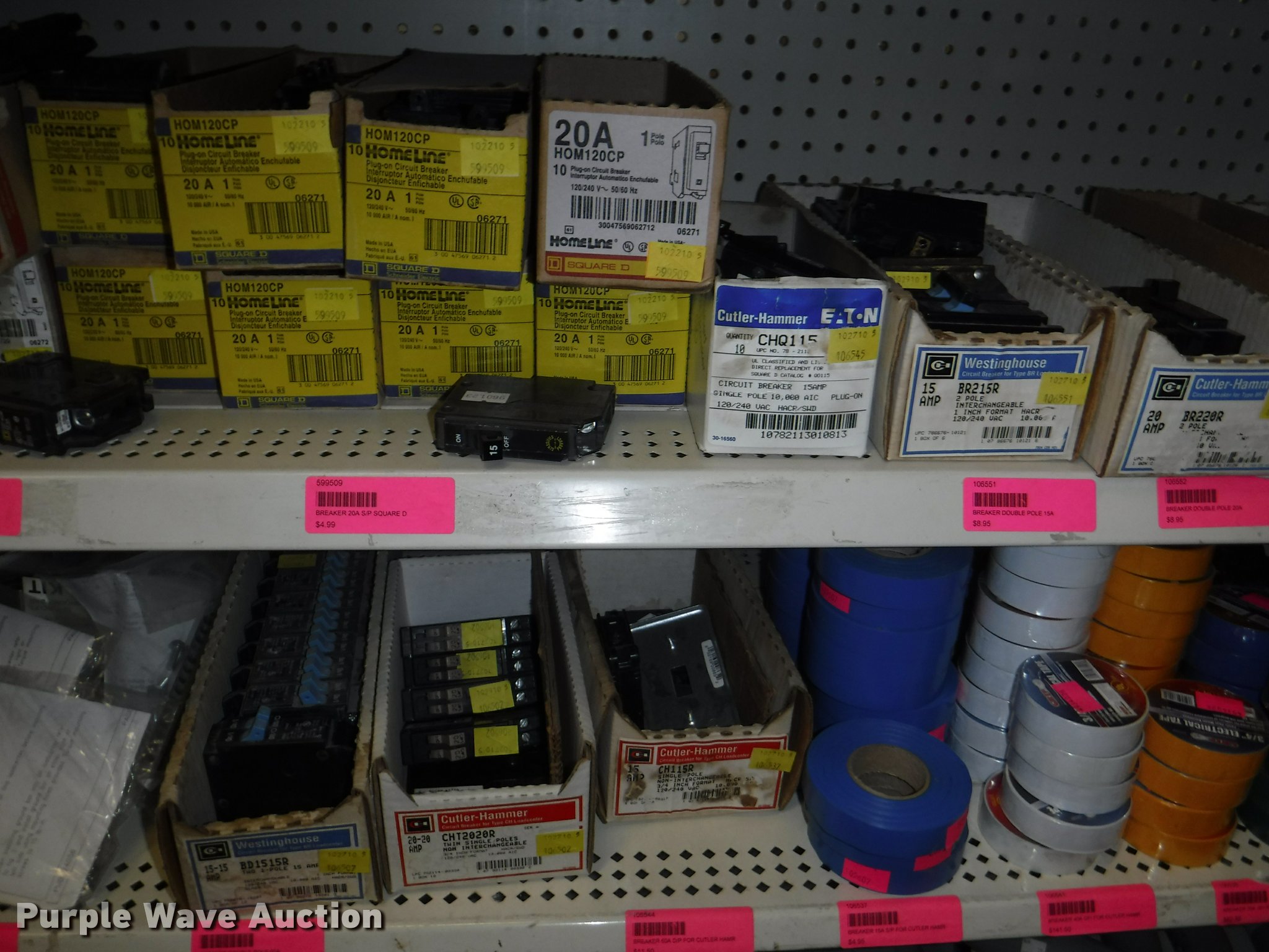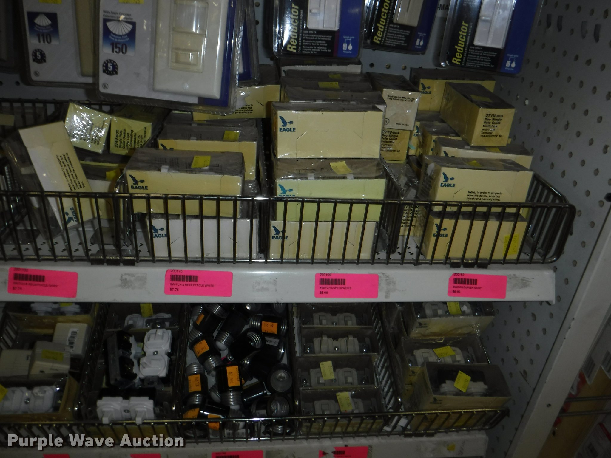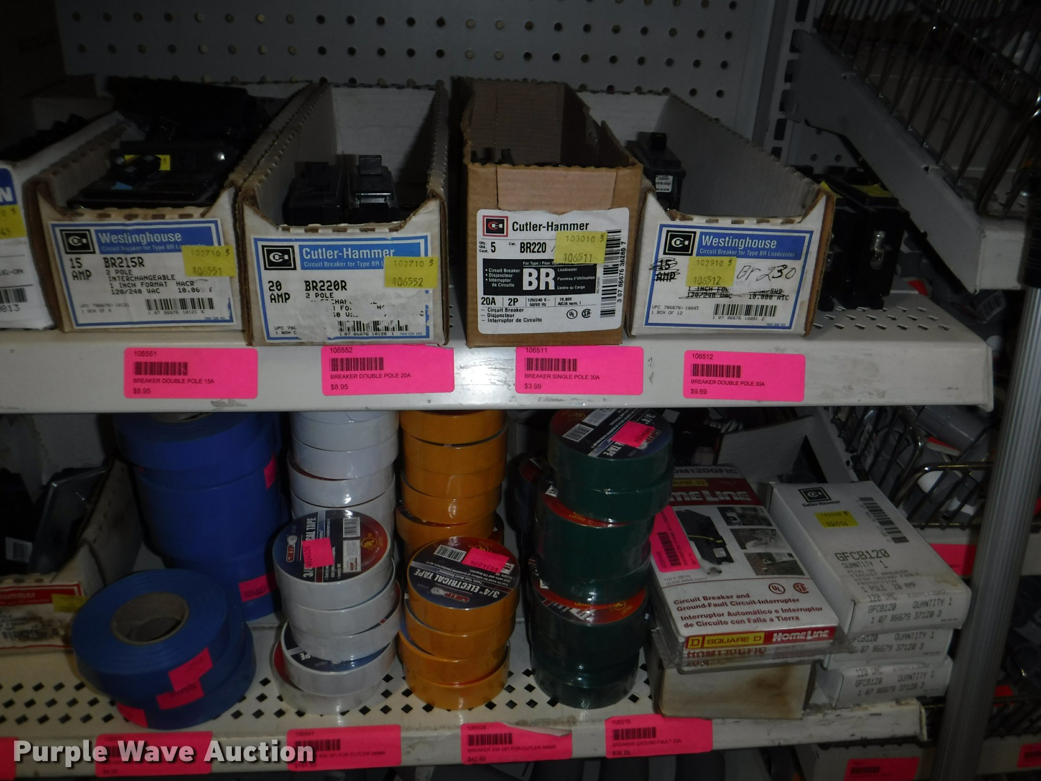 Purple Wave is selling a used Building Materials in Missouri. This item is a Electrical supplies with the following: Wiring with display rack, (8) breaker boxes, Electrical tape, Circuit breakers, Brackets, Conduit and adapters, Fish tape, Cable snakes, Night lights, Outlet/switch covers, Outlet sealers, Plug ends, Light bulb sockets, Dimmers/switches, Fuses, Crimping sets, Wire connectors and more