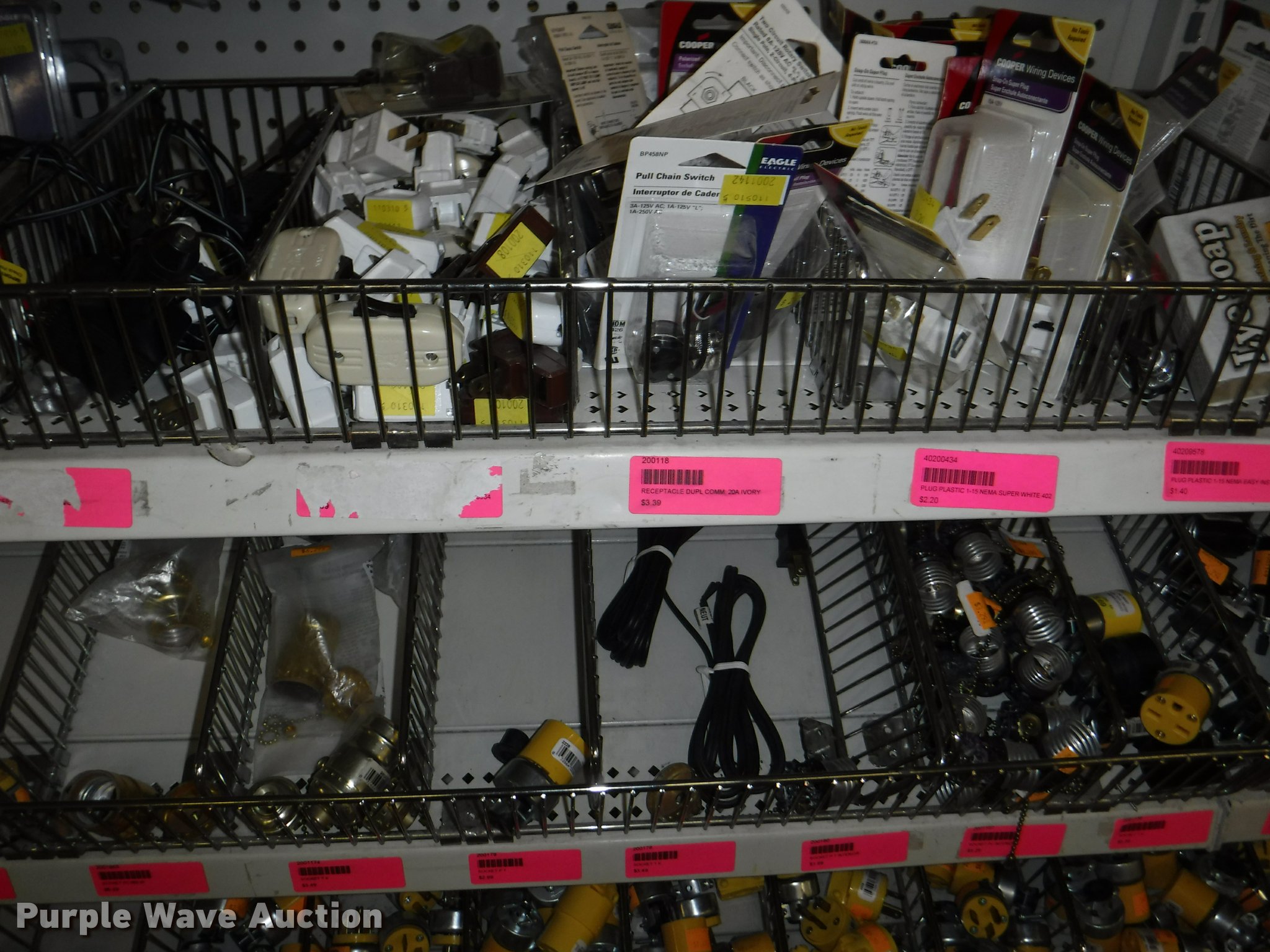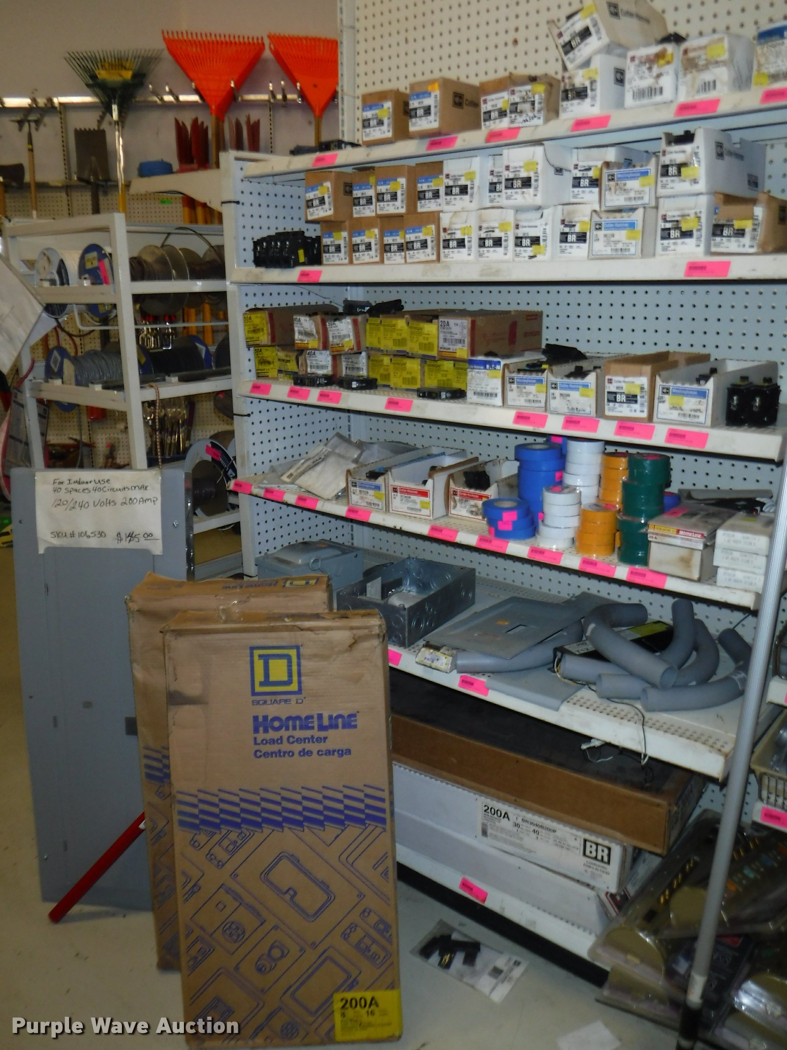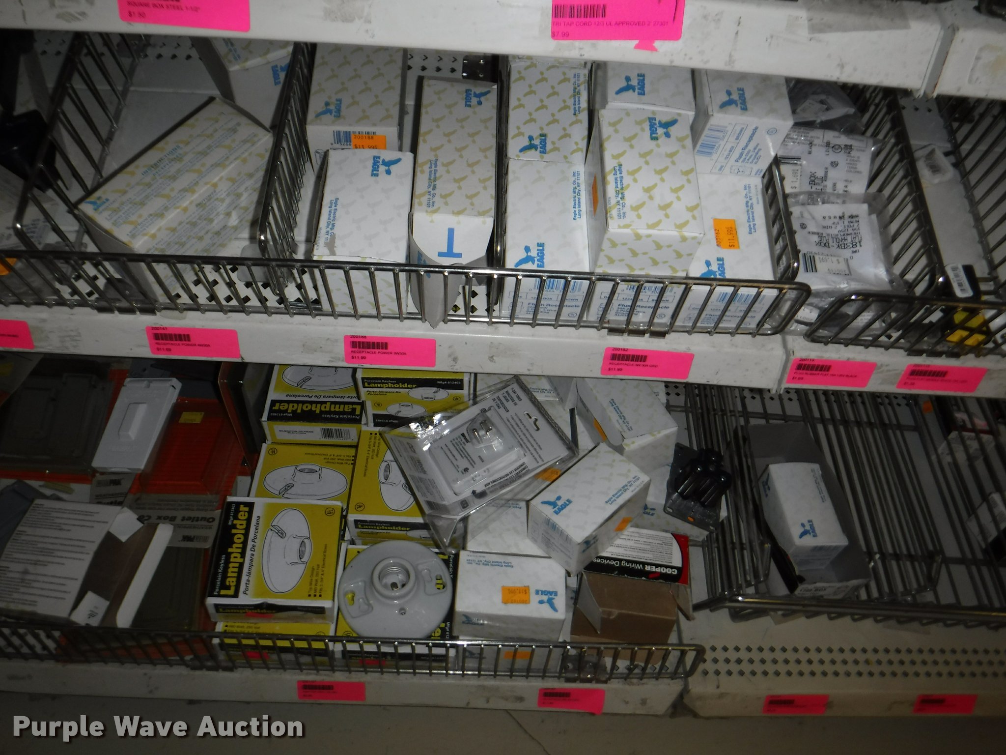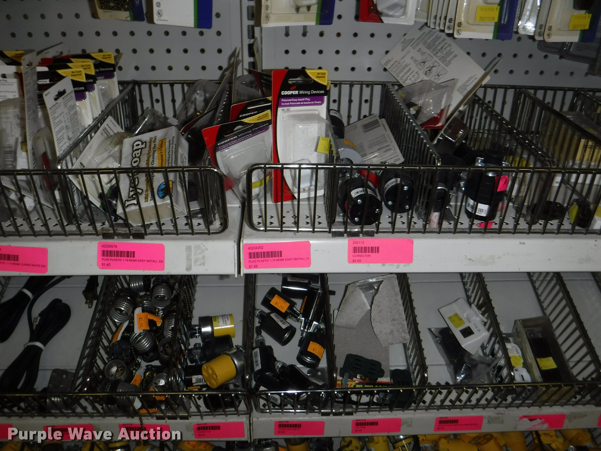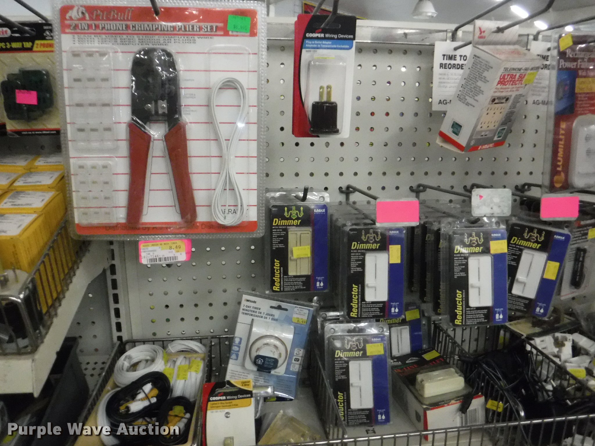 Purple Wave is selling a used Building Materials in Missouri. This item is a Electrical supplies with the following: Wiring with display rack, (8) breaker boxes, Electrical tape, Circuit breakers, Brackets, Conduit and adapters, Fish tape, Cable snakes, Night lights, Outlet/switch covers, Outlet sealers, Plug ends, Light bulb sockets, Dimmers/switches, Fuses, Crimping sets, Wire connectors and more