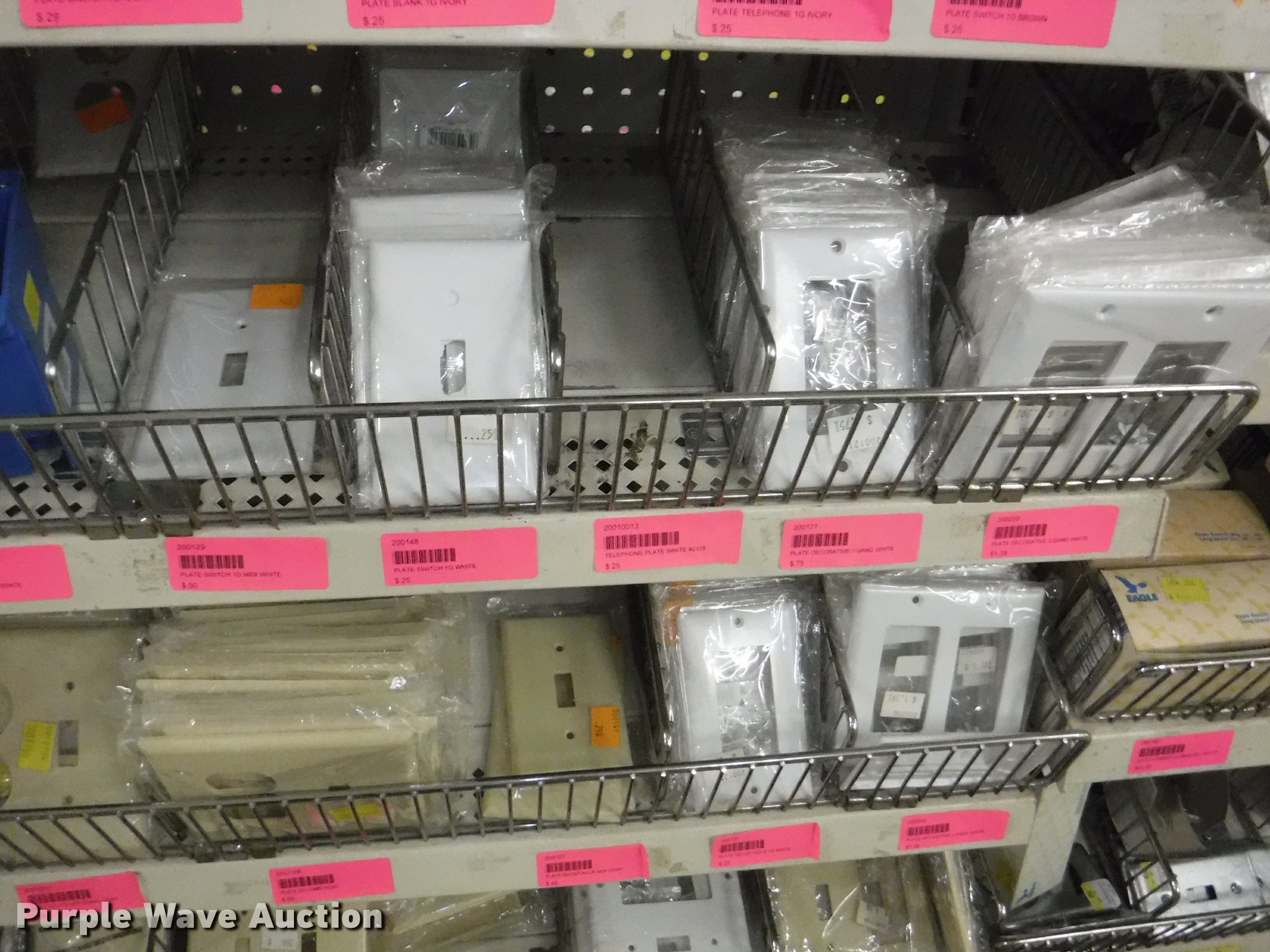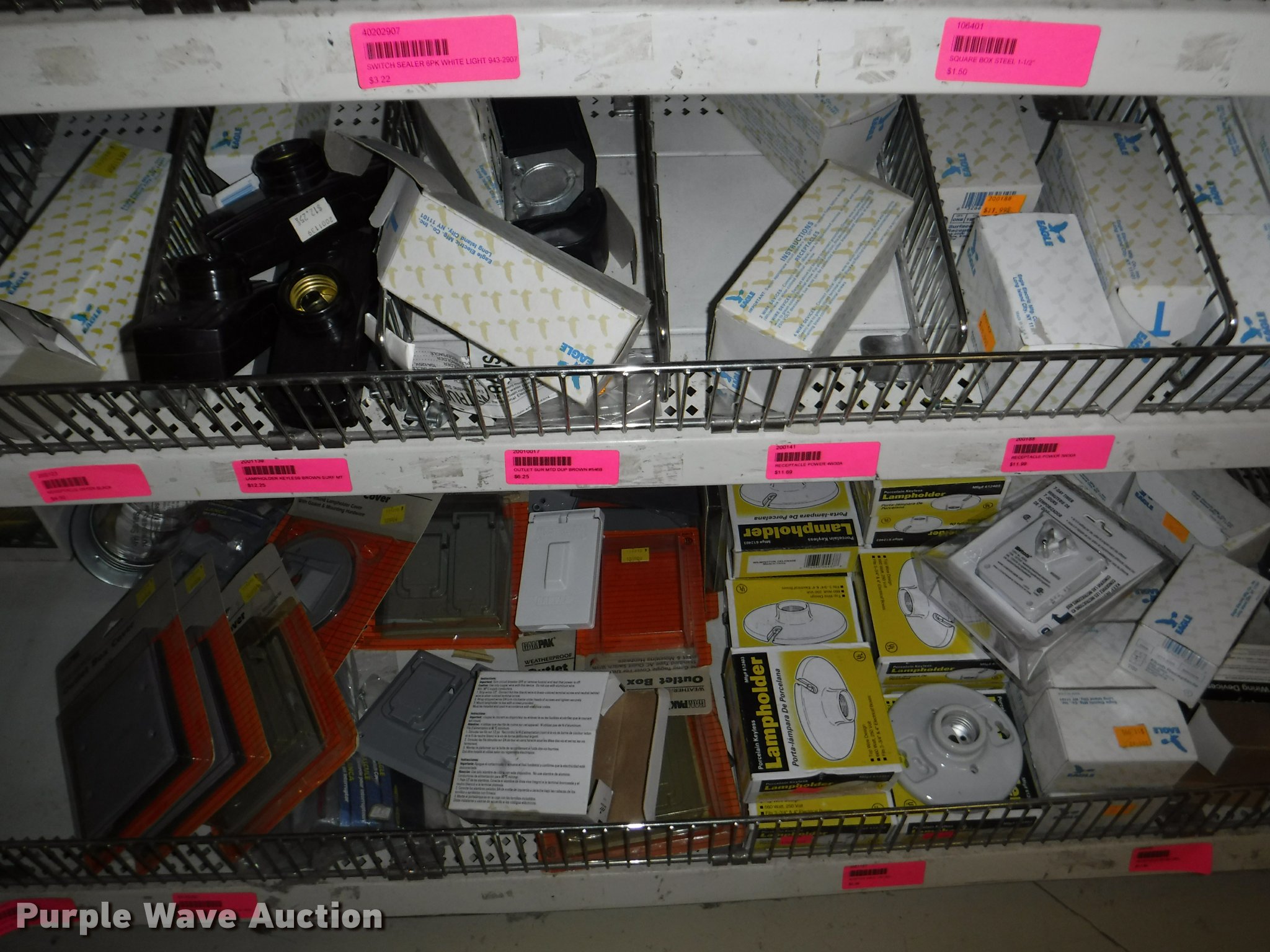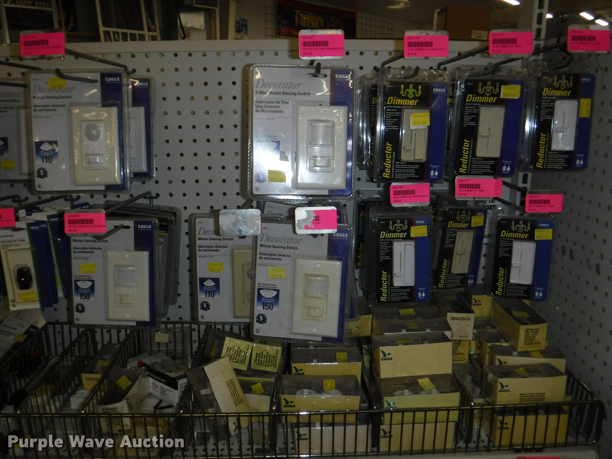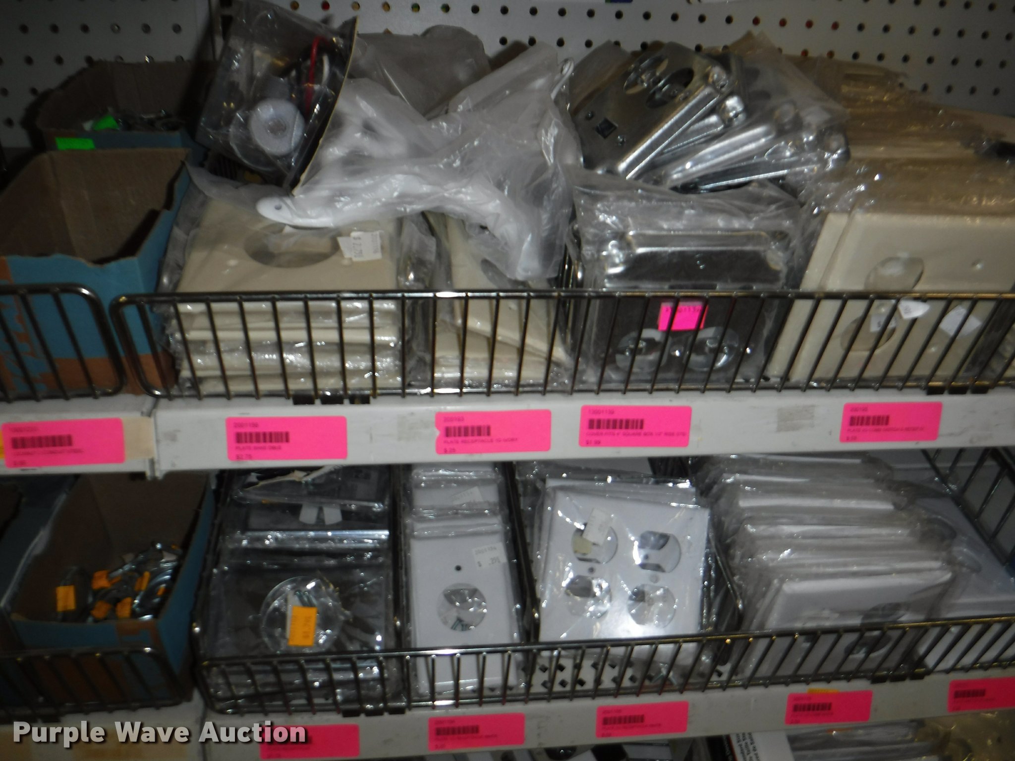 Purple Wave is selling a used Building Materials in Missouri. This item is a Electrical supplies with the following: Wiring with display rack, (8) breaker boxes, Electrical tape, Circuit breakers, Brackets, Conduit and adapters, Fish tape, Cable snakes, Night lights, Outlet/switch covers, Outlet sealers, Plug ends, Light bulb sockets, Dimmers/switches, Fuses, Crimping sets, Wire connectors and more
