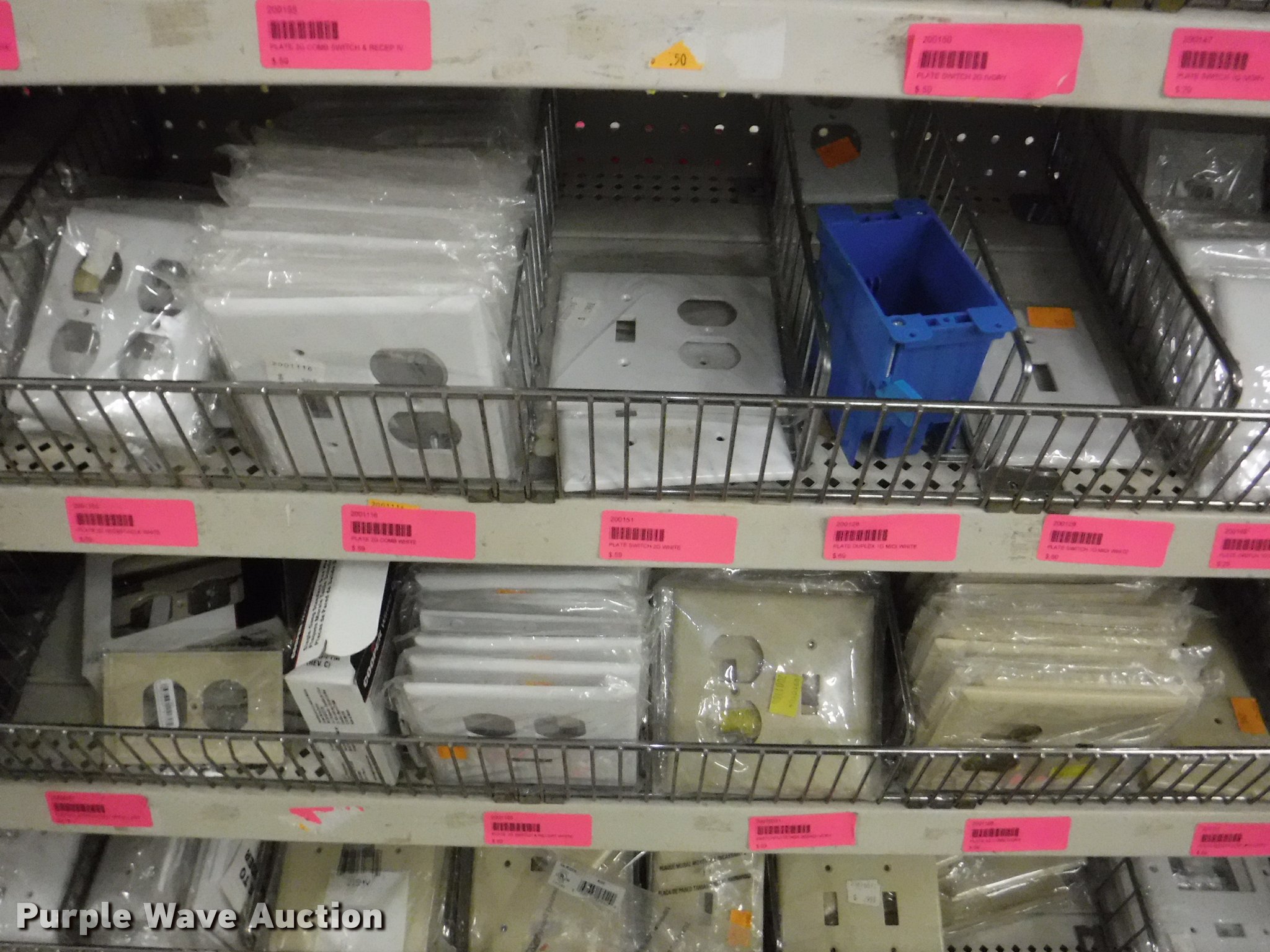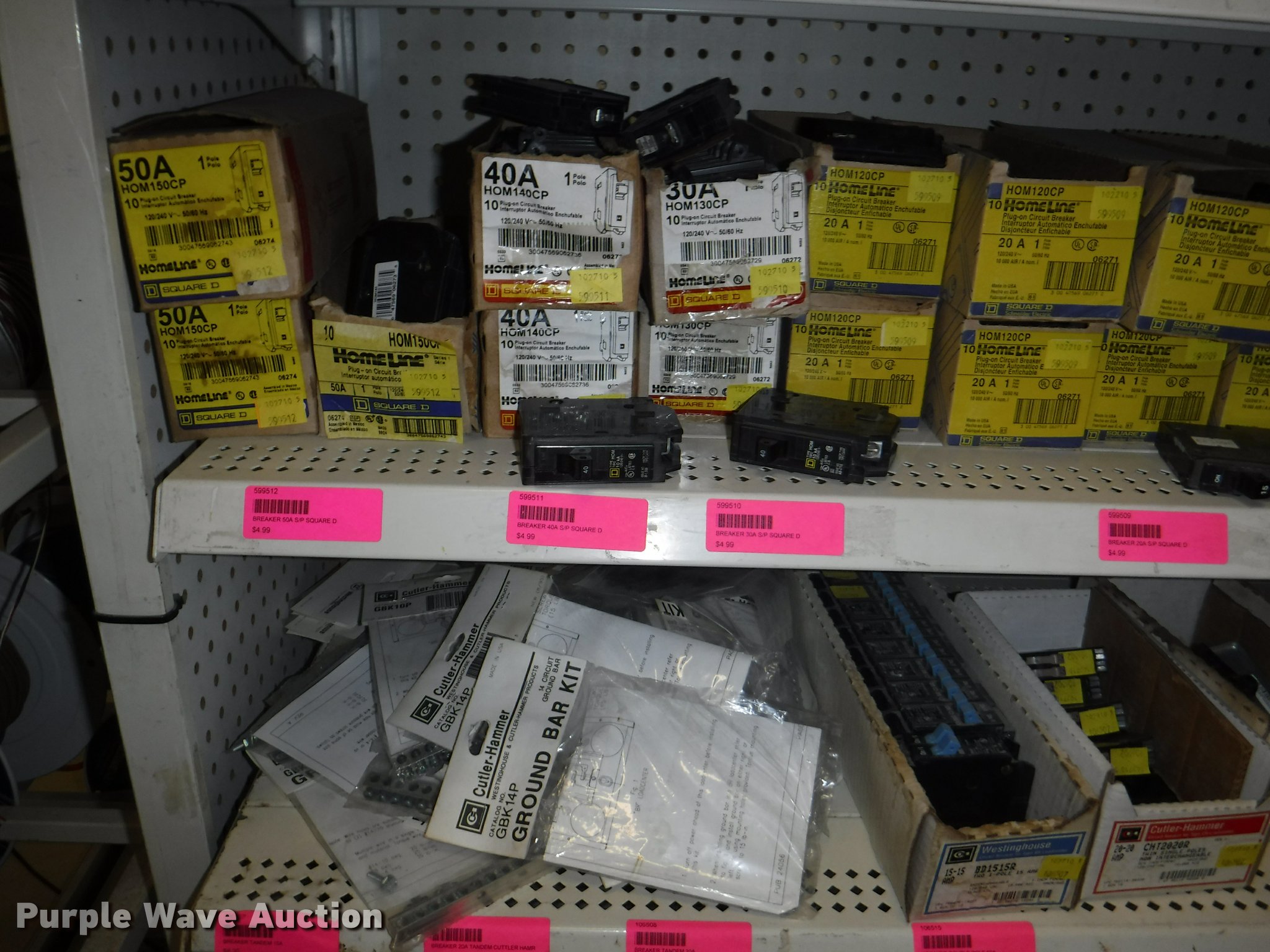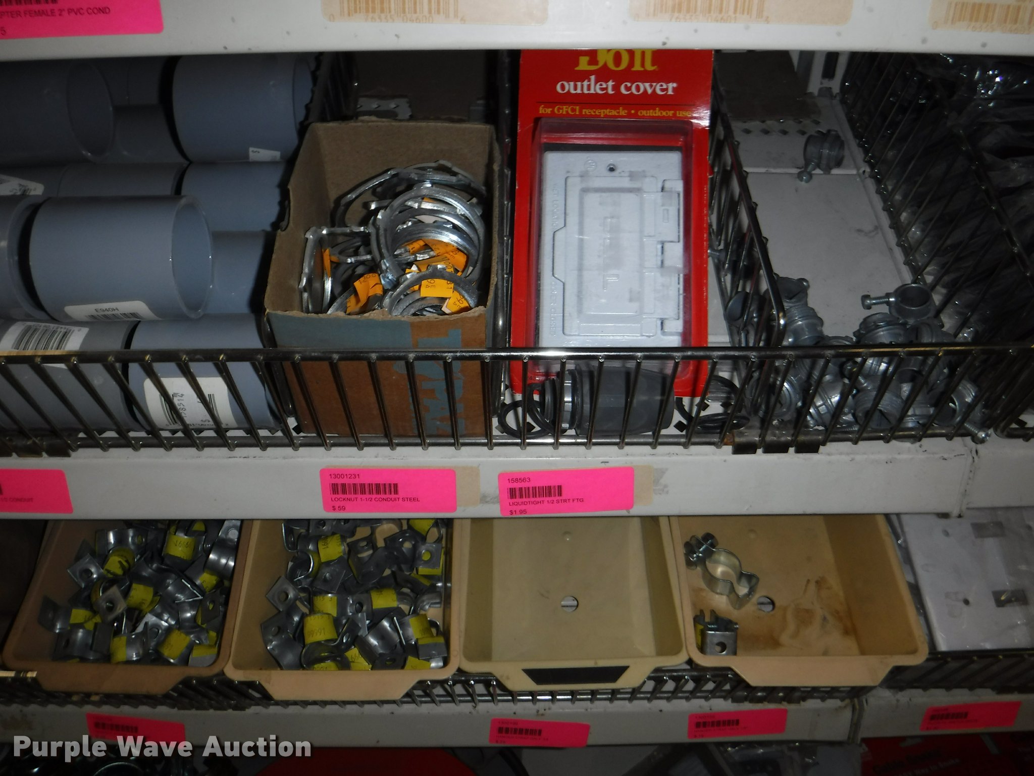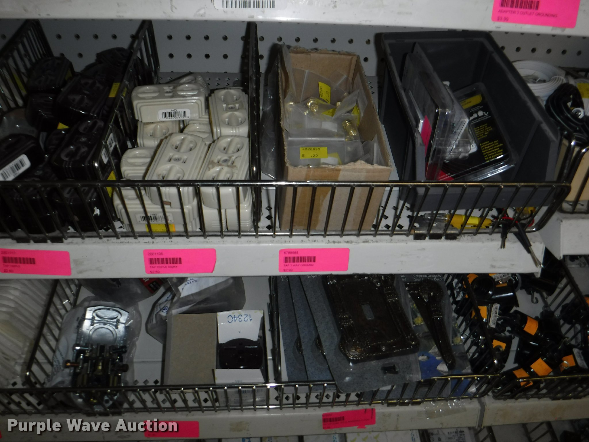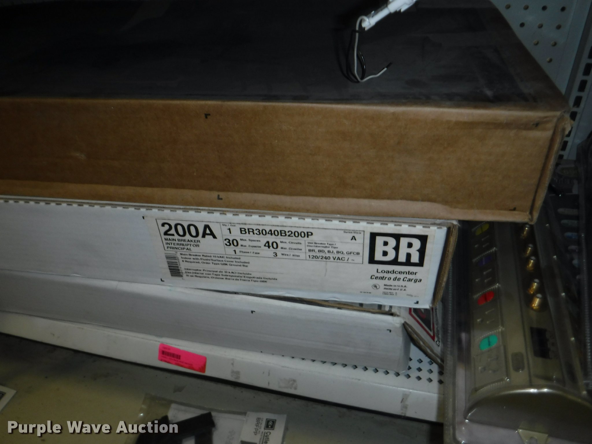Purple Wave is selling a used Building Materials in Missouri. This item is a Electrical supplies with the following: Wiring with display rack, (8) breaker boxes, Electrical tape, Circuit breakers, Brackets, Conduit and adapters, Fish tape, Cable snakes, Night lights, Outlet/switch covers, Outlet sealers, Plug ends, Light bulb sockets, Dimmers/switches, Fuses, Crimping sets, Wire connectors and more