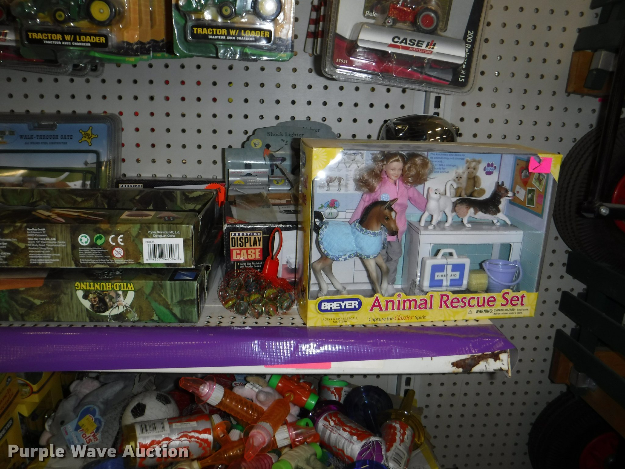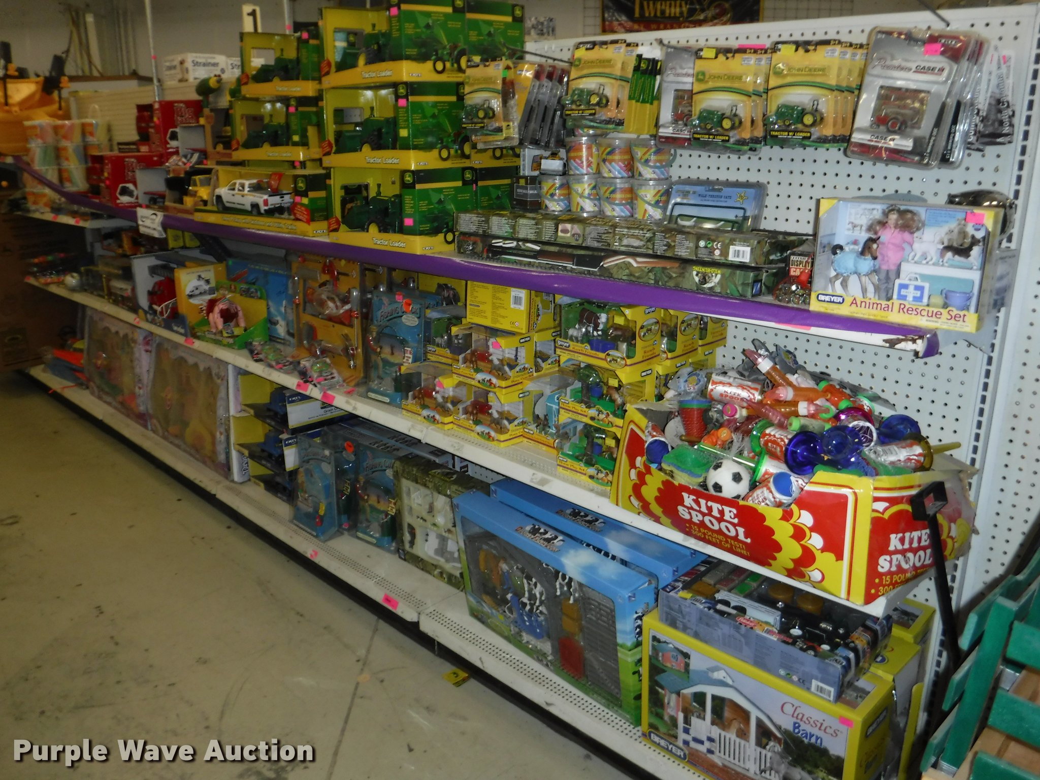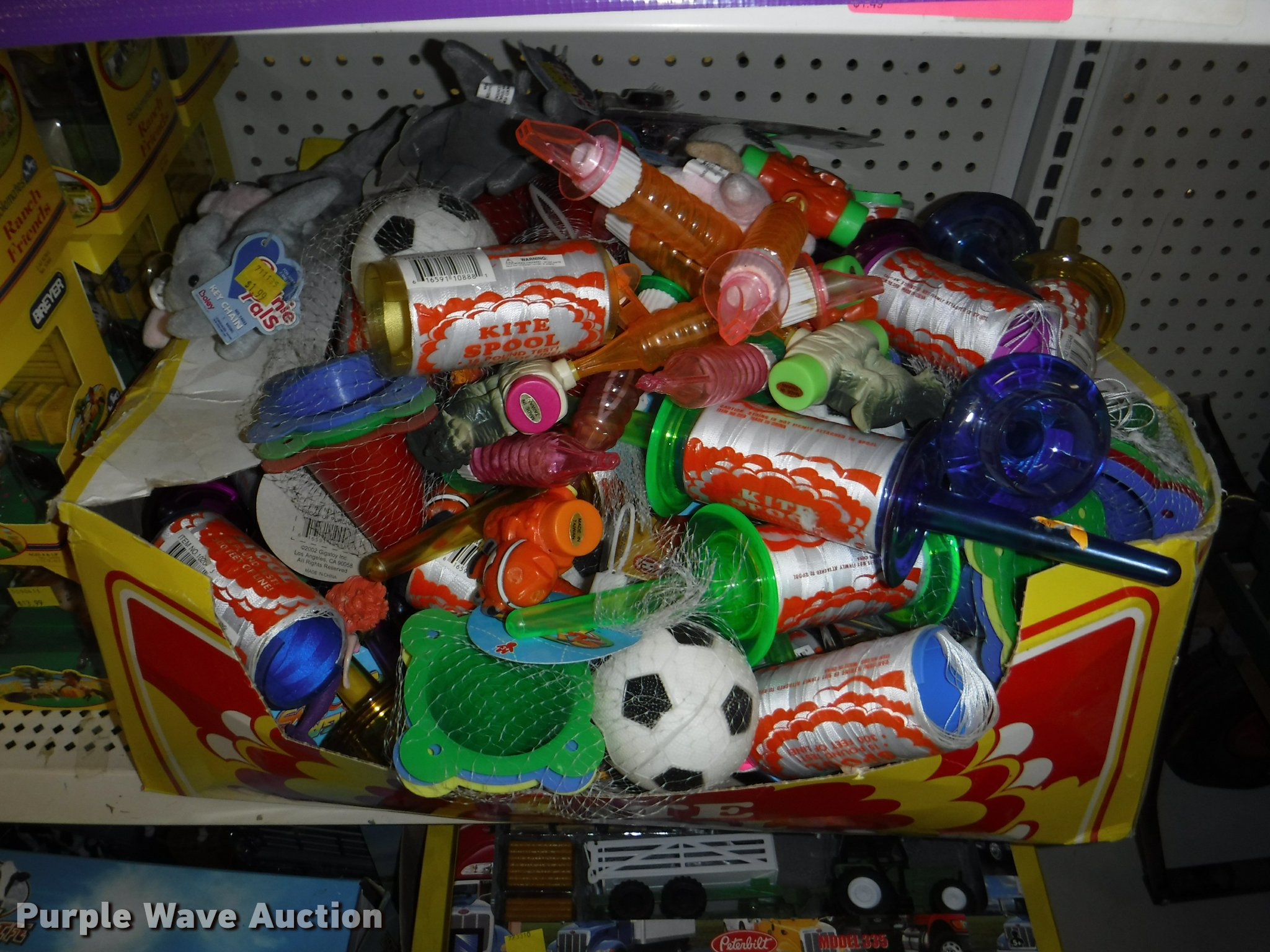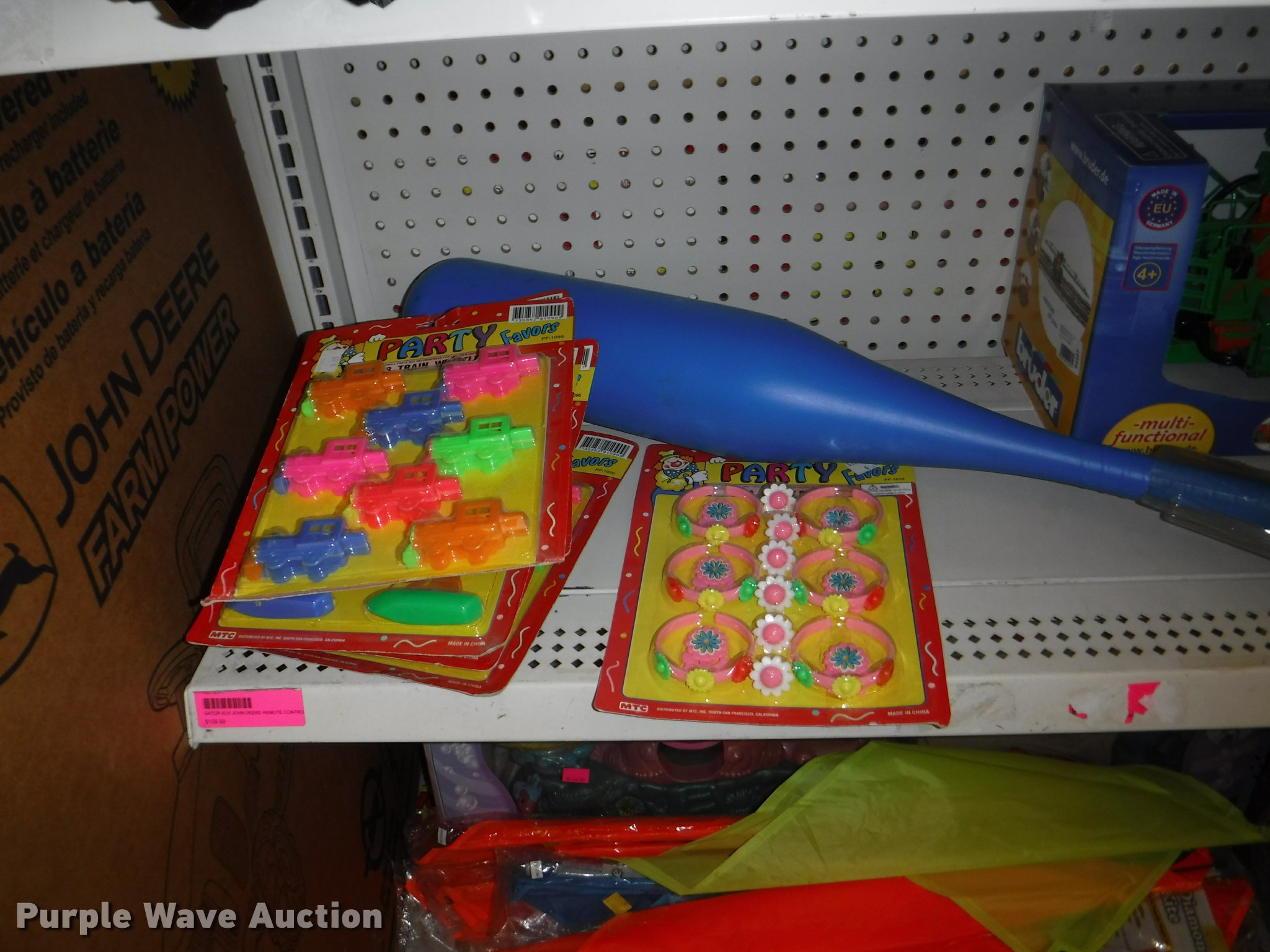 Purple Wave is selling a used All Other Household Items in Missouri. This item is a Children's toys and books with the following: (5) wood wagons, Barnyard figurines, Sidewalk chalk, Ert 1 tractors, trucks, and farm implements, Sport fishing clocks, Sea Palace play sets, Peterbilt 387 car, Police force models, Kites, RC Micro racing motorcycles, Ring caps, John Deere tractor with trailer, 12V, Ages 3 to 7 years old, Piggy banks, (2) Winchester Action Sound BB guns, Coloring books with rack