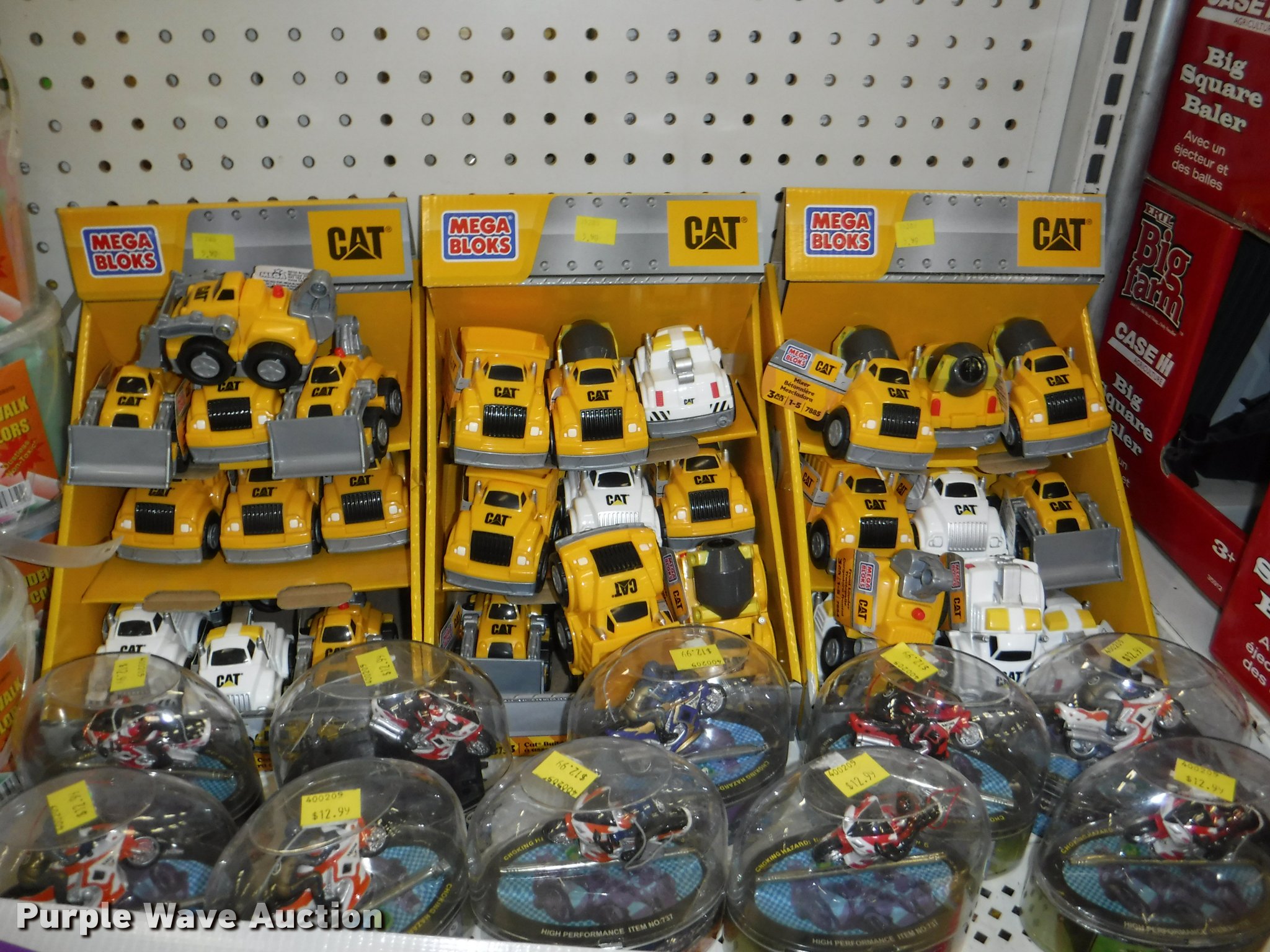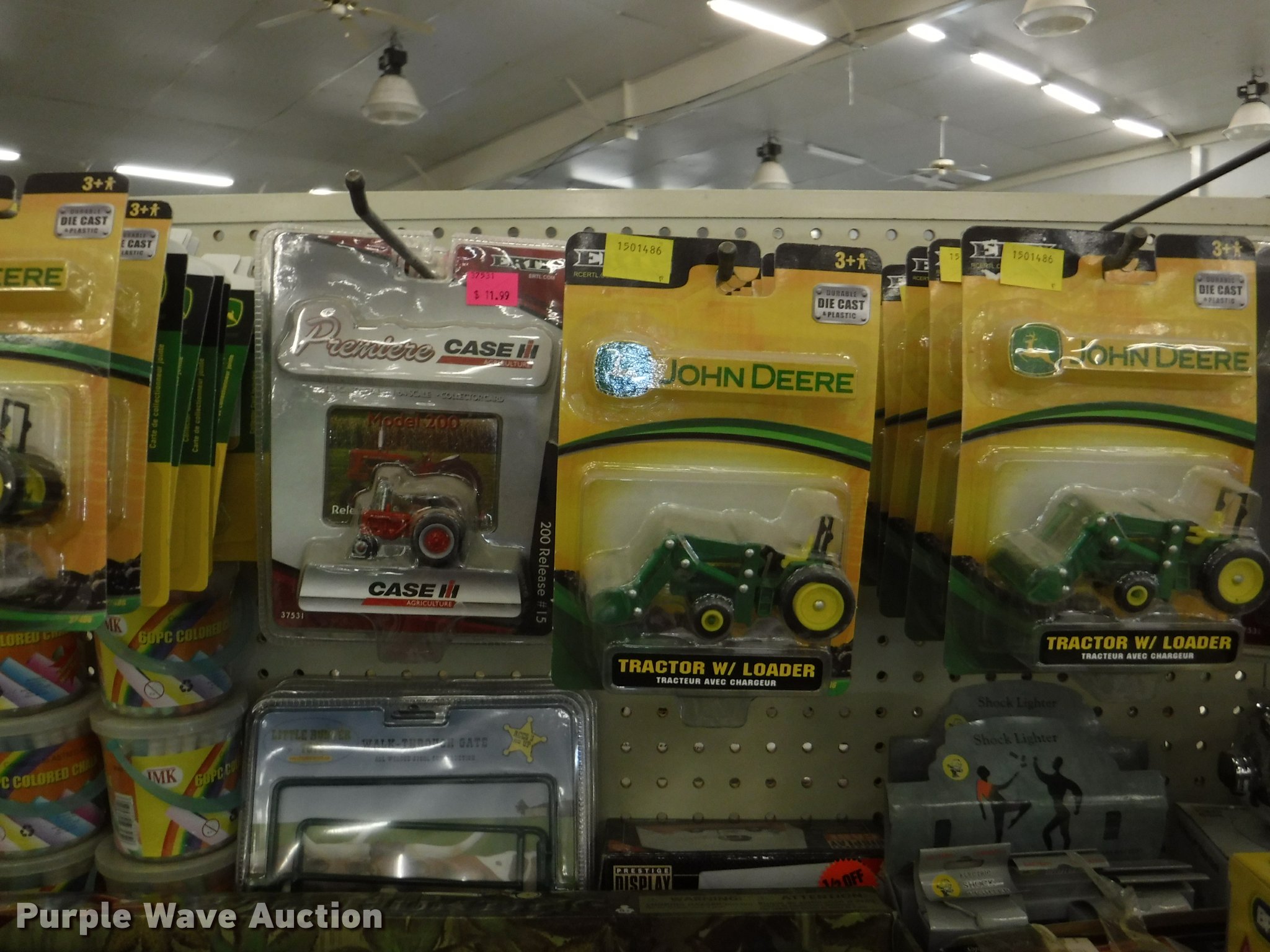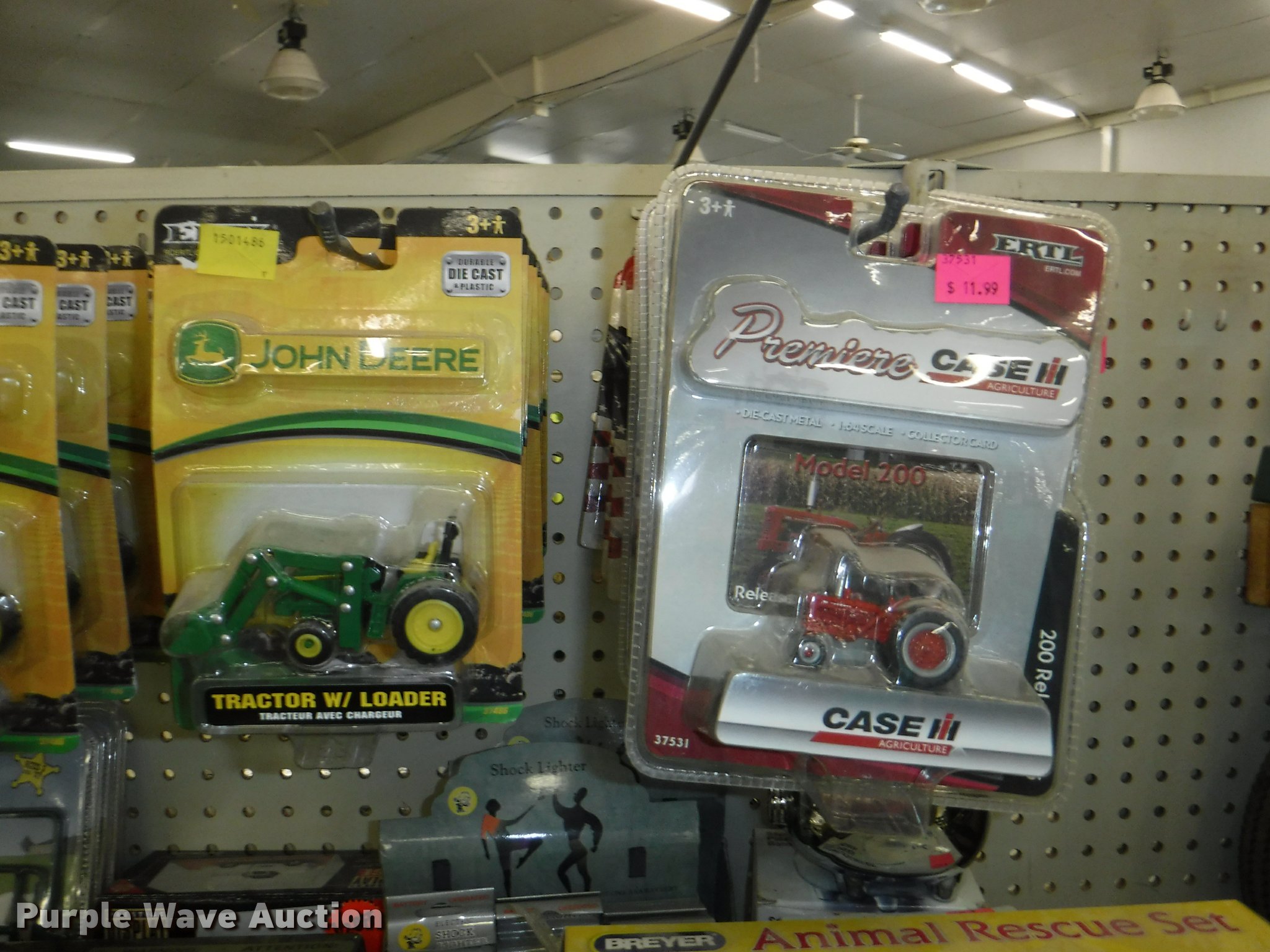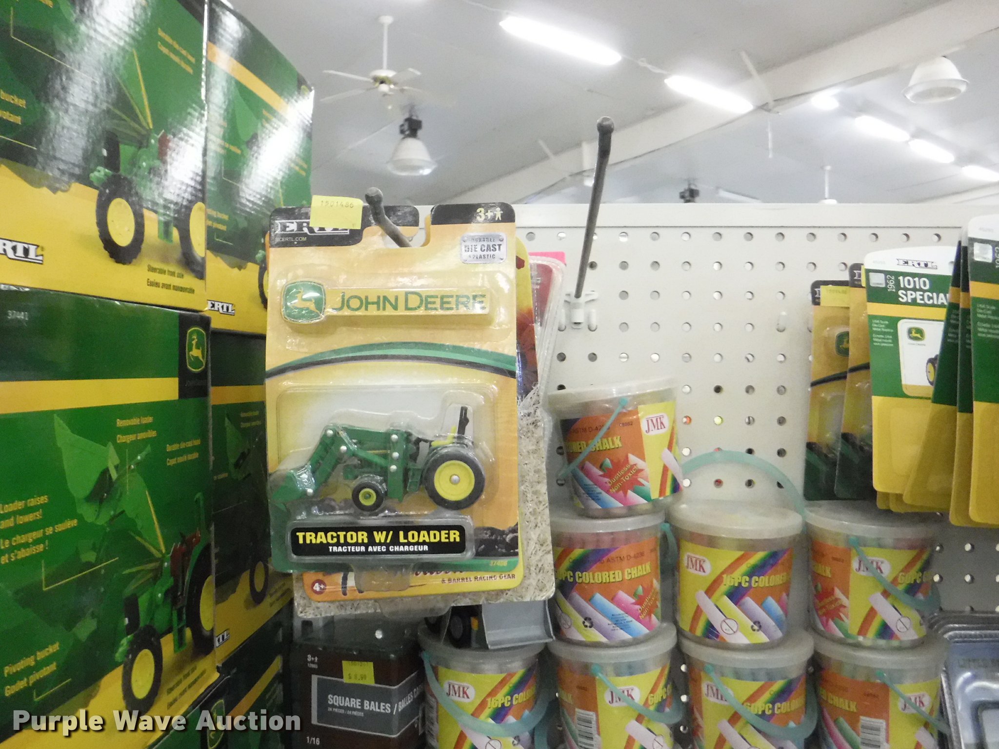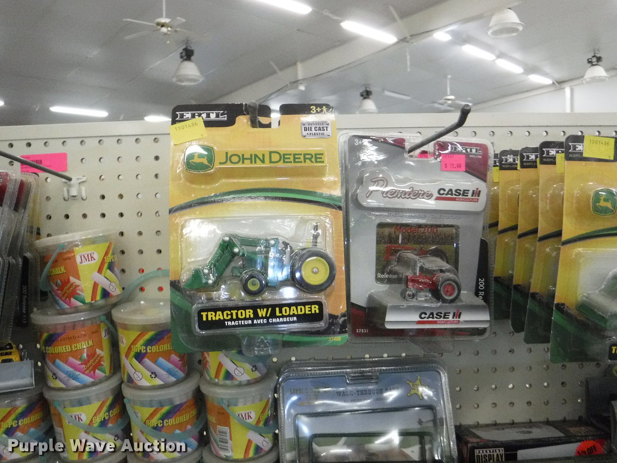 Children's toys and books. (5) wood wagons, Barnyard figurines, Sidewalk chalk, Ert 1 tractors, trucks, and farm implements, Sport fishing clocks, Sea Palace play sets, Peterbilt 387 car, Police force models, Kites, RC Micro racing motorcycles, Ring caps, John Deere tractor with trailer 12V, Ages 3 to 7 years old, Piggy banks, (2) Winchester Action Sound BB guns, Coloring books with rack. AgMart Sales. 2832 E Malone Ave. Sikeston, MO 63801