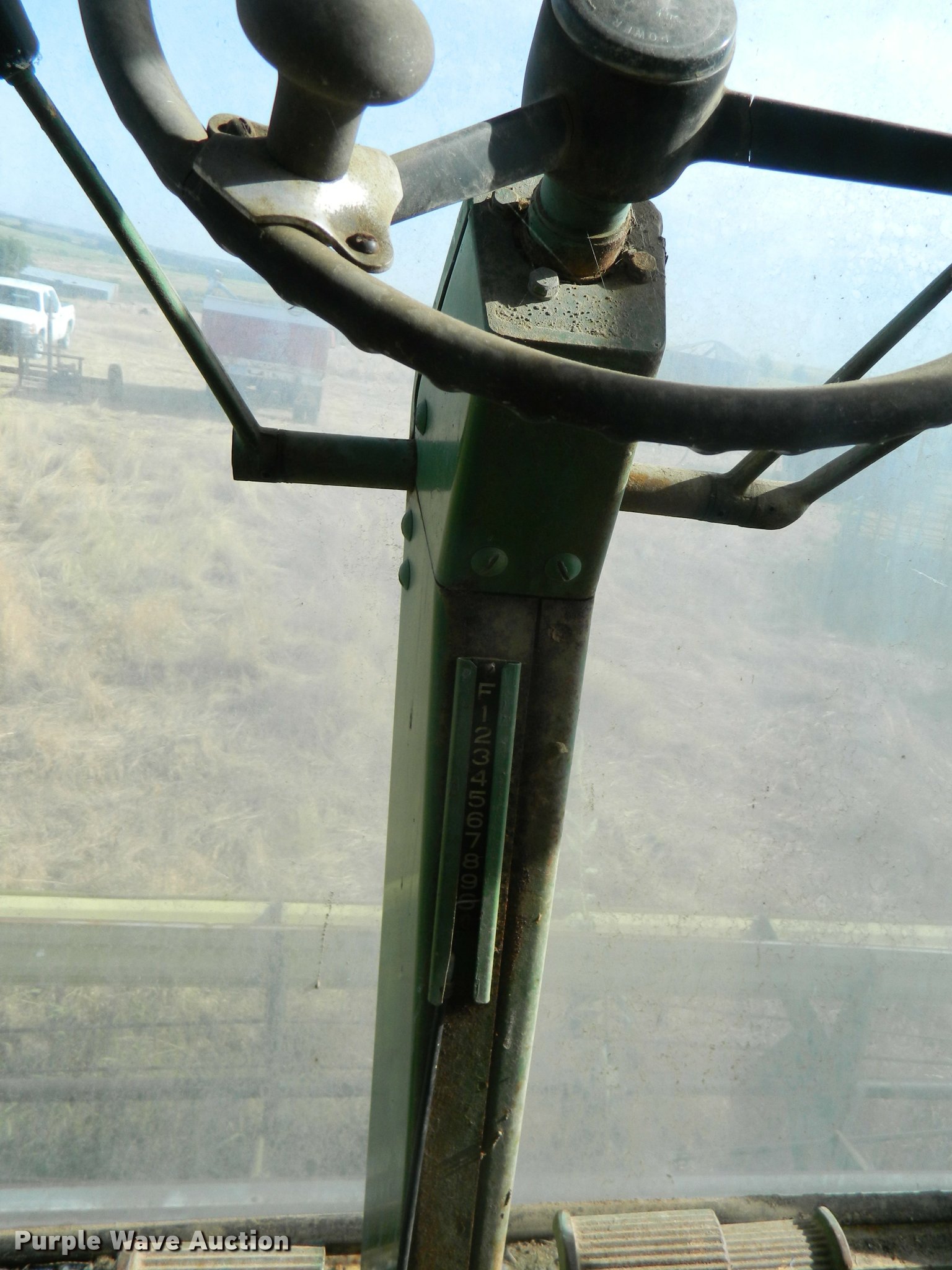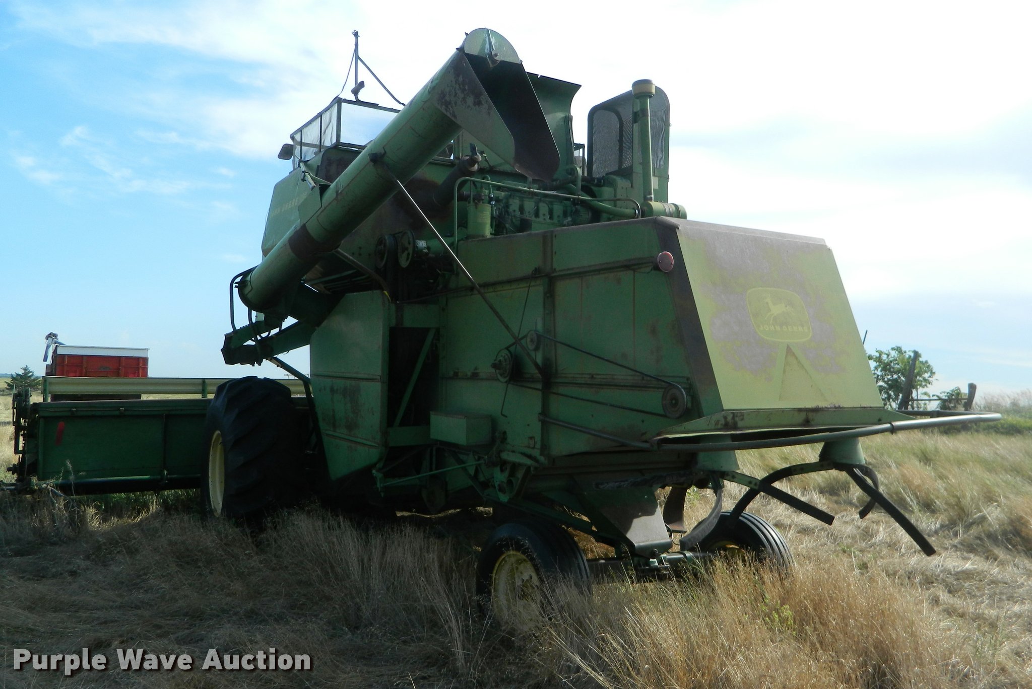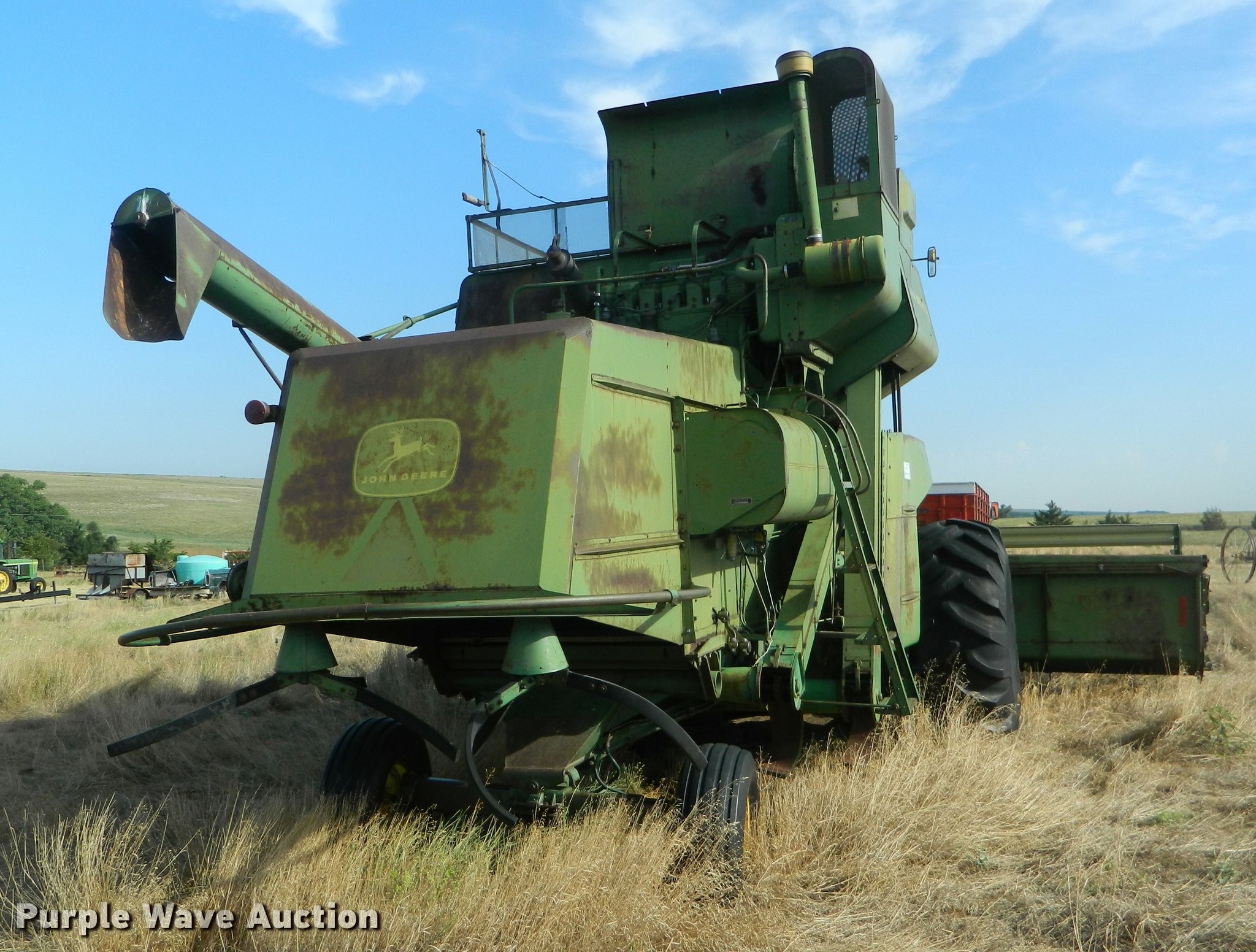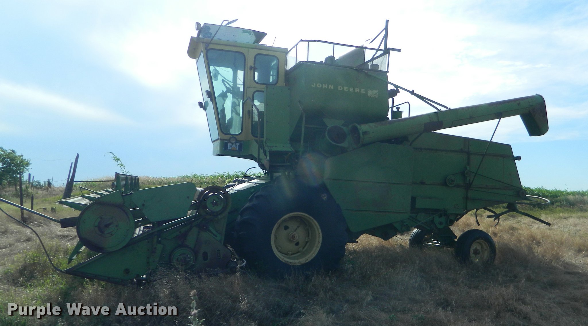 Purple Wave is selling a used Combine in Kansas. This item is a John Deere 105 combine with the following: 3,620 engine hours on meter, John Deere six cylinder gas engine, Manual transmission, 4F-1R gears, Suspension seat, Water cooler, Chaff spreader, John Deere rigid head, 20'W, Bat reel, Hydraulic reel height control, Serial 178119H, 23.1-26 front tires, 11L-16 rear tires, Non-operational unit, parts may be missing, Serial E010512682