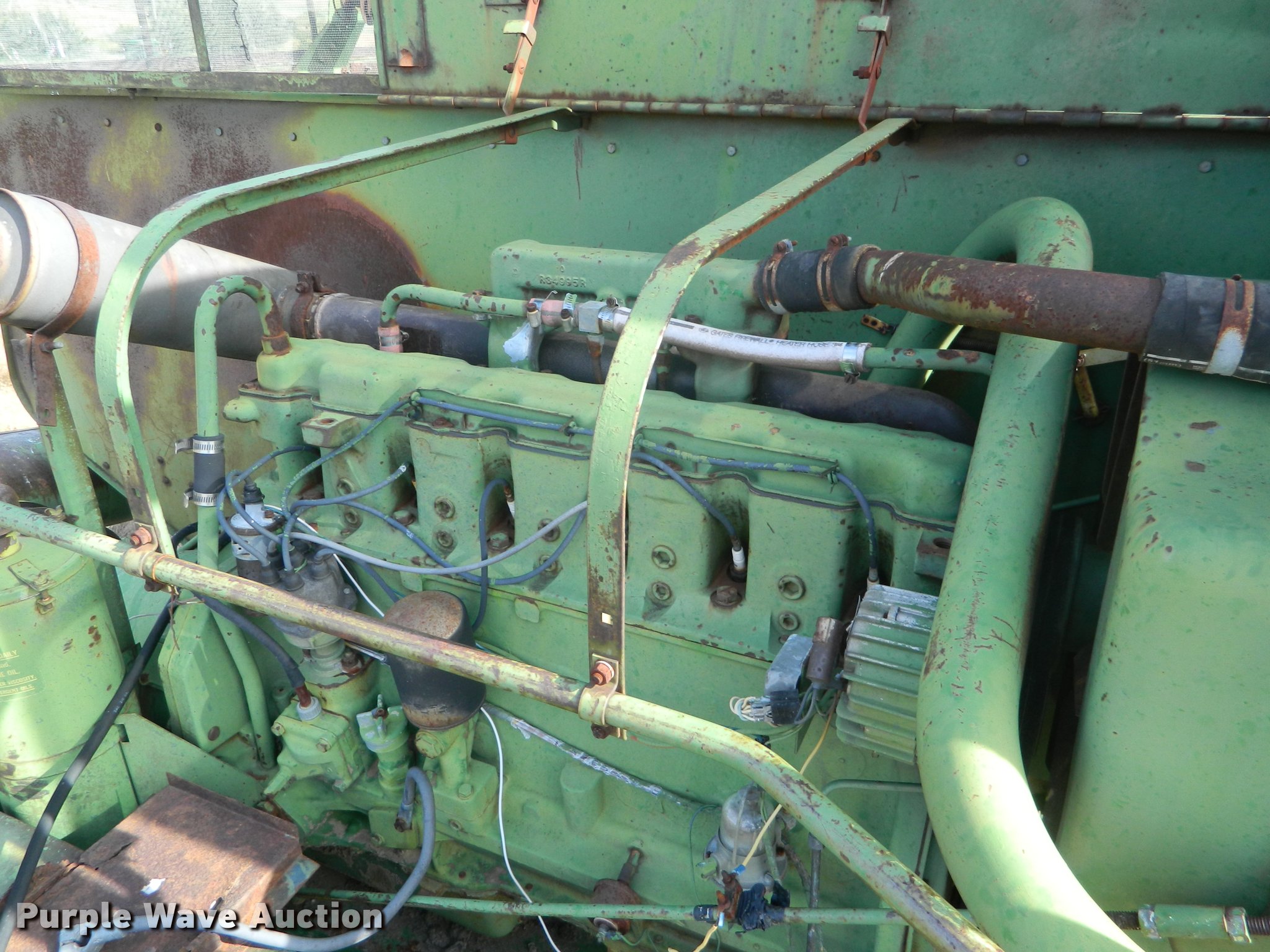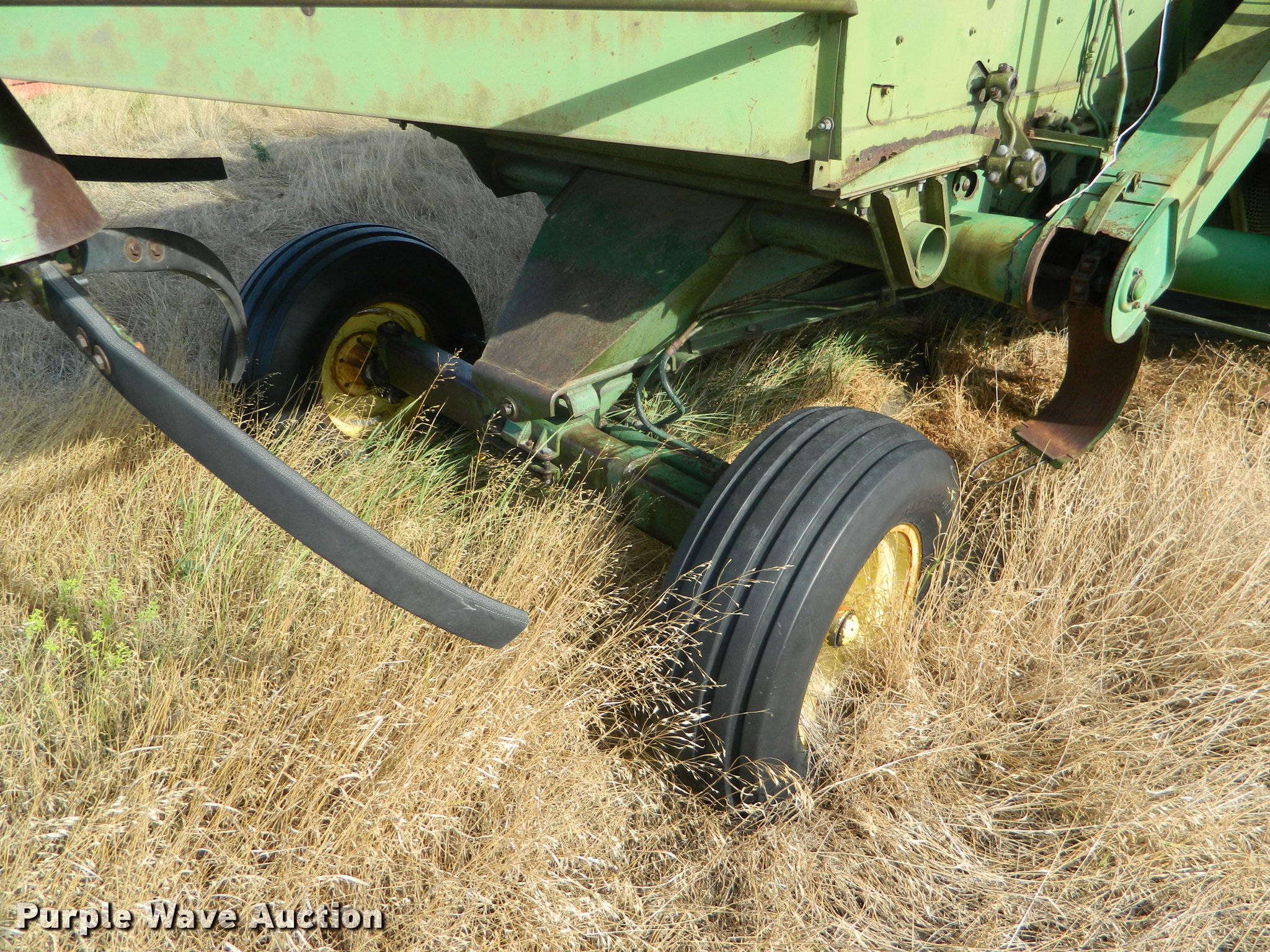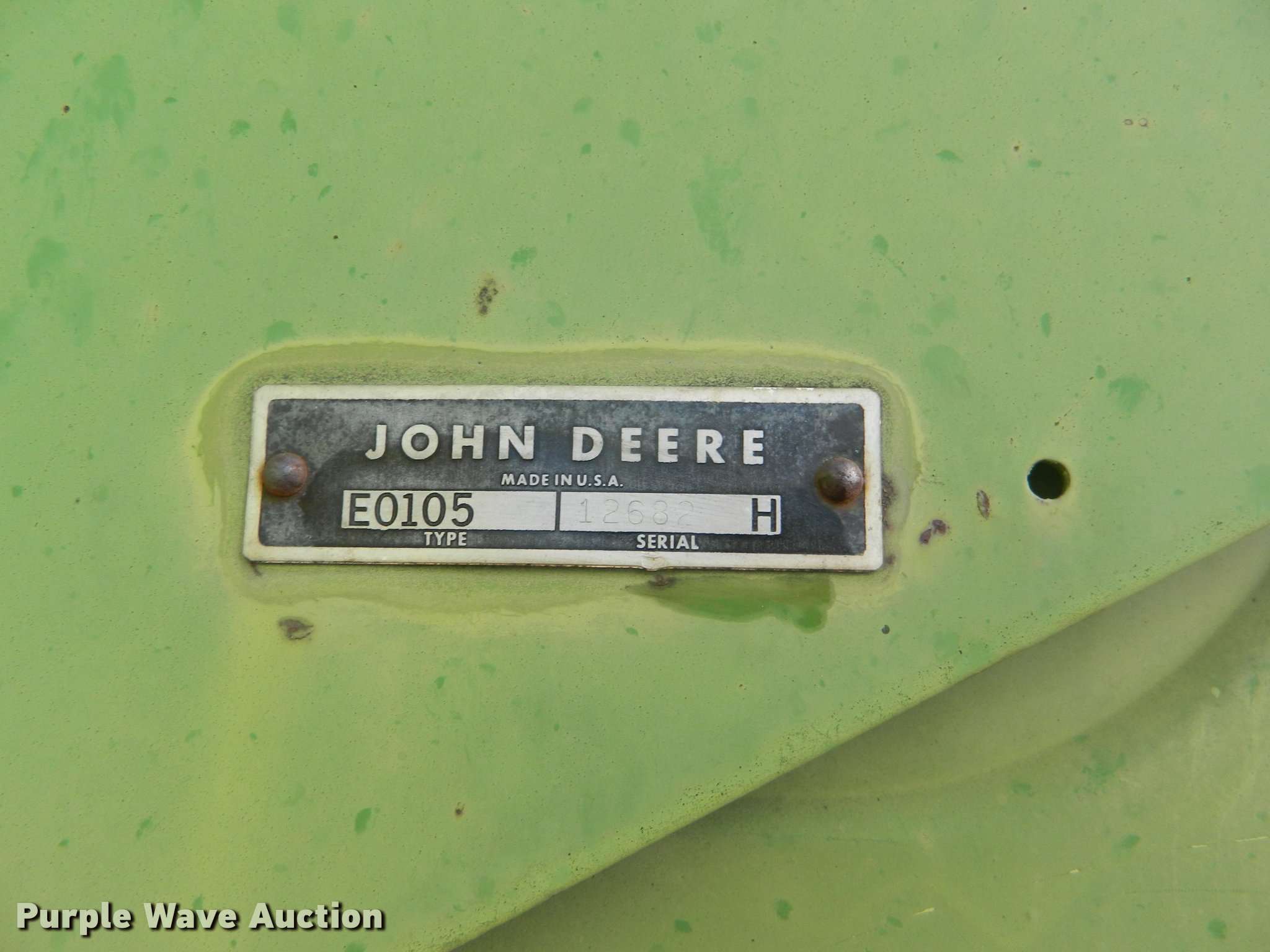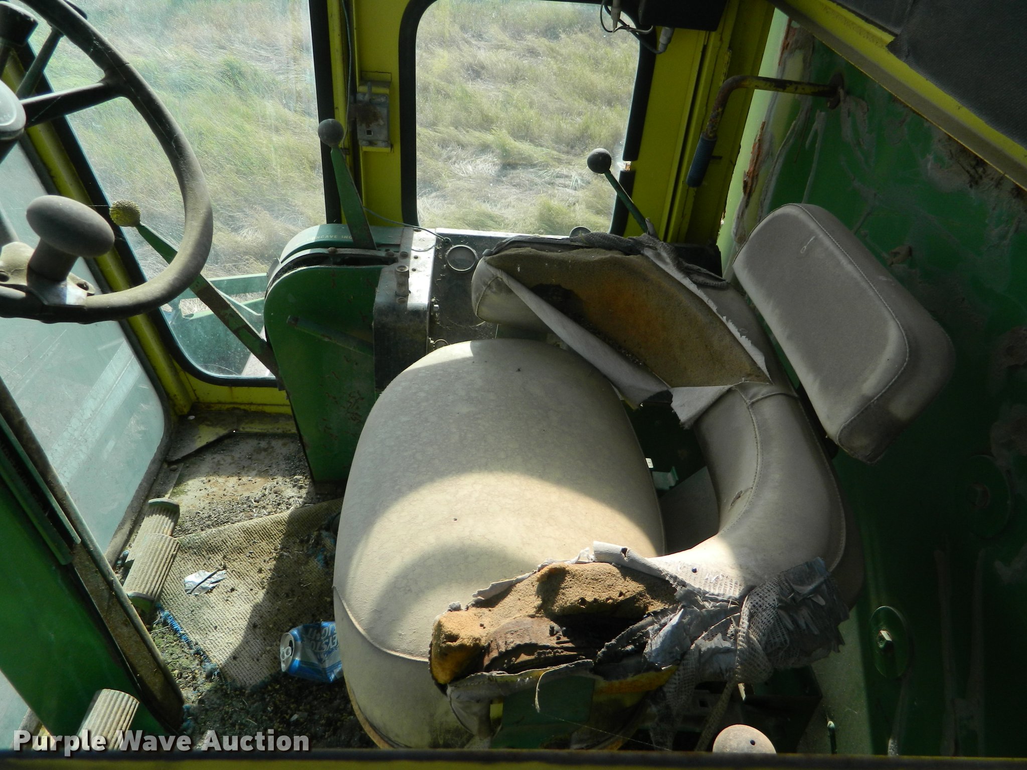 Purple Wave is selling a used Combine in Kansas. This item is a John Deere 105 combine with the following: 3,620 engine hours on meter, John Deere six cylinder gas engine, Manual transmission, 4F-1R gears, Suspension seat, Water cooler, Chaff spreader, John Deere rigid head, 20'W, Bat reel, Hydraulic reel height control, Serial 178119H, 23.1-26 front tires, 11L-16 rear tires, Non-operational unit, parts may be missing, Serial E010512682