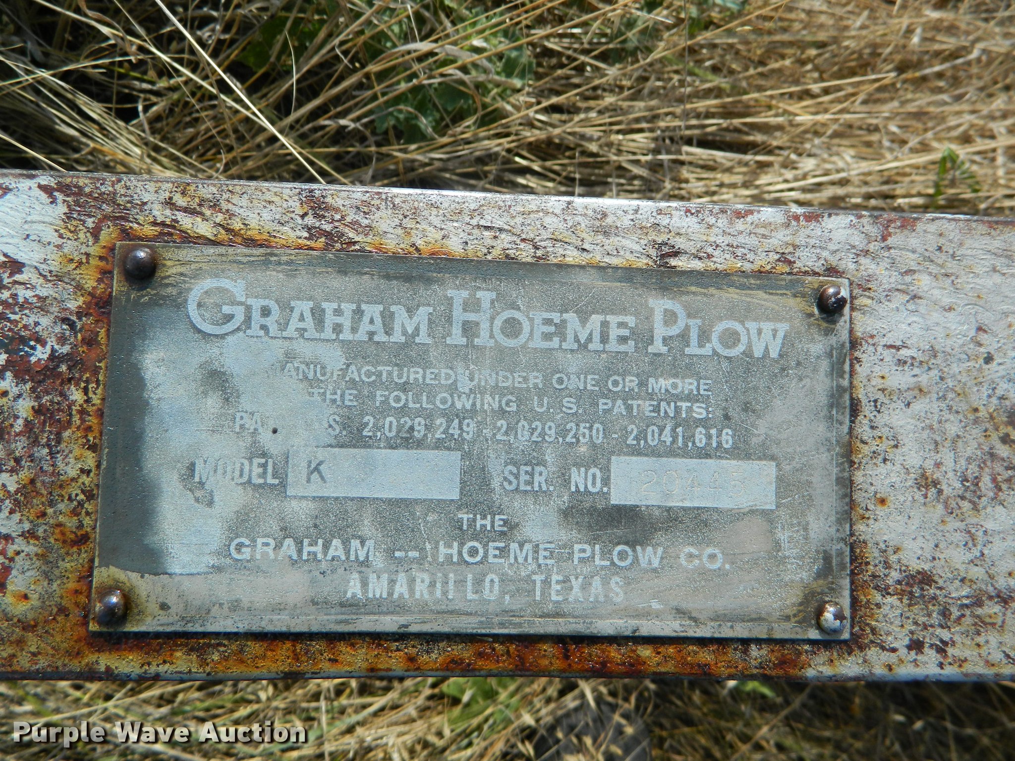 Purple Wave is selling a used Plow in Kansas. This item is a Graham Hoeme K plow with the following: 10'W, (2) 1' extensions, Hydraulic cylinder, 6.00-16 tires, Serial 20445