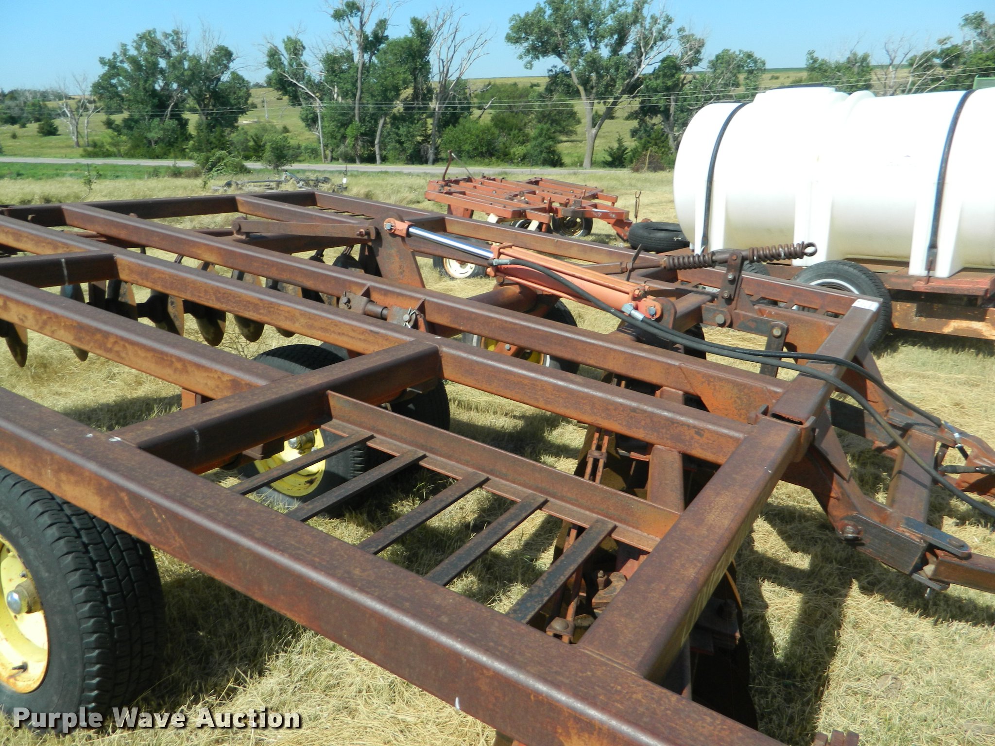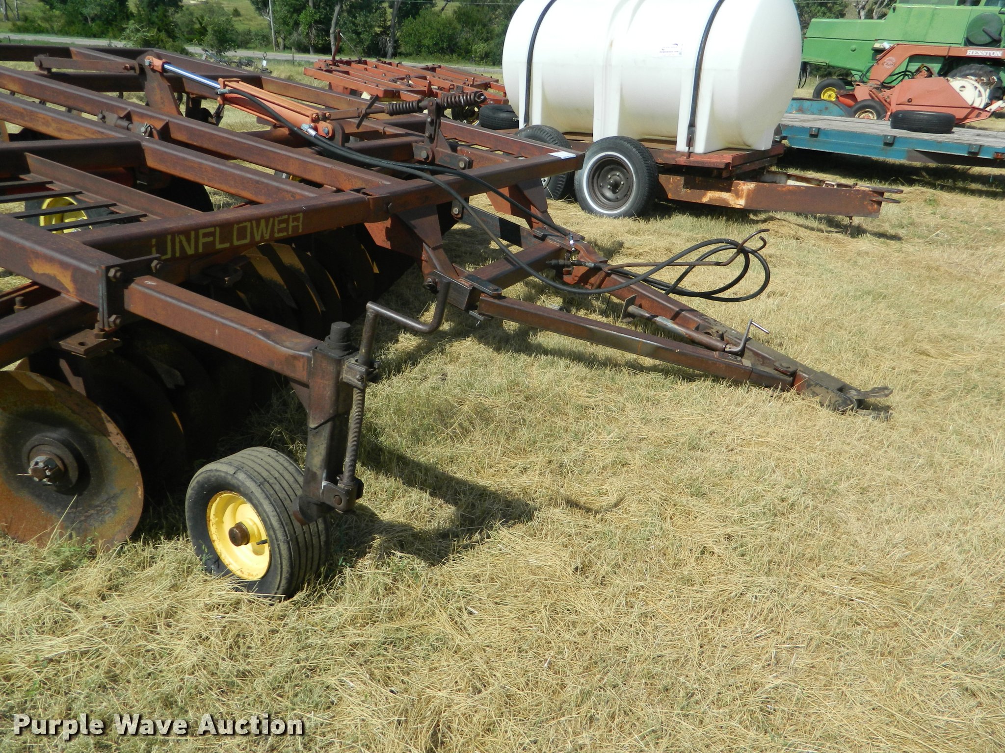 Purple Wave is selling a used Disk in Kansas. This item is a Sunflower off-set disk with the following: 13'W, 18" to 20"disks, 8.5" spacing, Disk scrapers, Hydraulic lift with cylinder, Pin hitch, 15" tires