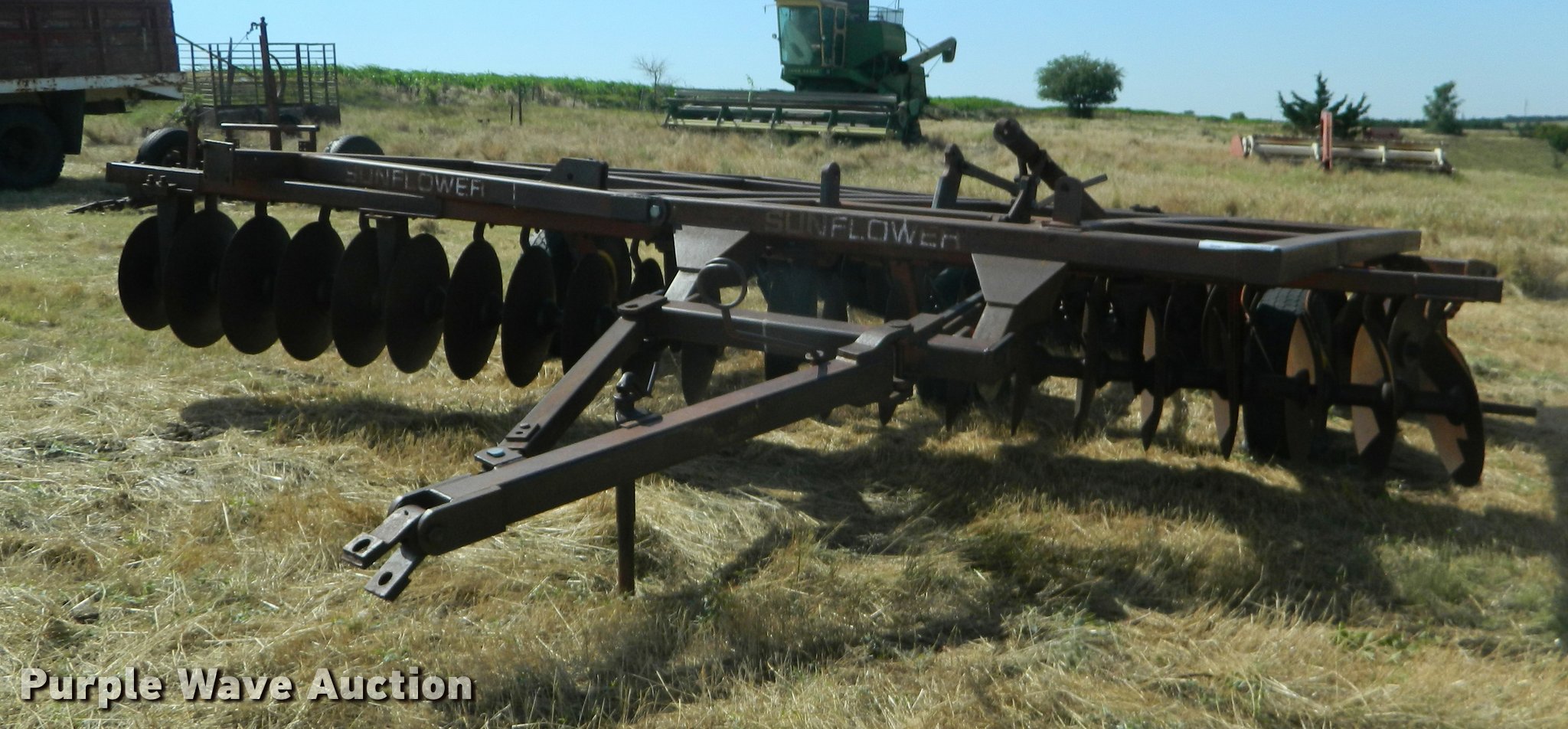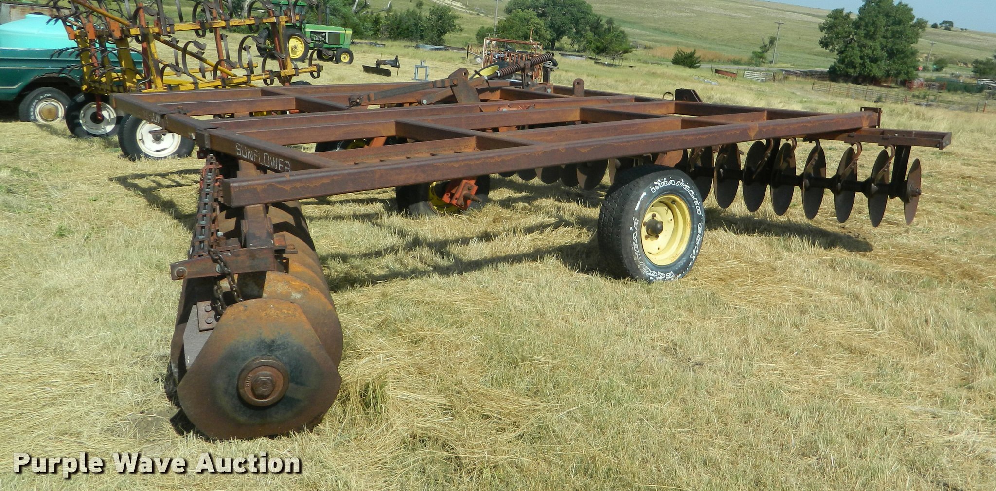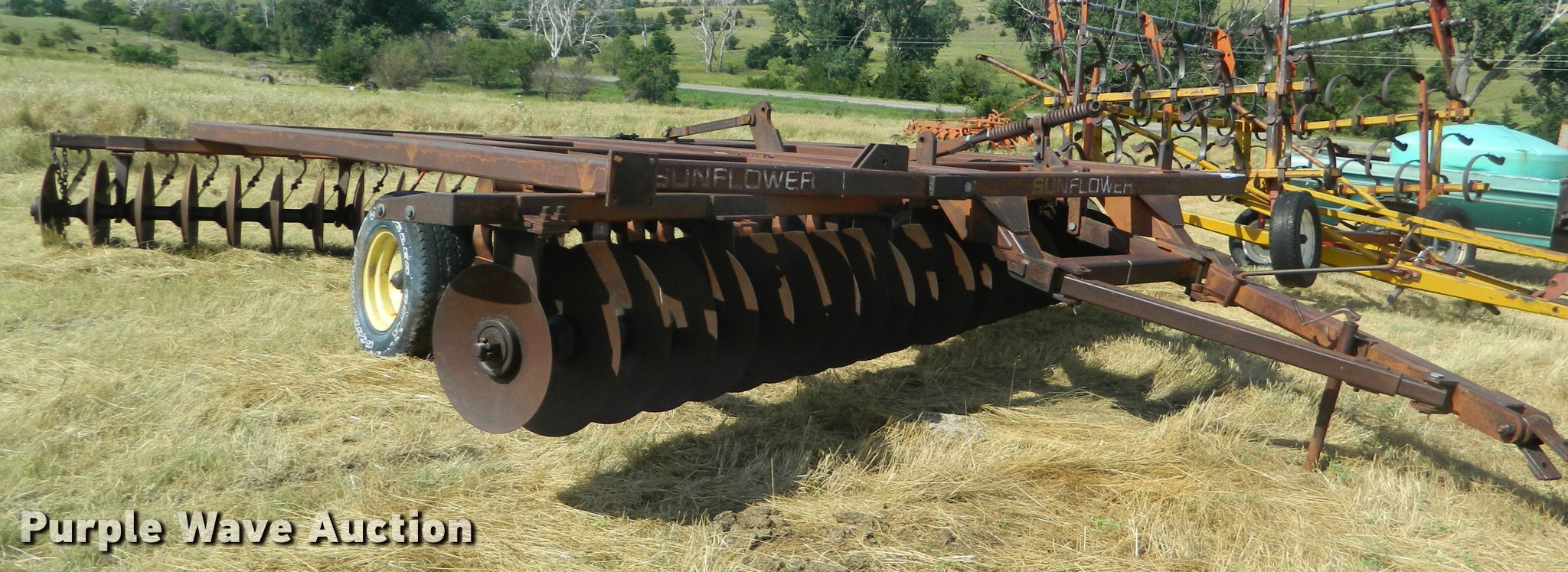 Purple Wave is selling a used Disk in Kansas. This item is a Sunflower off-set disk with the following: 16'W, 21" to 23" disks, 8" spacing, Disk scrapers, Hydraulic lift, Pin hitch, 15" tires, Tires need to be replaced, Front gang missing parts