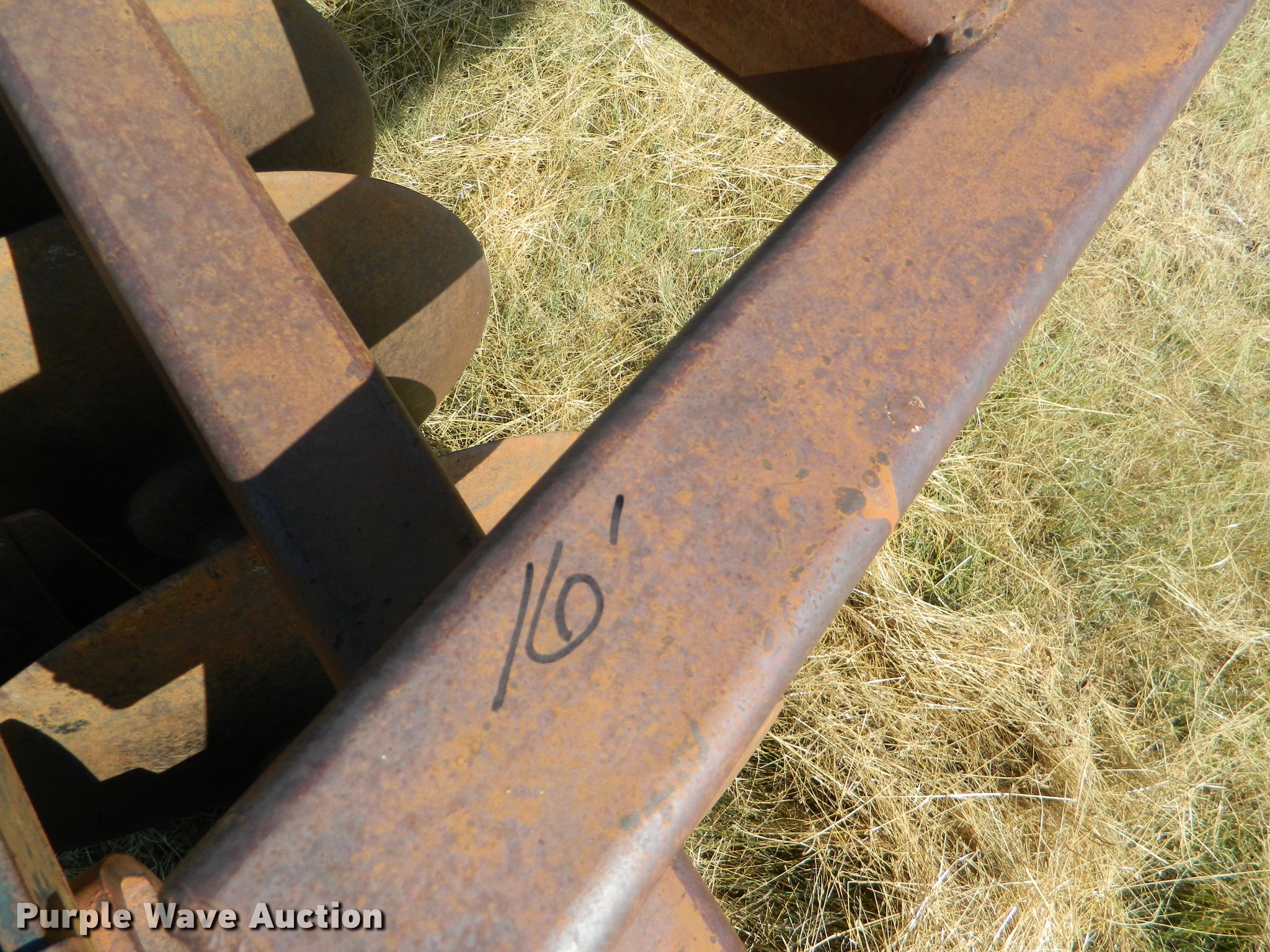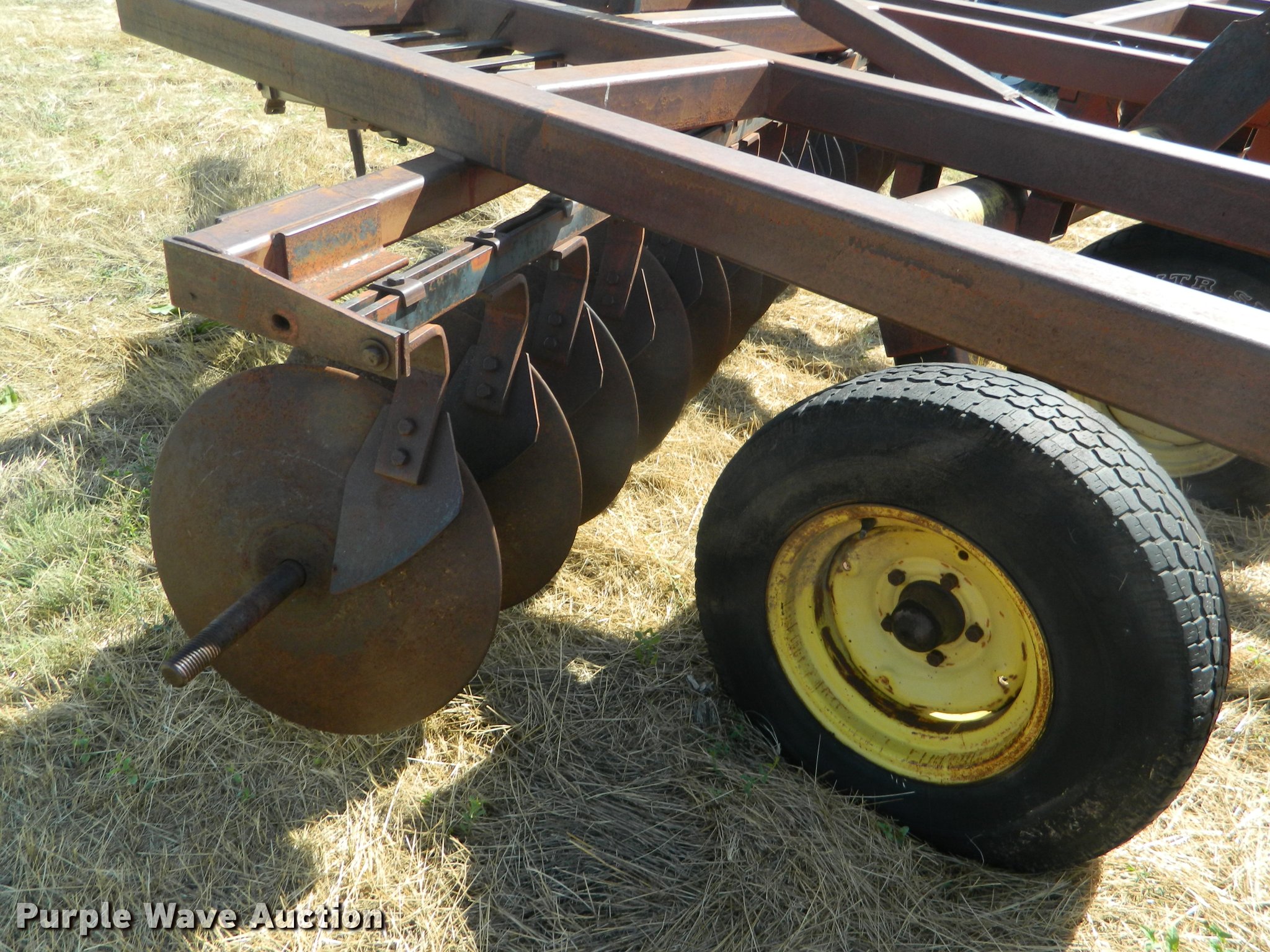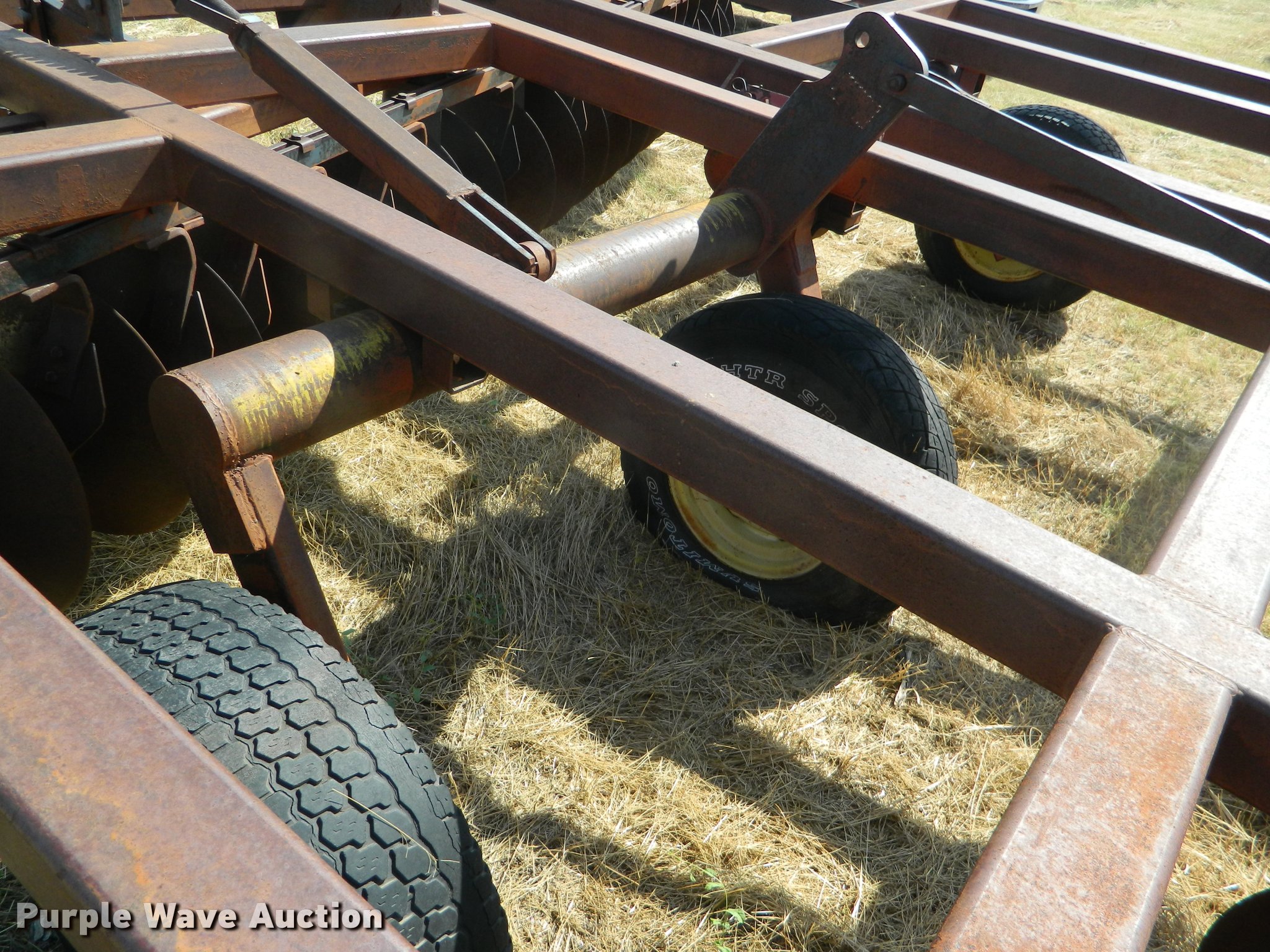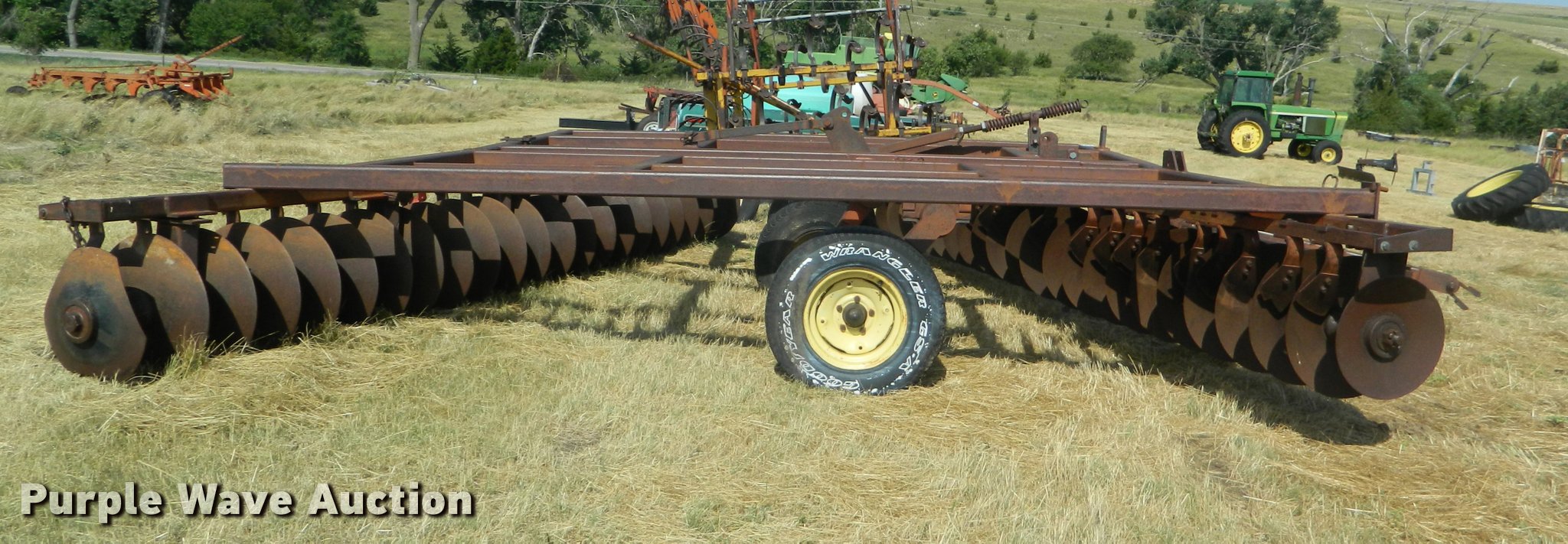 Purple Wave is selling a used Disk in Kansas. This item is a Sunflower off-set disk with the following: 16'W, 21" to 23" disks, 8" spacing, Disk scrapers, Hydraulic lift, Pin hitch, 15" tires, Tires need to be replaced, Front gang missing parts