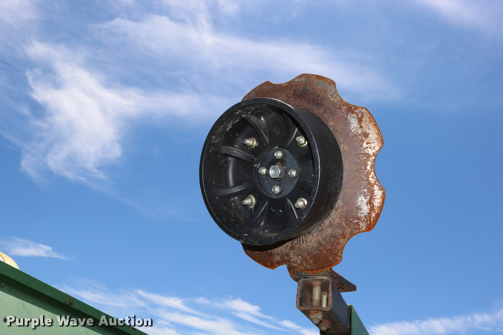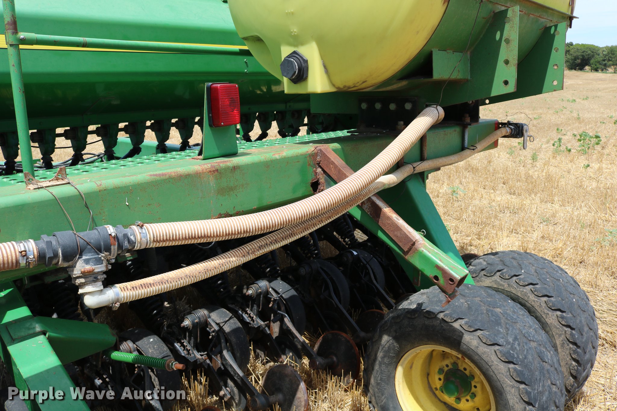 Purple Wave is selling a used Grain Drill or Seeder in Kansas. This item is a 2001 John Deere 1560 no-till split row grain drill with the following: 32 total row units, 15" row spacing, 16 row units, 7.5" spacing, Marker arms, Bulk fill system, Ground meter drive, HD spring down pressure, Single disk openers, Single gauge wheels, Single cast closing system, 600 gallon liquid fertilizer tank, Pin/clevis hitch, (6) 31x13.5-15 transport tires, 5.90-15 drive/outside tires, Operators manual, Fertilizer hoses need to be replaced, Spraying system will be reinstalled prior to auction, Serial N01560X695198, N00020695125