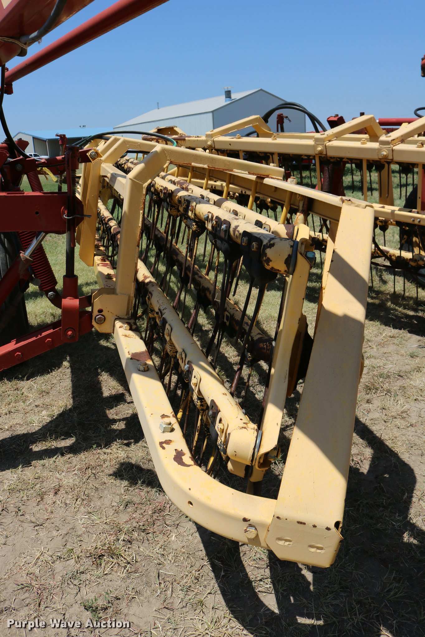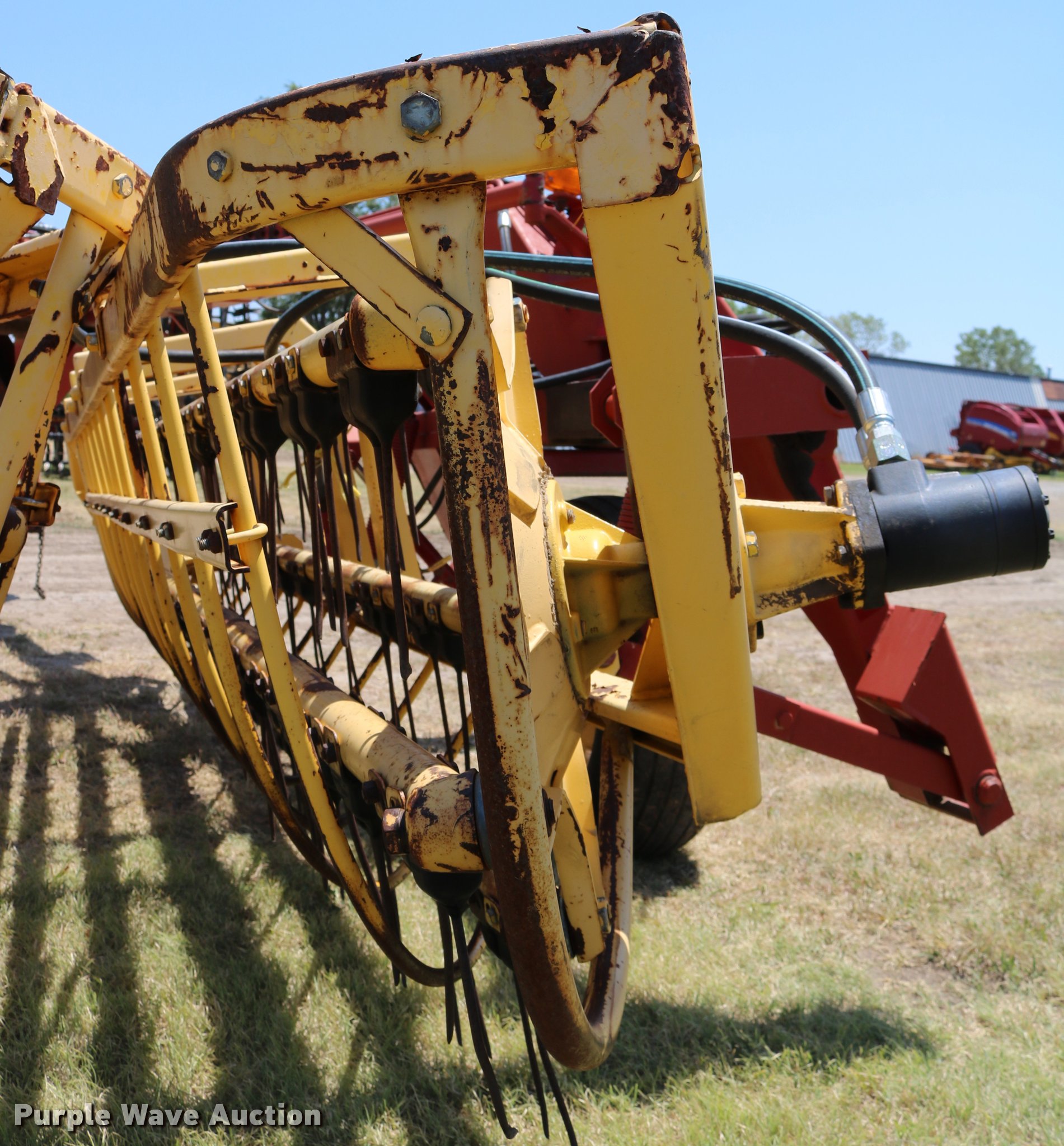 Purple Wave is selling a used Hay Rake in Kansas. This item is a 2004 New Holland 216 hay rake with the following: 27' max raking width, 10.5' basket on each side, Three tine kick, (2) hydraulic remotes, Char-Lynn hydraulic motors, Serial 101-1013-009, Hydraulic driven, Clevis hitch, 11L-15SL tires, Some teeth missing, Crank handle on jack missing, Clevis hitch cracked, Serial 663108, Unit# 170146