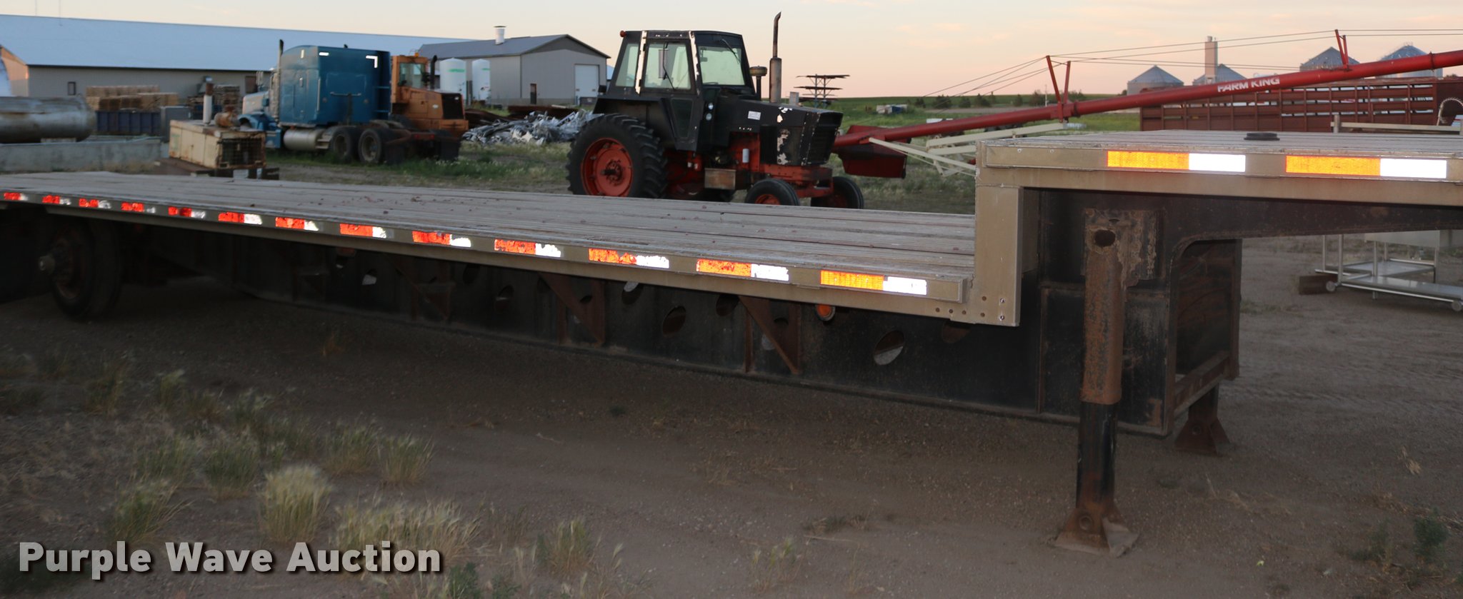 Purple Wave is selling a used Flat or Drop Deck Trailer in South Dakota. This item is a 1999 Talbert TSDW-80K-T1-C drop deck equipment trailer with the following: 48'L x 102"W, 118"L top deck, 37'8"L main deck, 39" floor height, Aluminum, steel, and wood deck, Stake pockets, Fifth wheel plate, Dual leg two speed landing gear, Air suspension, Air brakes, Tandem axle, Steel wheels, 255/70R22.5 tires, GVWR 80,000 lbs, GAWR 20,280 lbs, Two wheel and tires missing on right side