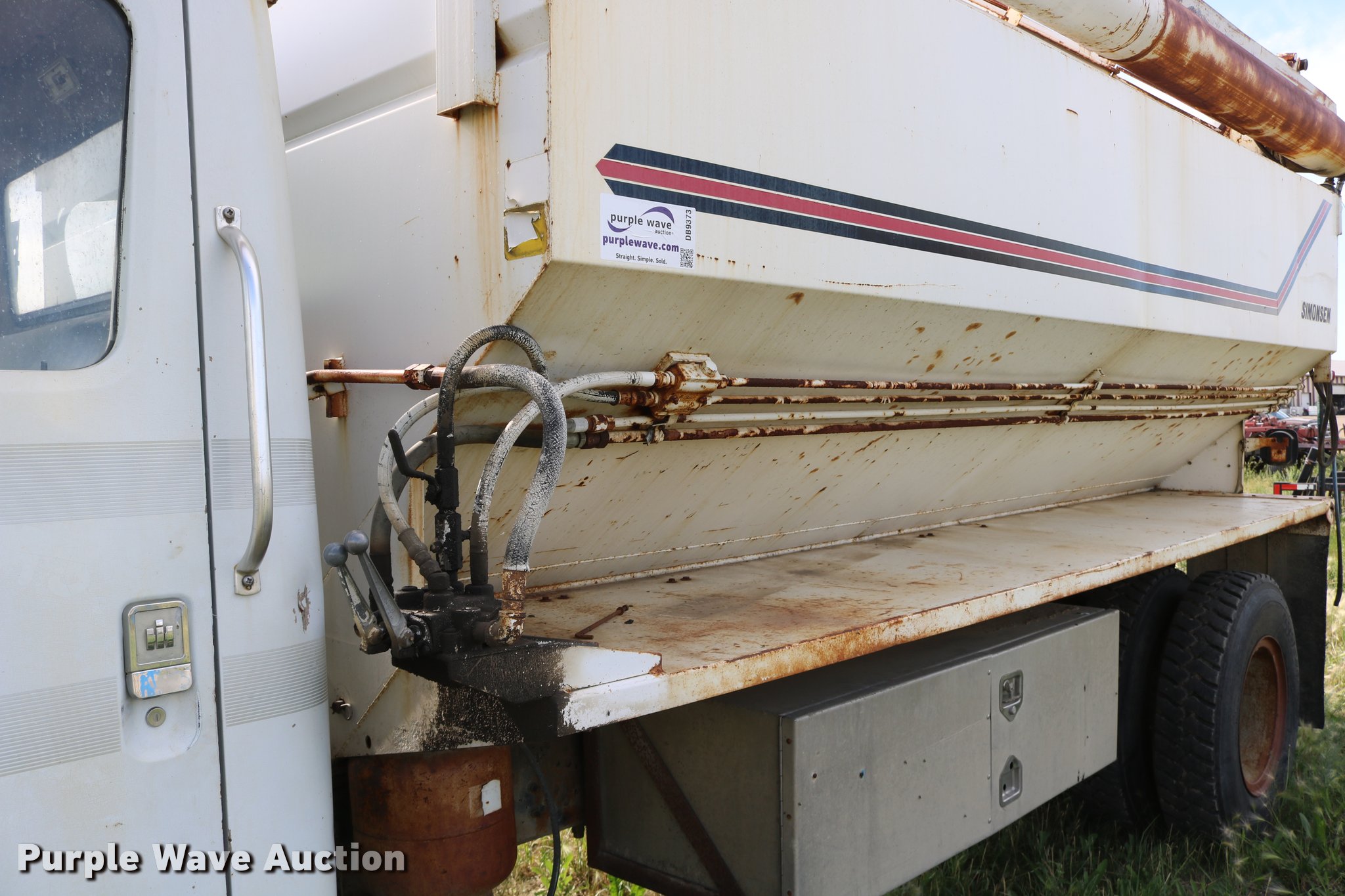 Purple Wave is selling a used Feed Mixer Truck in South Dakota. This item is a 1980 International 1854 feed truck with the following: 30,505 miles on odometer, 8,108 hours on meter, International eight cylinder diesel engine, Manual transmission, Two speed rear end, Propane cab heater, Simonsen V74-9 feed box, Eight ton capacity, 25.5" auger, Serial 1278703, 188" wheelbase, 11R22.5 front tires, 10.00R20 rear tires, No batteries, Engine hood latch on passenger side missing, Broken windshield, Unknown operating condition