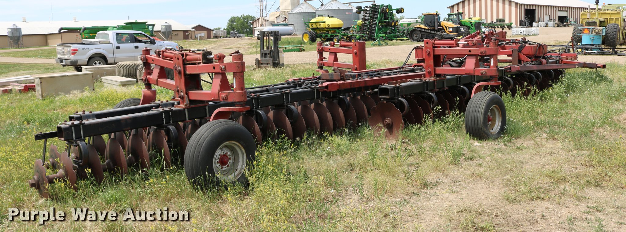 Purple Wave is selling a used Disk in South Dakota. This item is a Case IH off-set disk with the following: Model 696DH047000, 42'W, 25.5" diameter front blades, 24" diameter rear blades, Disk scrapers, Hydraulic leveler, Hydraulic lift and fold, Pin/clevis hitch, (4) 12.5x15 gauge wheels, (2) 40x14 tires, Serial CKB0001509
