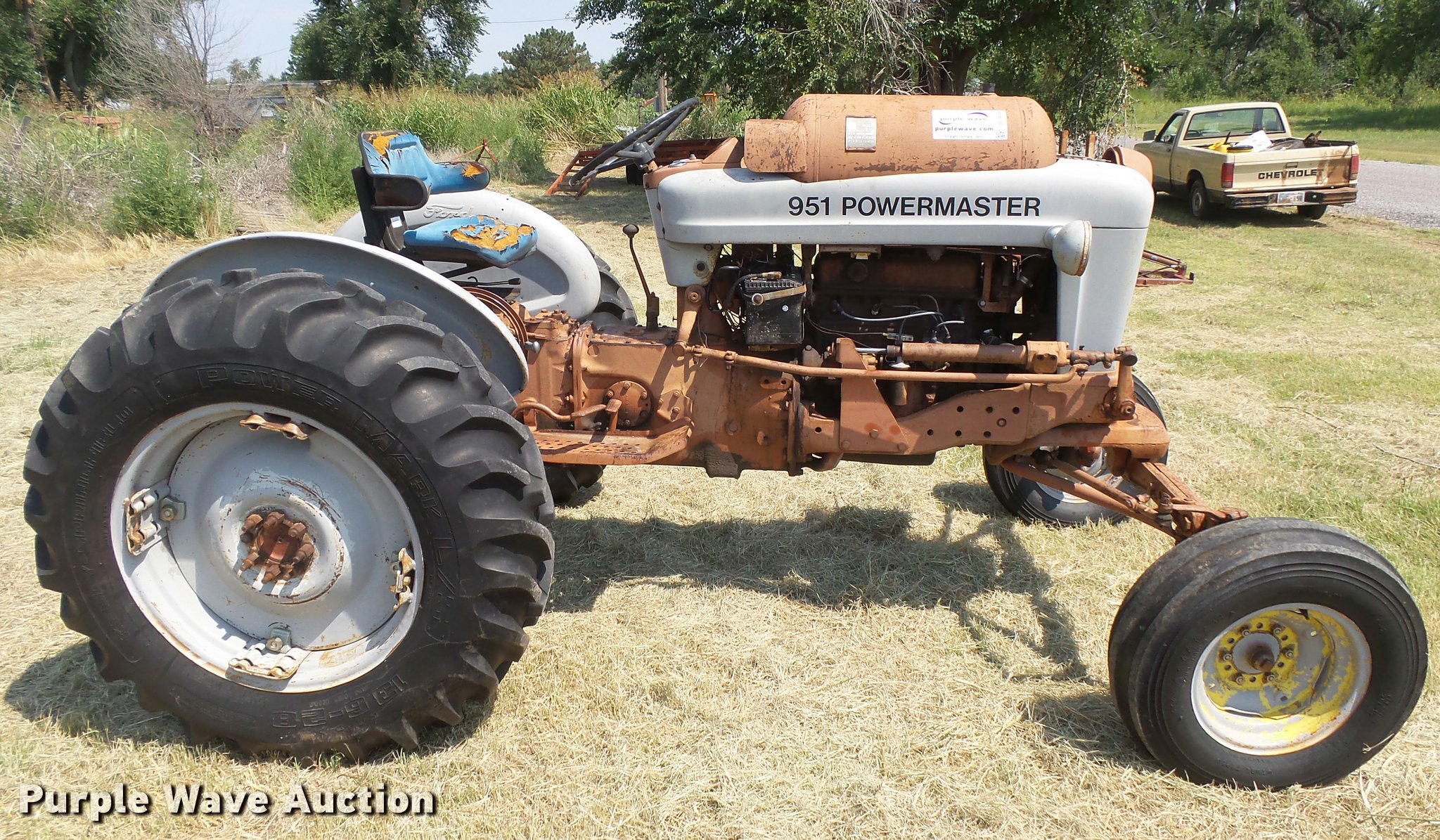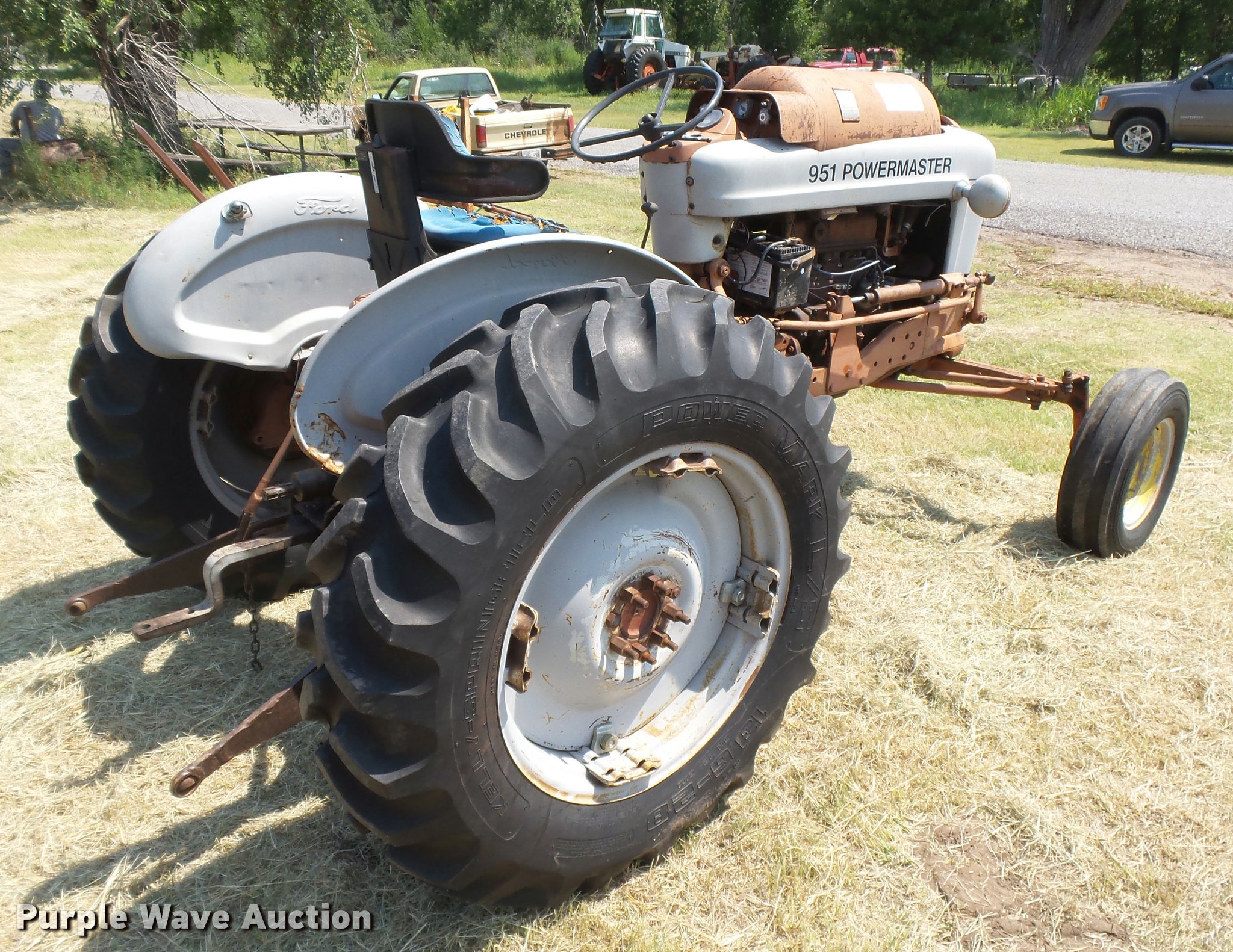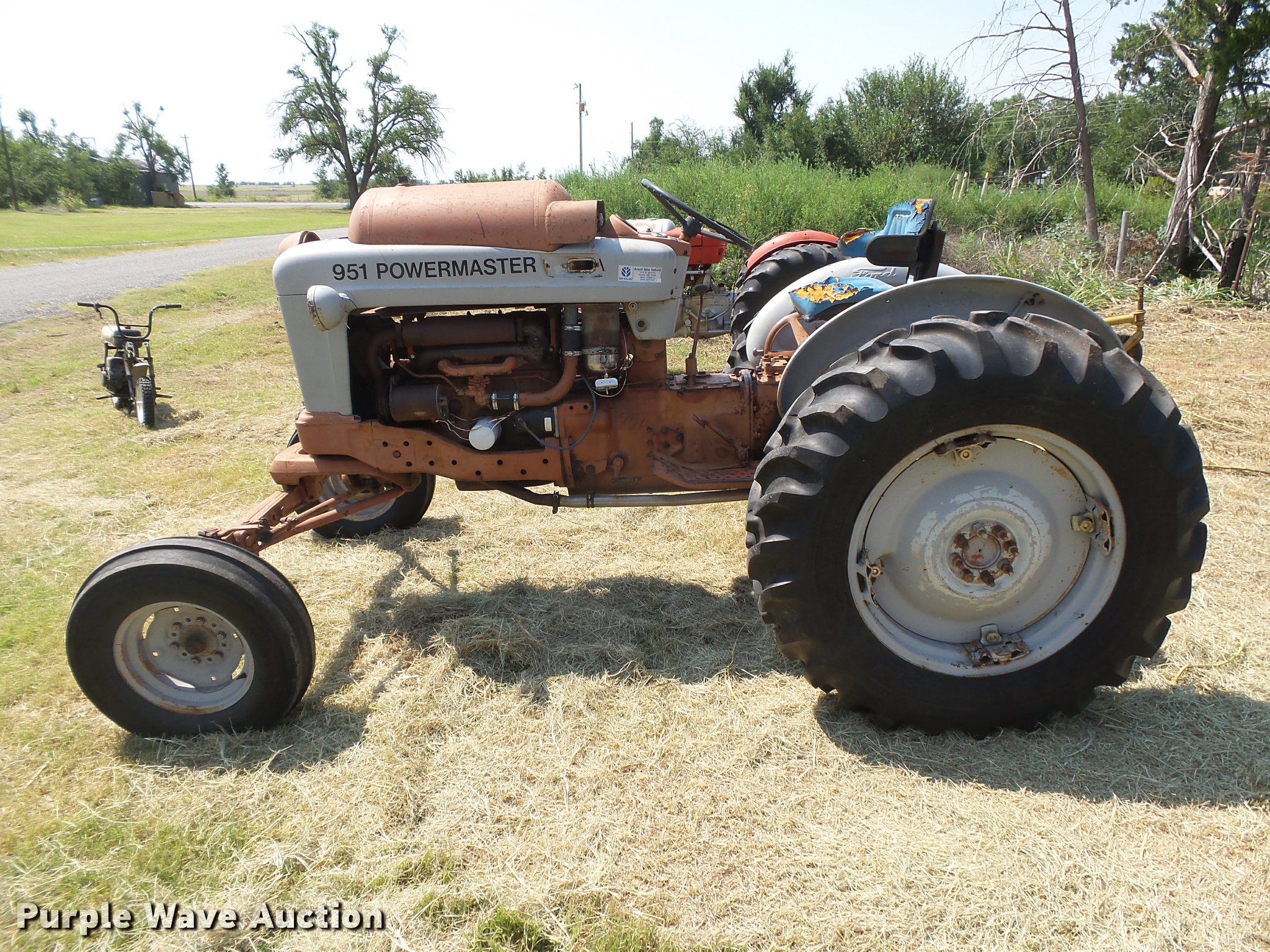 Purple Wave is selling a used Tractor in Oklahoma. This item is a Ford 951 Powermaster tractor with the following: Unknown hours on meter, Four cylinder propane engine, Manual transmission, 5F-1R gears, Suspension seat, Three point, 540 PTO, 7.50-15 front tires, 13.6-28 rear tires, Serial 5668137