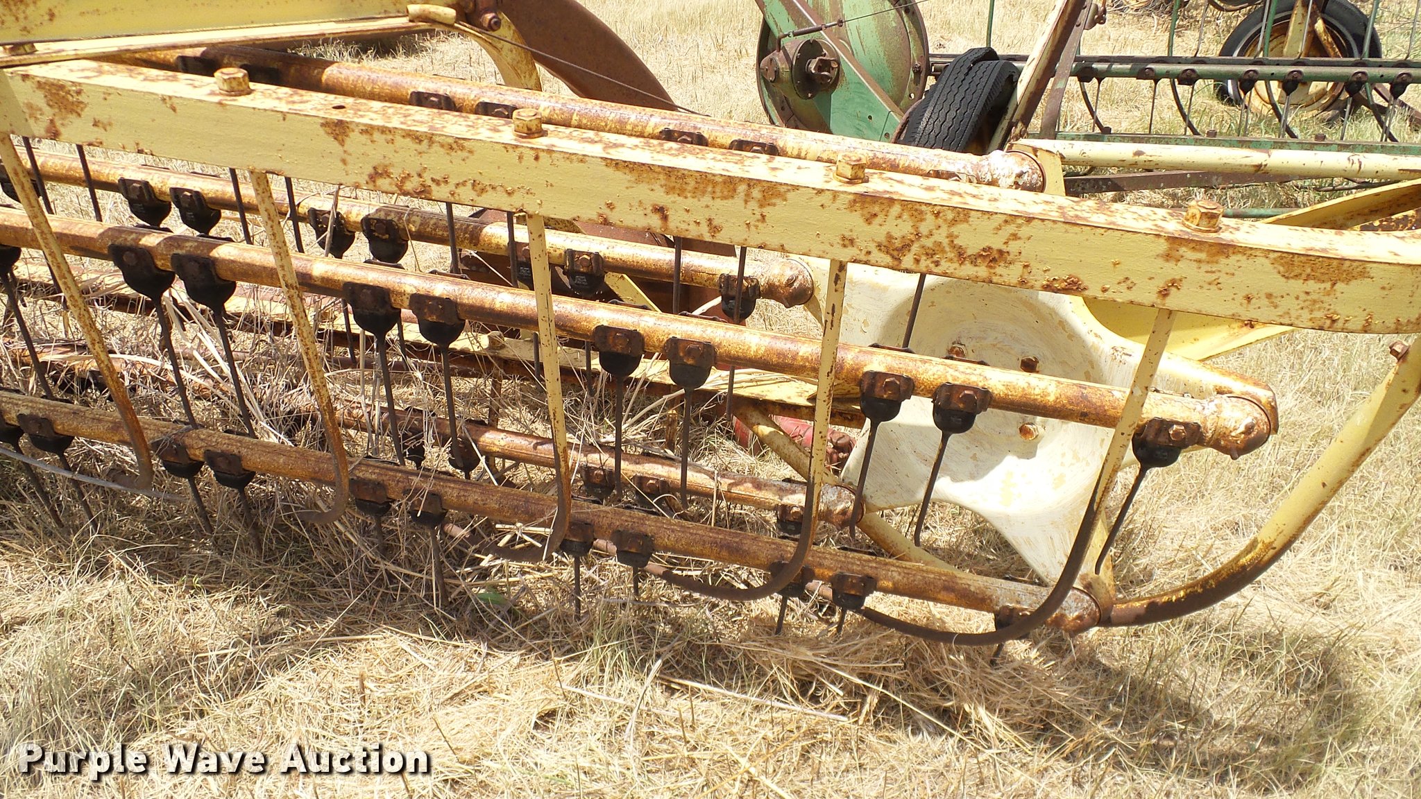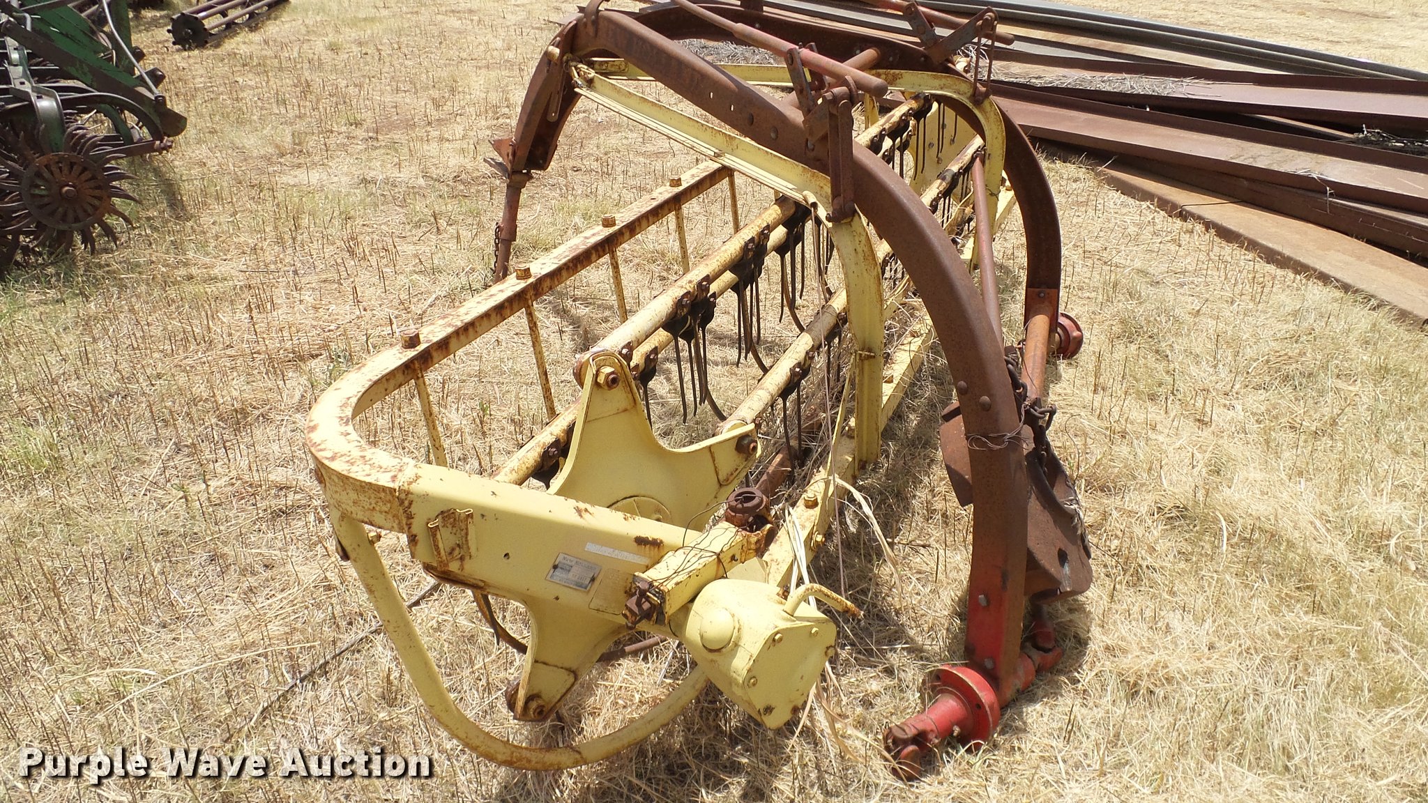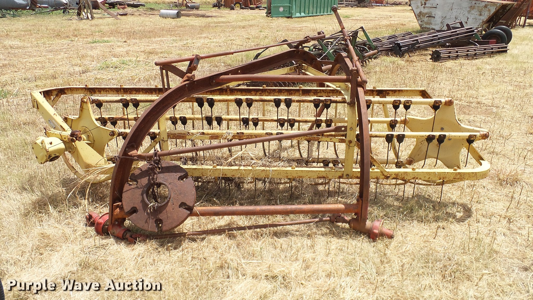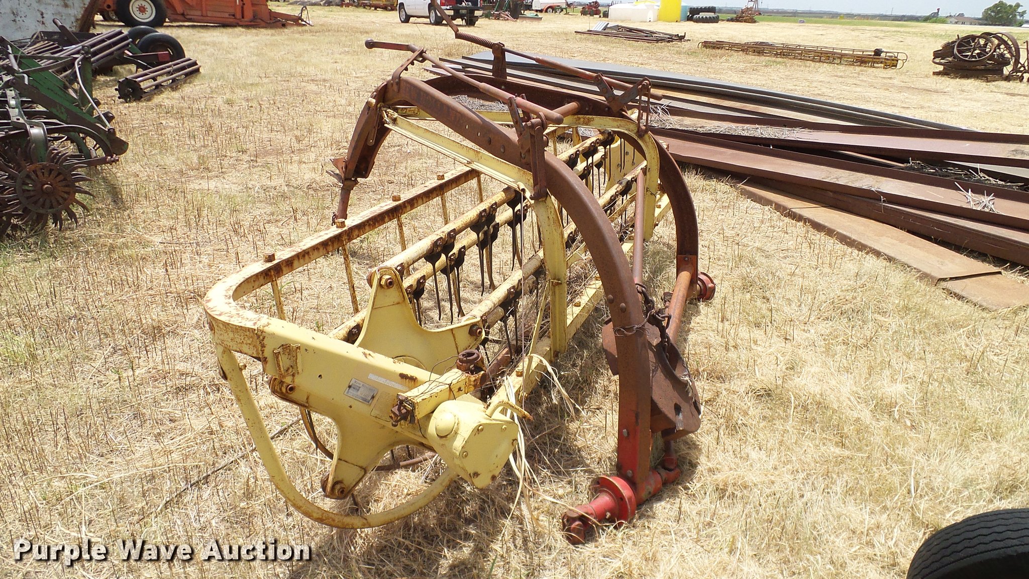 Purple Wave is selling a used Hay Rake in Oklahoma. This item is a New Holland 56 hay rake with the following: 10'W, Manual adjustment, Ground driven, Pin hitch, Four bolt hubs, No wheels or tires, Serial 47674