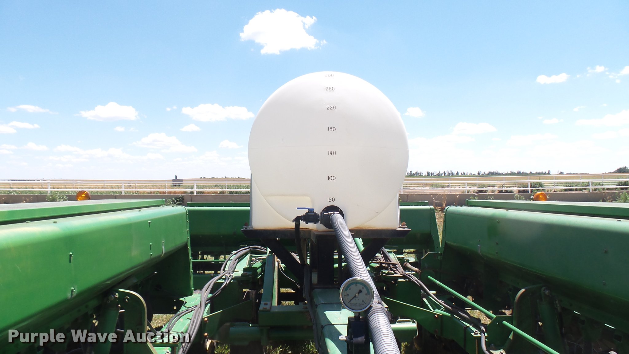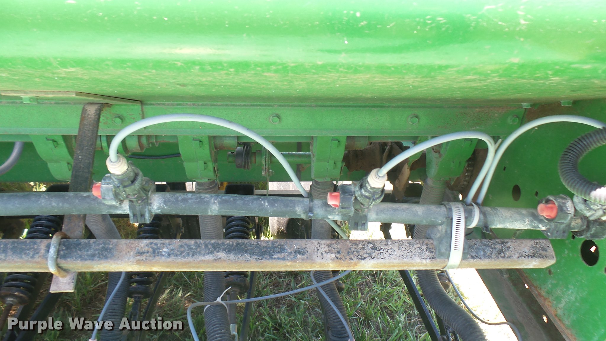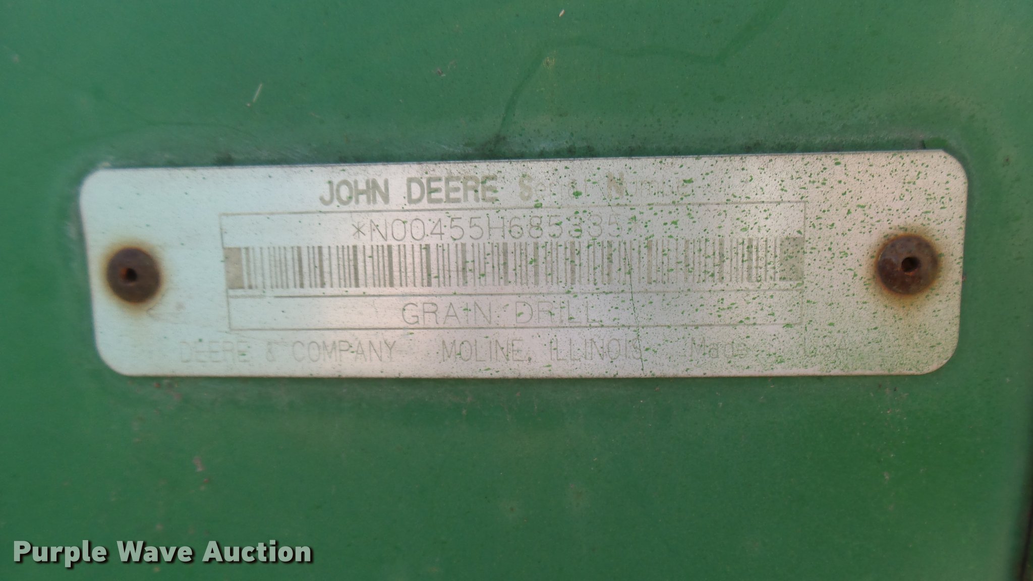 Purple Wave is selling a used Grain Drill or Seeder in Kansas. This item is a John Deere 455 grain drill with the following: 35'W, Three sections, 10" row spacing, Hydraulic lift and fold, Double disk openers, Rubber press wheels, 300 gallon liquid fertilizer tank, Transport lights, Pin/clevis hitch, Serial N00455H685335