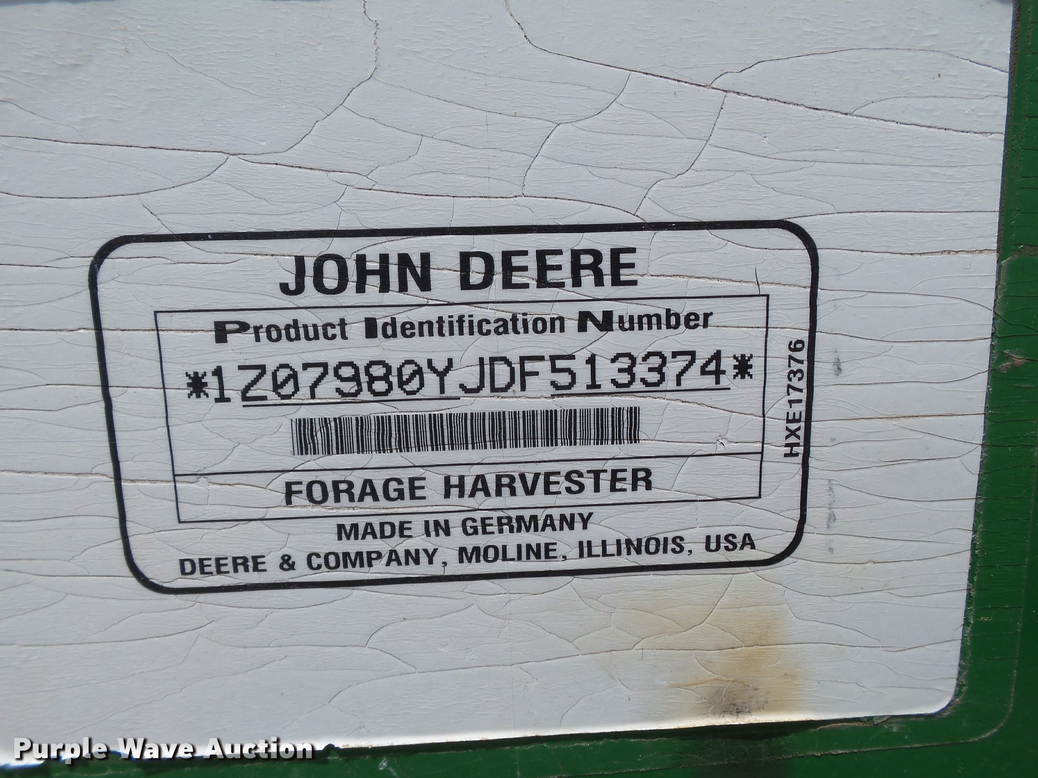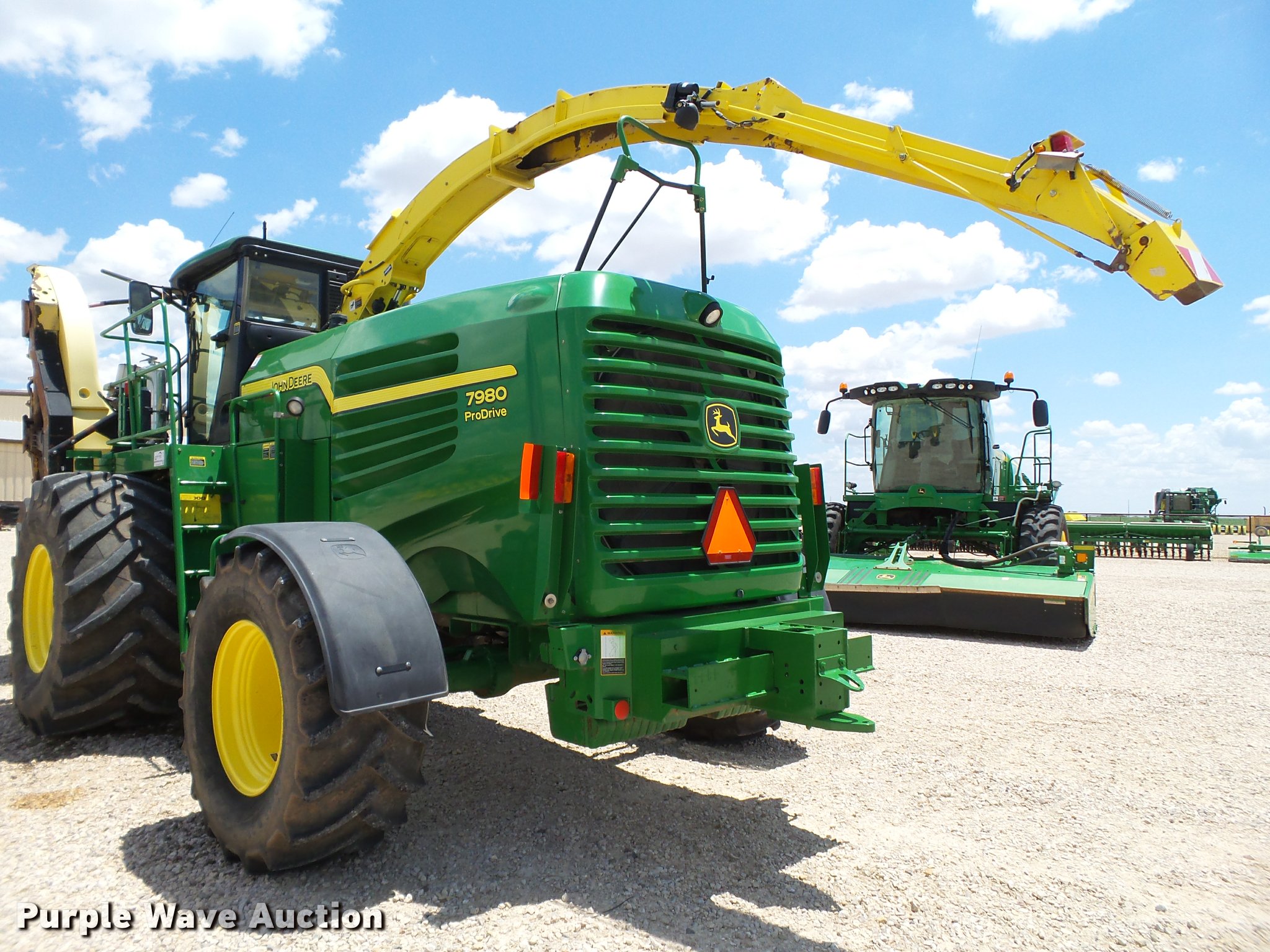 Purple Wave is selling a used Forage Harvester in Texas. This item is a 2014 John Deere 7980 forage harvester with the following: 1,910 engine hours on meter, 1,417 cutter hours on meter, Cummins QSK19 19L six cylinder turbo diesel engine, 800 HP, Serial 37259323, ProDrive hydrostatic transmission, AC and heat, Tilt steering wheel, AM/FM, Air suspension seat, Instructor's seat, On-board air, Auto lube, Silage additive spray system, High arch spout, GreenStar ready, Yield monitor, Rear hitch, 800/65R32 front tires, 600/65R28 rear tires, Head not included, Serial 1Z07980YJDF513374