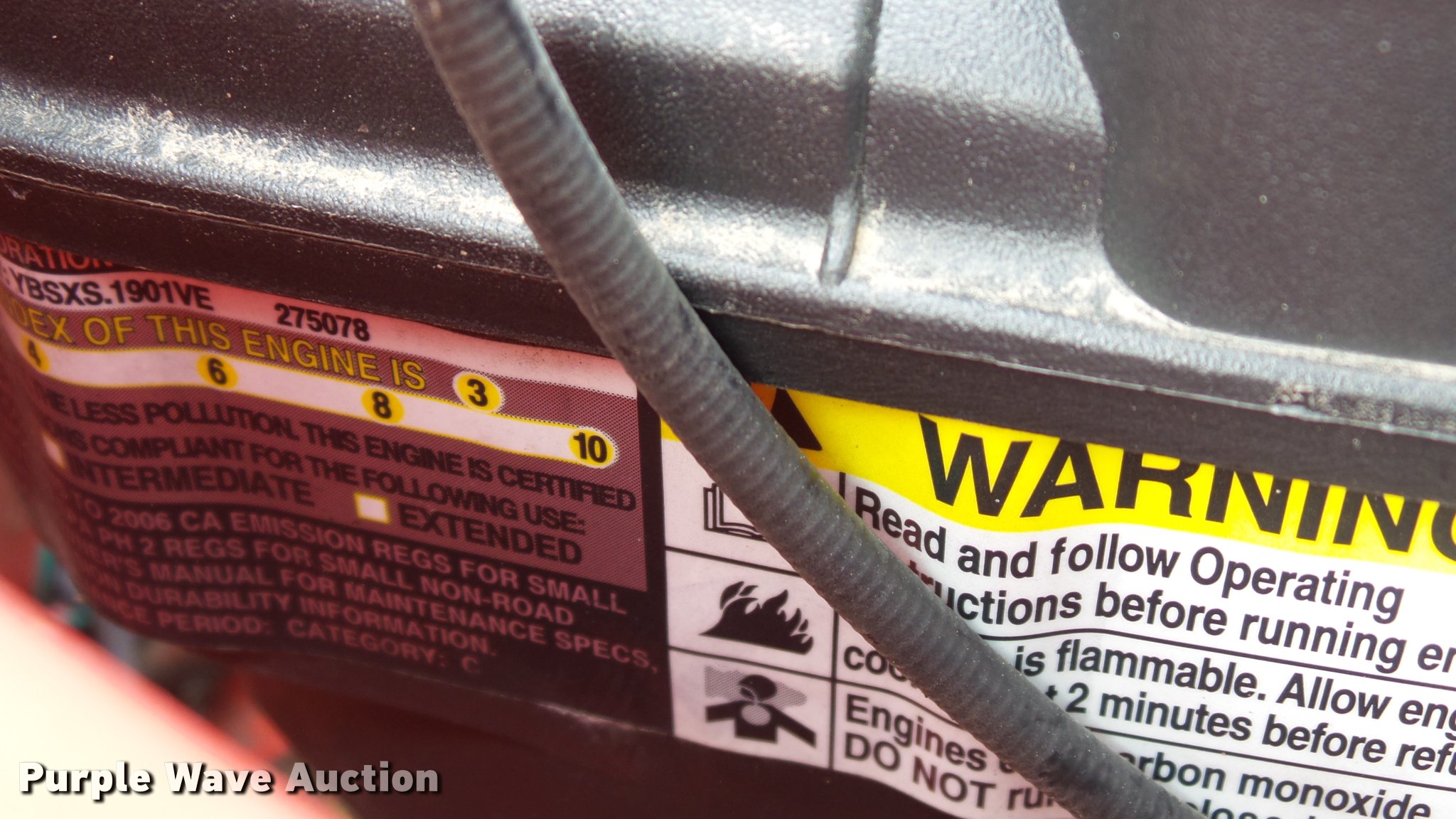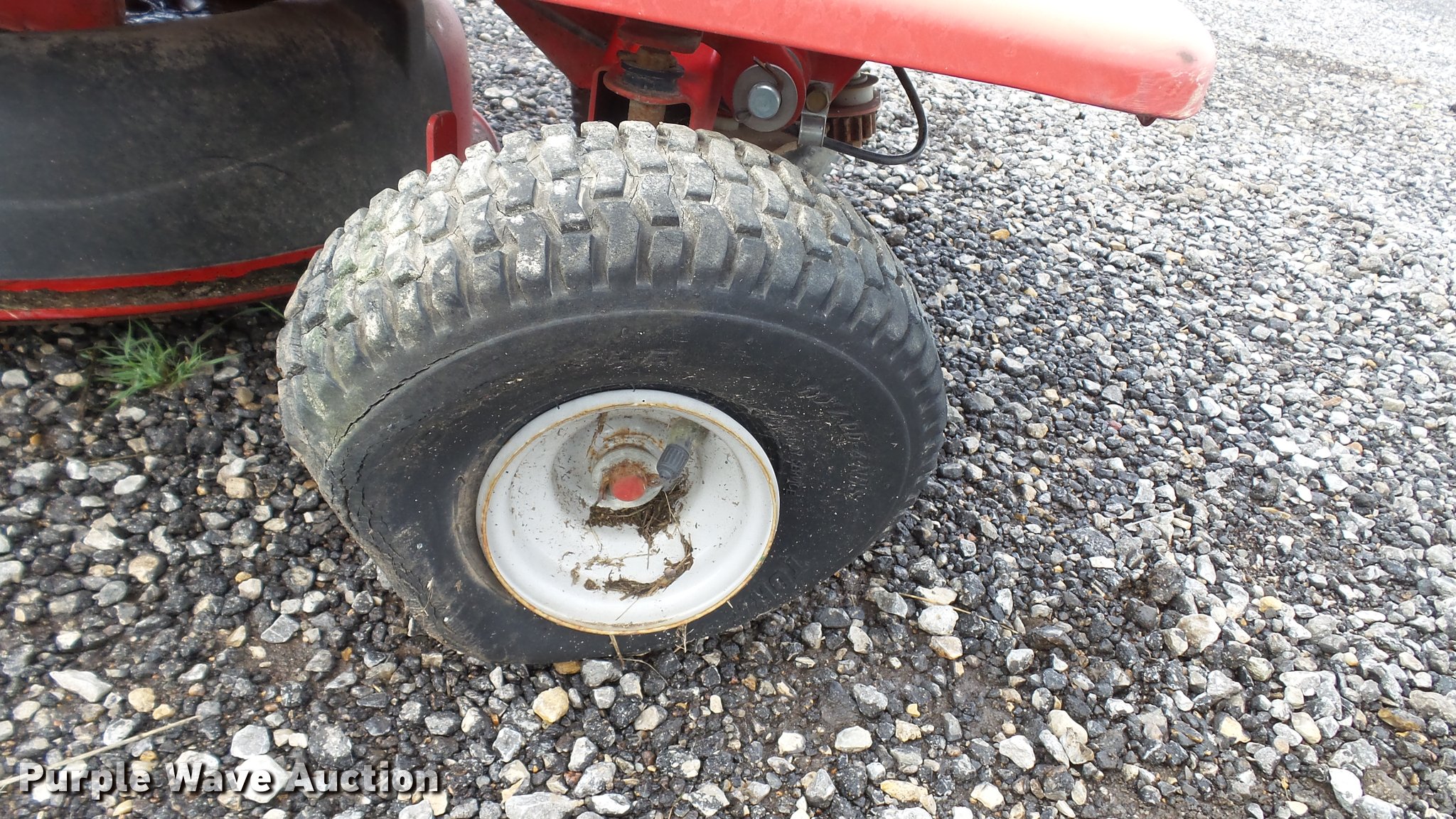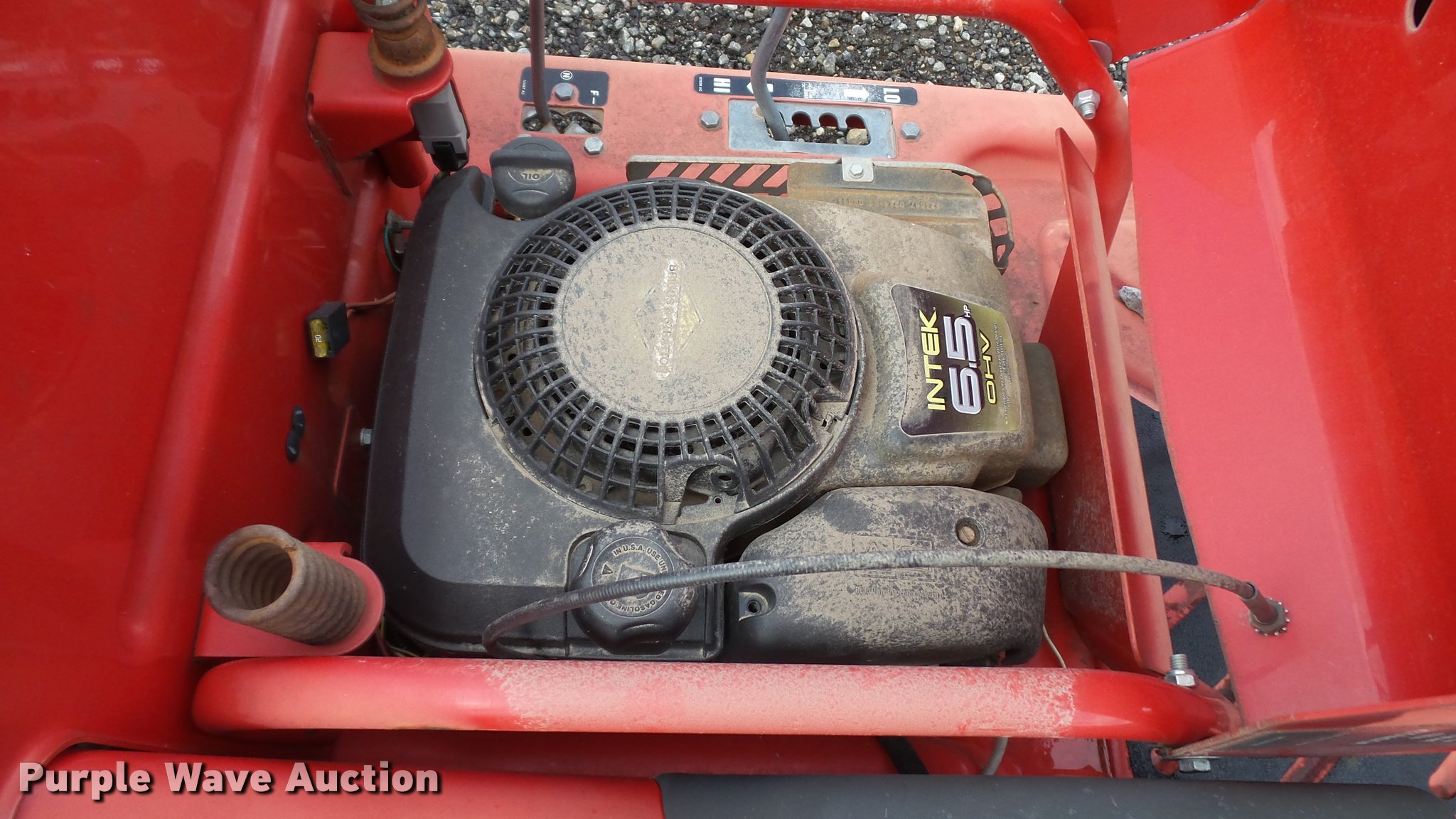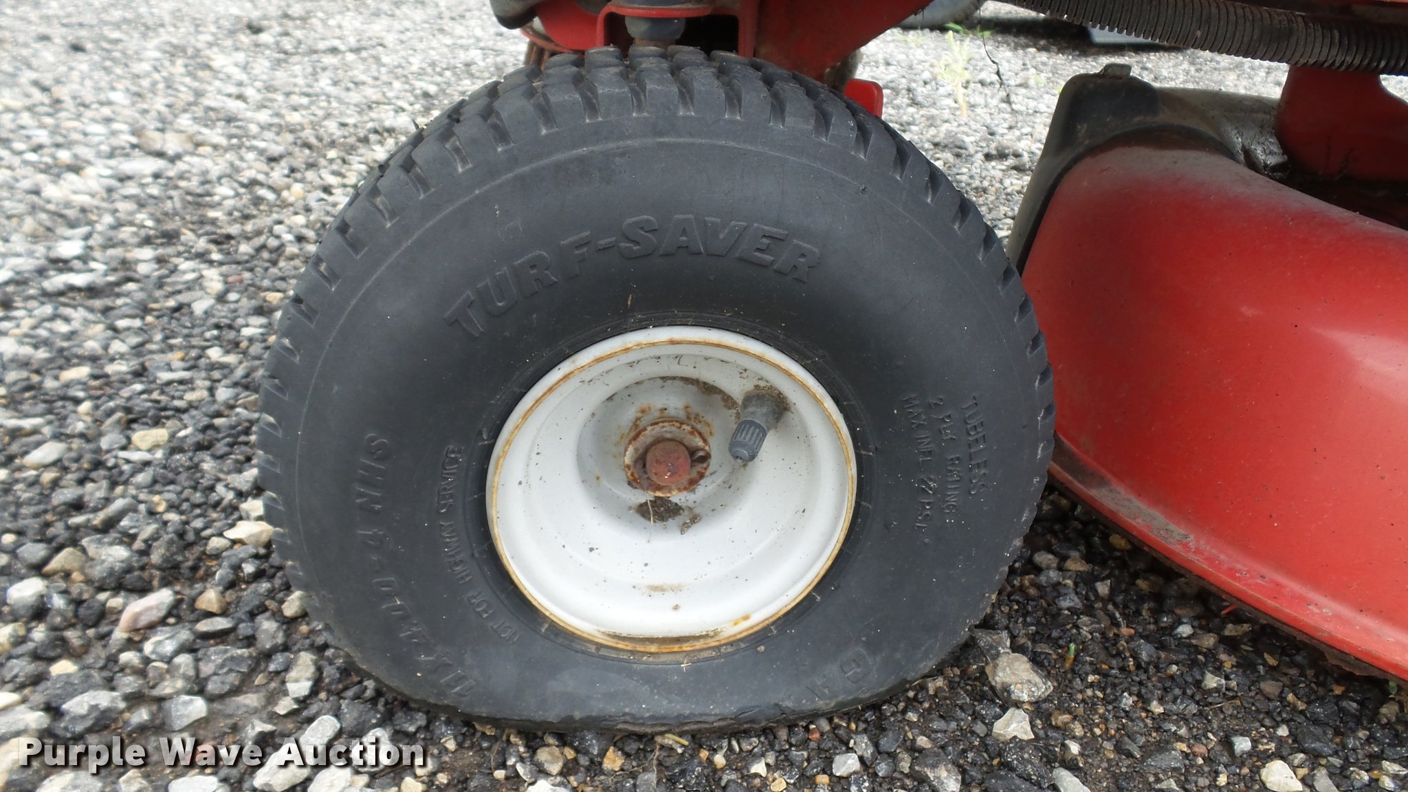 Purple Wave is selling a used Lawn Mower in Kansas. This item is a Yard Machines LUV Bug lawn mower with the following: 23.5" cut, Briggs & Stratton Intek single cylinder gas engine, 6.5 HP, Serial 275078, Hydrostatic transmission, Turf Saver 11x4.00-4 front tires, Carlisle 13x5.00-6 rear tires, Flat tire, One tire off bead, No key, Dead battery, Unknown operating condition, Serial 1B254I10074