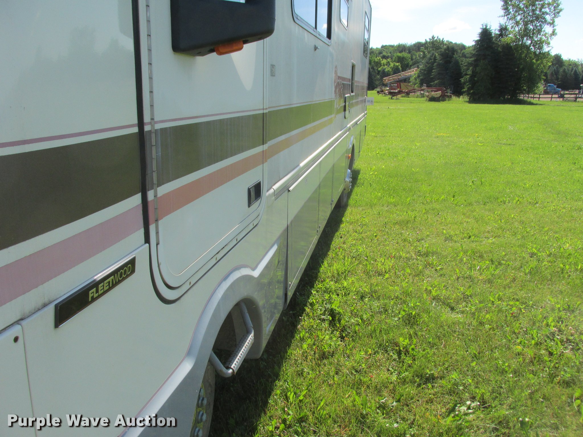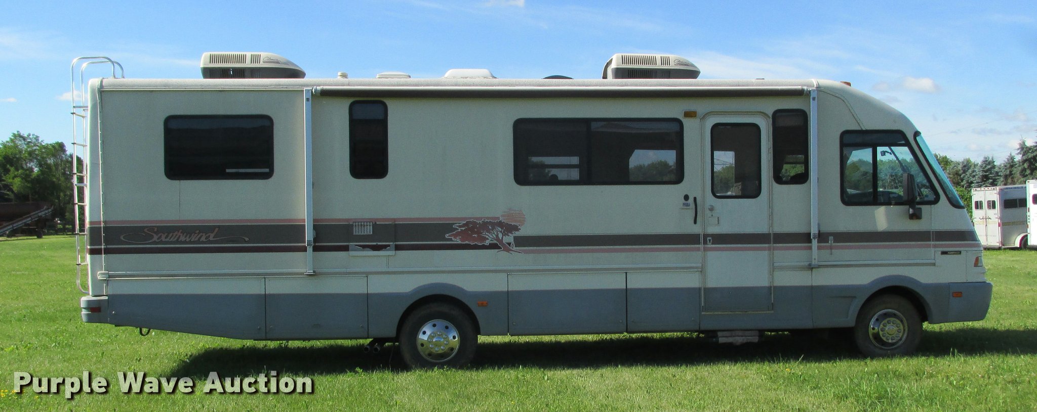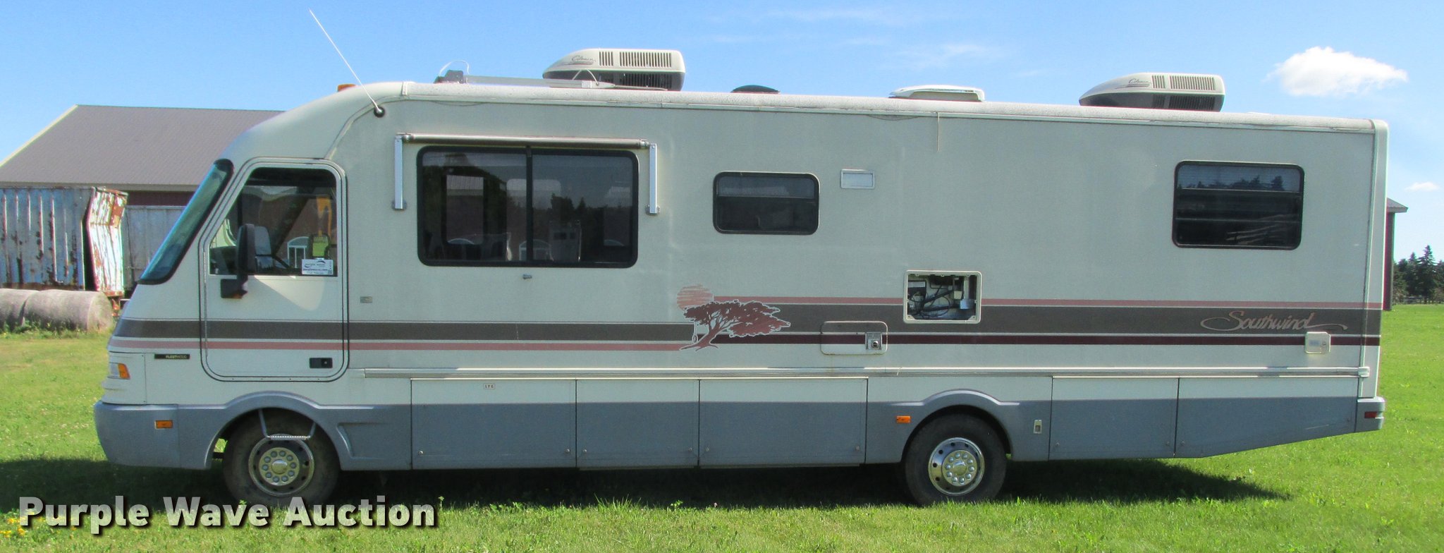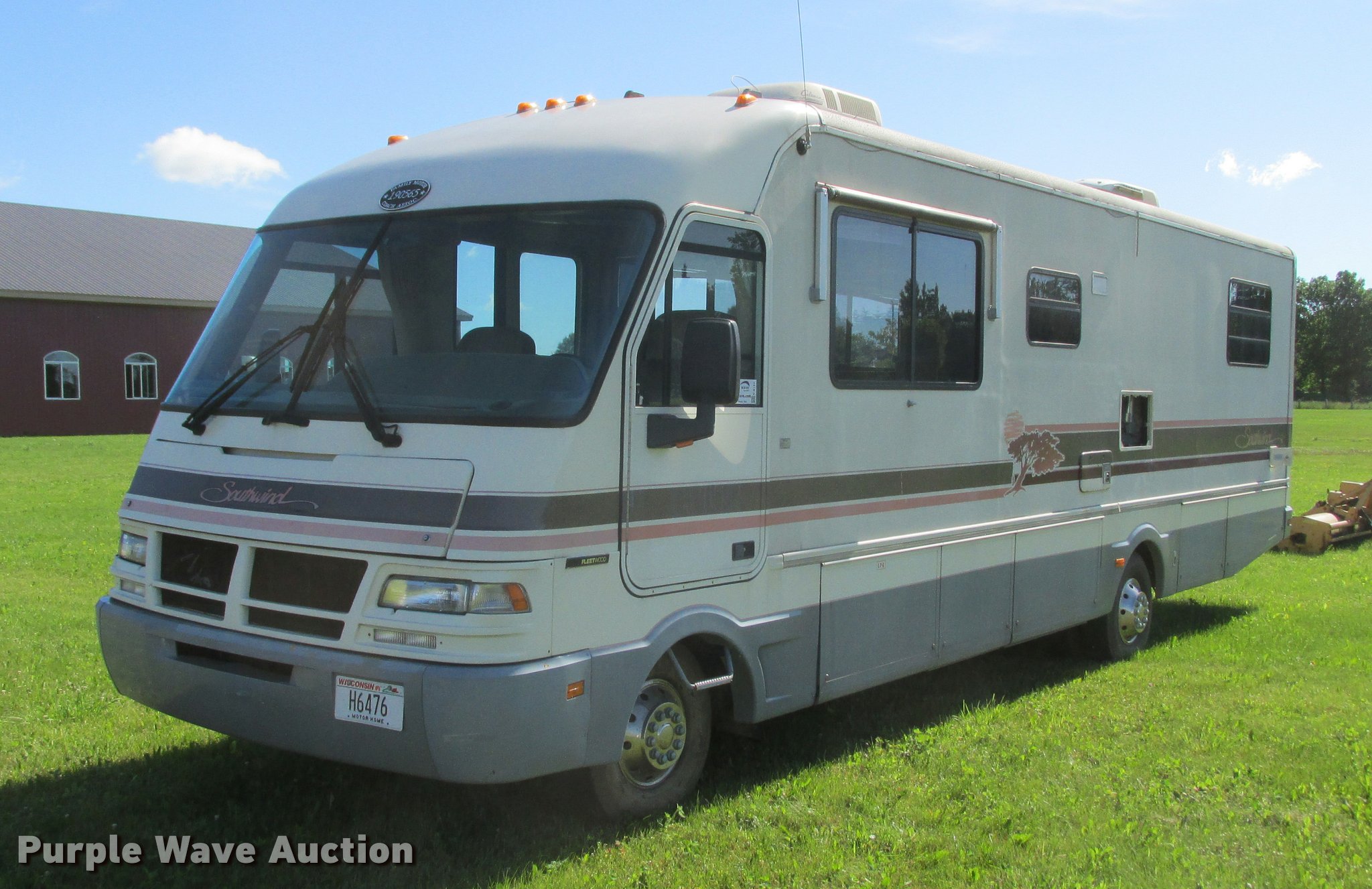Purple Wave is selling a used RV in Minnesota. This item is a 1992 Fleetwood Southwind RV with the following: 32'L, 460 C.I.D. eight cylinder gas engine, Automatic transmission, AC and heat, AM/FM/cassette, Heated mirrors, Cloth interior, Awning, Generator, Dual rooftop AC units, Propane stove, Microwave, Sink, Storage cabinets, Refrigerator/freezer, Bathroom, Television, Master bedroom, Power entry steps, Roof access ladder, Receiver hitch, Trailer wiring, 265/75R16 front tires, 235/85R16 rear tires