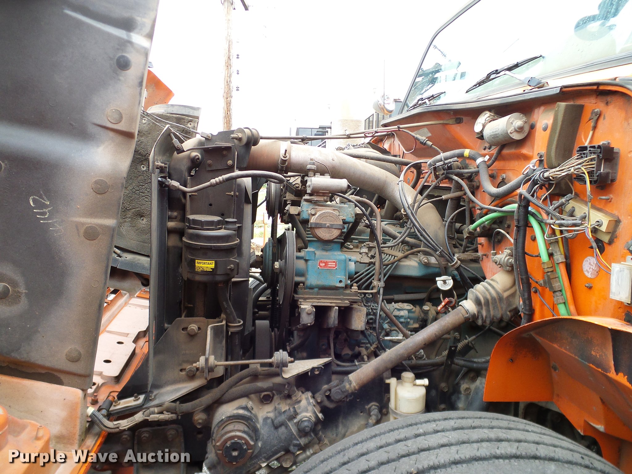 Purple Wave is selling a used Bucket Truck in Oklahoma. This item is a 1993 International 4900 bucket truck with the following: 564 miles on odometer, 2,537 hours on meter, 5,372 hours on additional meter, International DT466 7.6L L6 turbo diesel engine, Automatic transmission, Single axle, AC and heat, AM/FM, Spring suspension seat, Trailer brake controller, Beacon light, Front tow hooks, PTO, Vec TP4294SP4 service bed, 16'L, Shelving, Slide out drawers, Utility rack, Catwalk, Work lights, 1979 Terex C-130 boom, Platform controls, Boom rotation, 18" diameter auger, Serial 130-638LK, Single exhaust stack, Single fuel tank, Pintle hitch, Trailer wiring, 192" wheelbase, Air brakes, 11R22.5 tires, Unknown operating condition, Non-operational brakes, Vehicle must be towed or hauled, Unit# 609