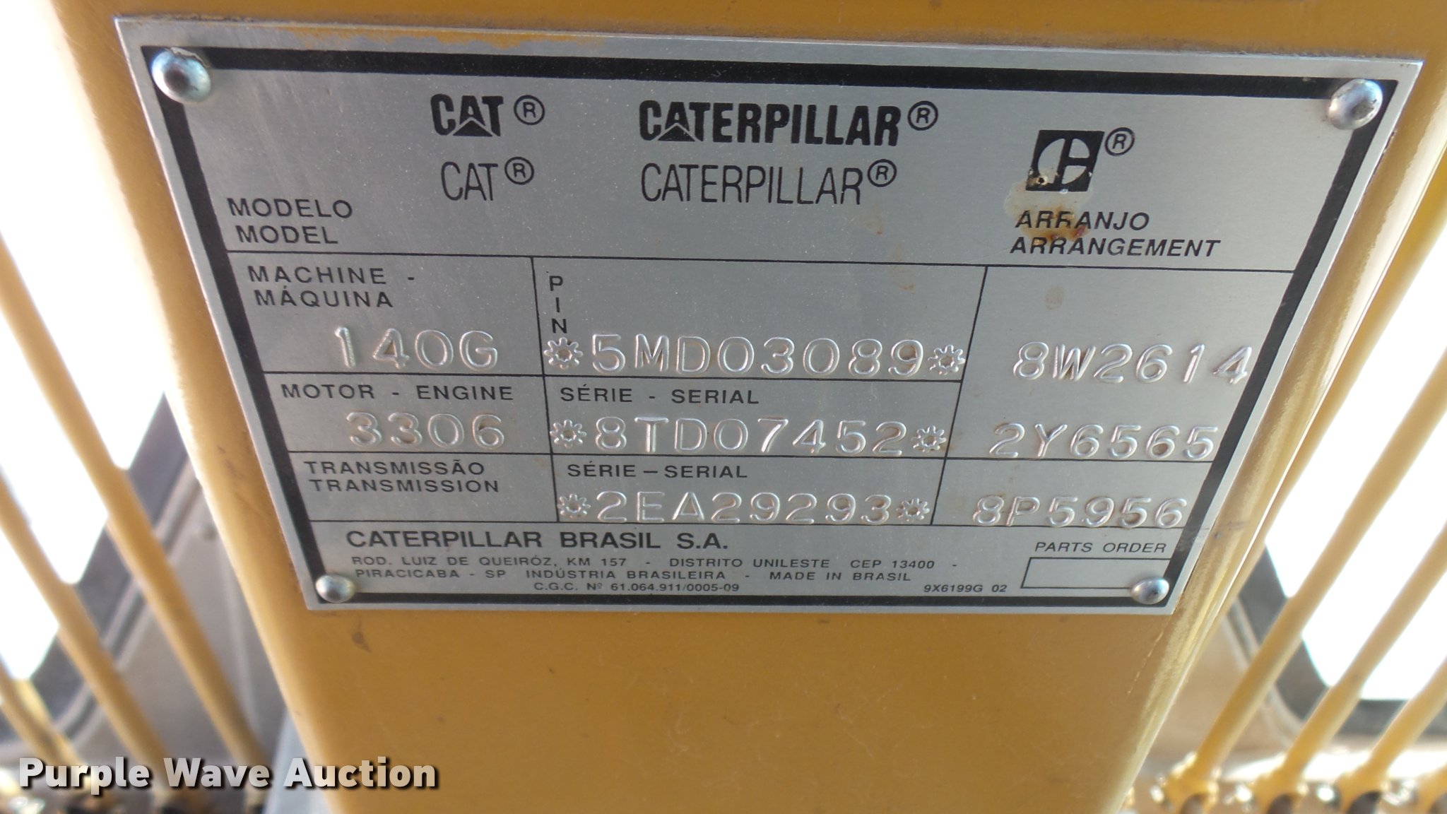 Purple Wave is selling a used Motor Grader in South Dakota. This item is a 1994 Caterpillar 140G motor grader with the following: 9,720 hours on meter, Caterpillar 3306 six cylinder diesel engine, Serial 8TD07452, Powershift transmission, 6F-6R gears, EROPS, AC and heat, AM/FM, Suspension seat, Front and rear work lights, Tip control, Side shift, Front mounted scarifier, 17.5-25 tires, Serial 5MD03089, Unit# MG-1