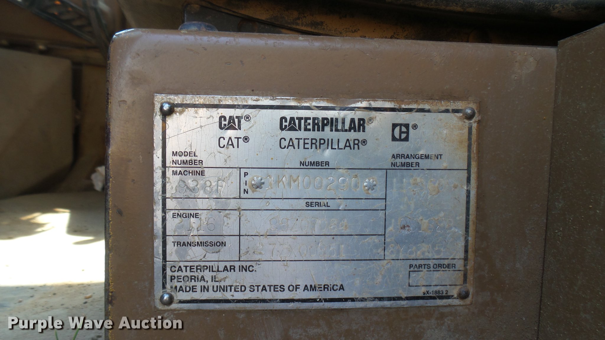 Purple Wave is selling a used Wheel Loader in South Dakota. This item is a 1994 Caterpillar 938F wheel loader with the following: 24,313 hours on meter, Caterpillar 3116 six cylinder turbo diesel engine, 140 HP, Powershift transmission, 4F-4R gears, EROPS, Heat, AM/FM, Suspension seat, Two-lever bucket controls, Loadrite LR915 scale and printer, Wipers, Front and rear work lights, 9'W general purpose bucket, Bolt-on cutting edge, Michelin 20.5R25 tires, Serial 1KM00290