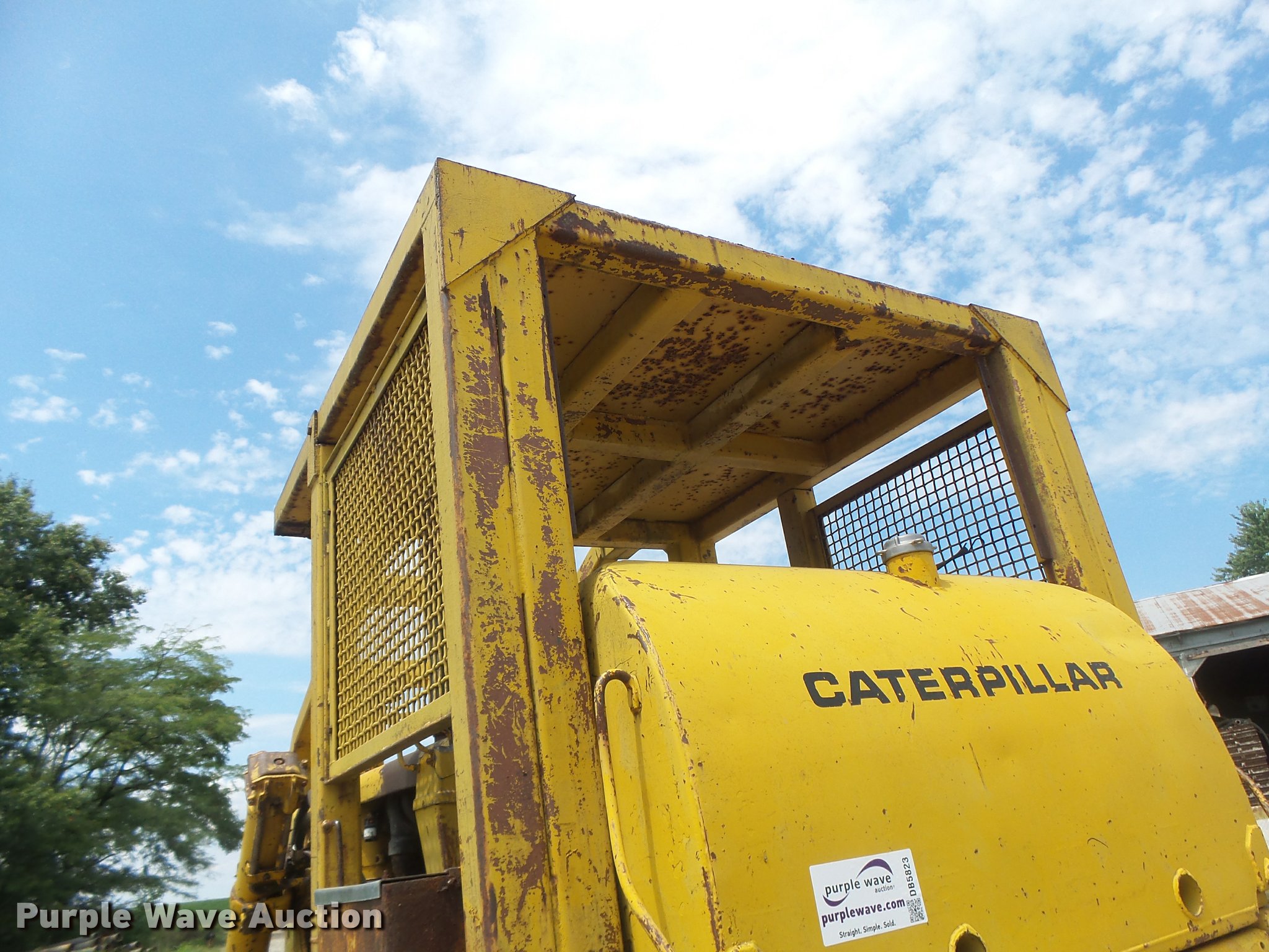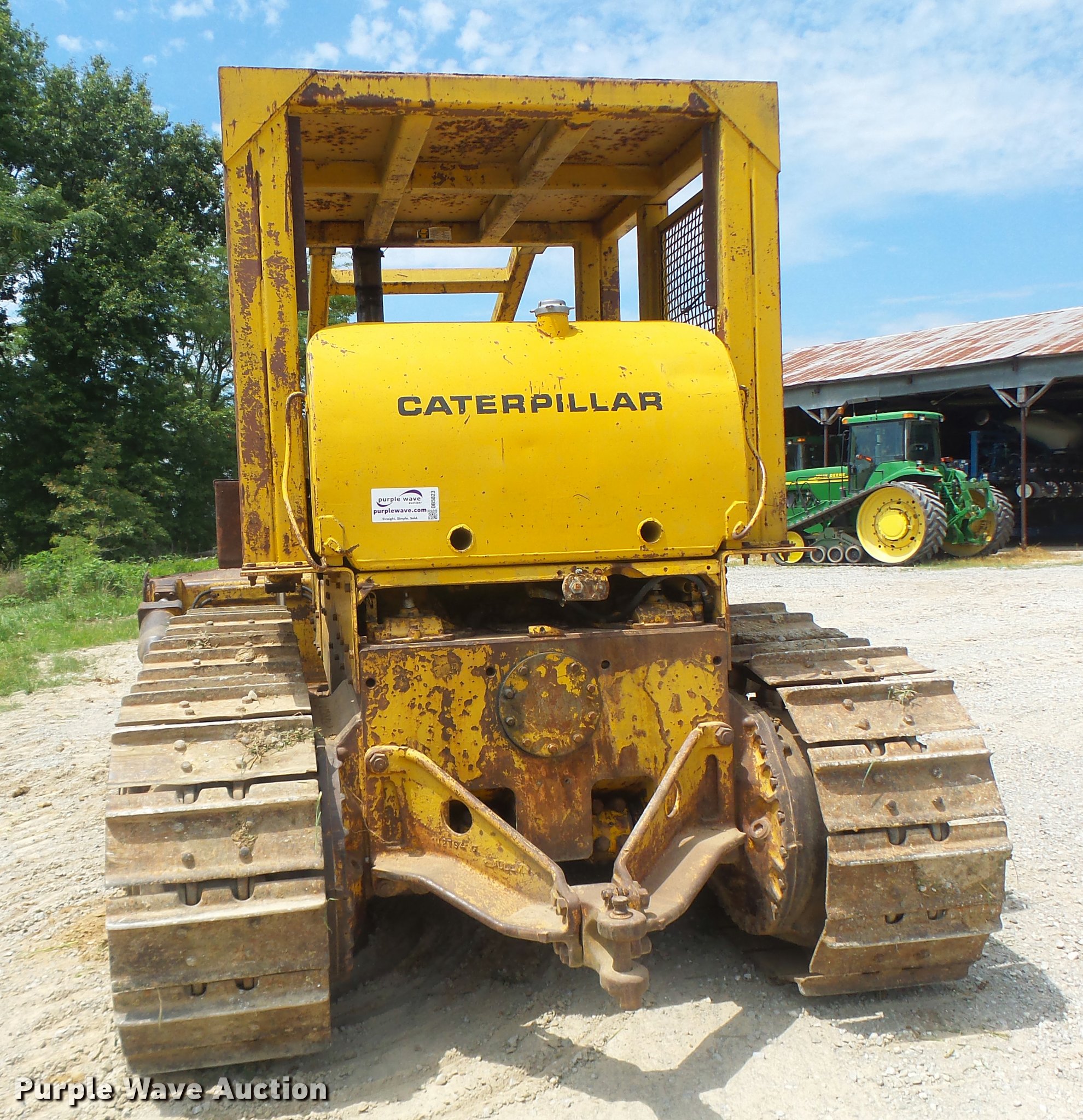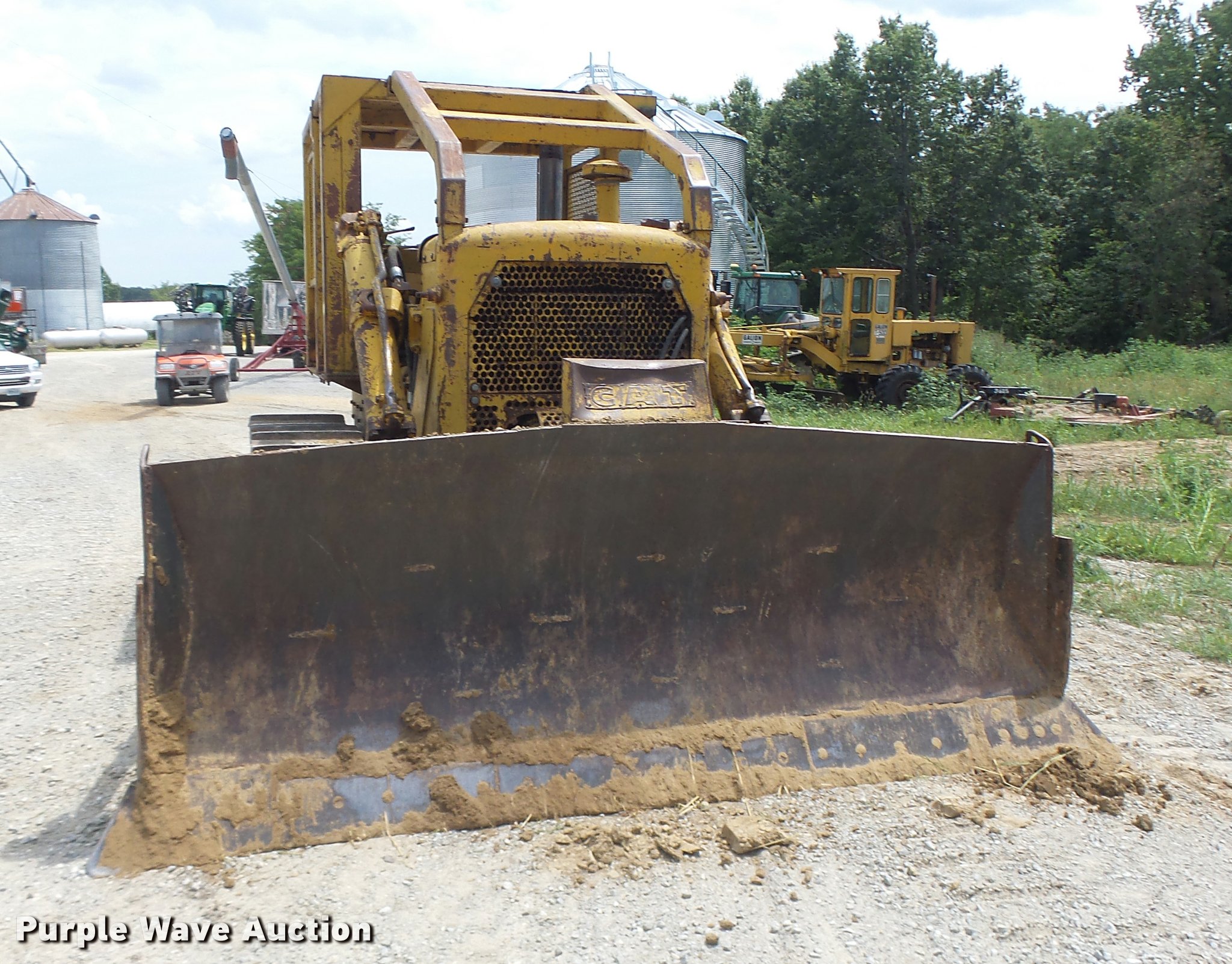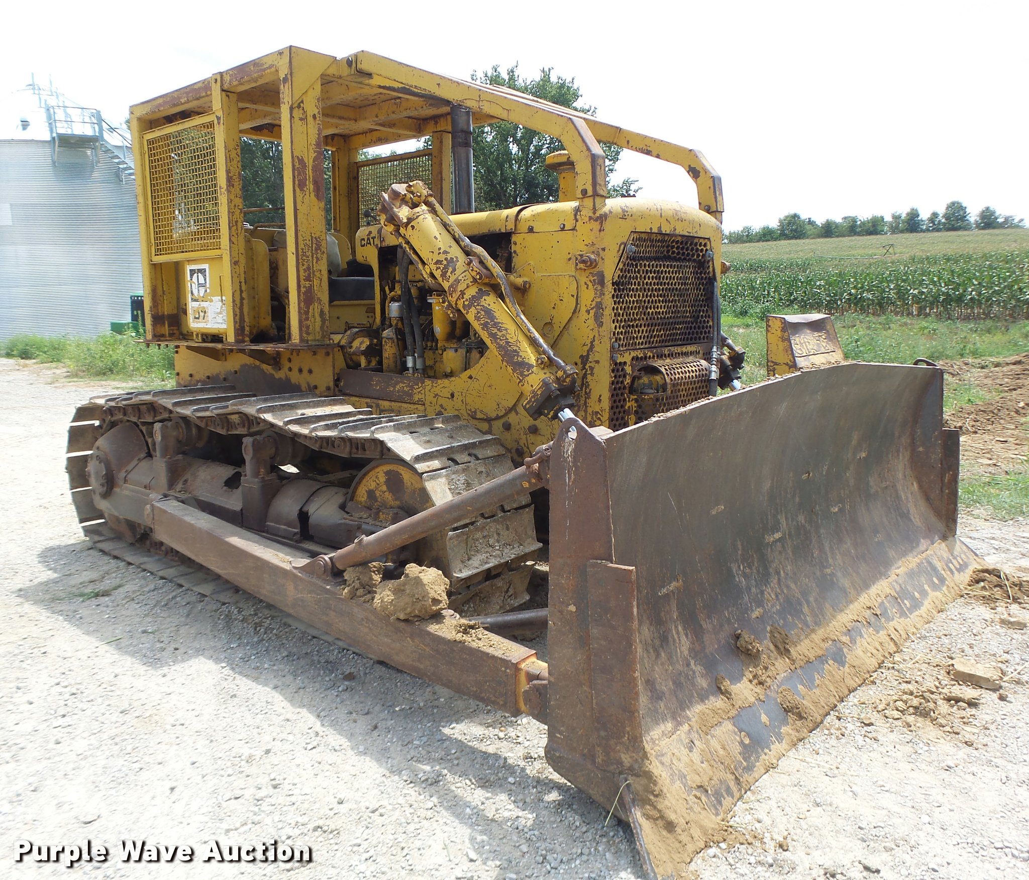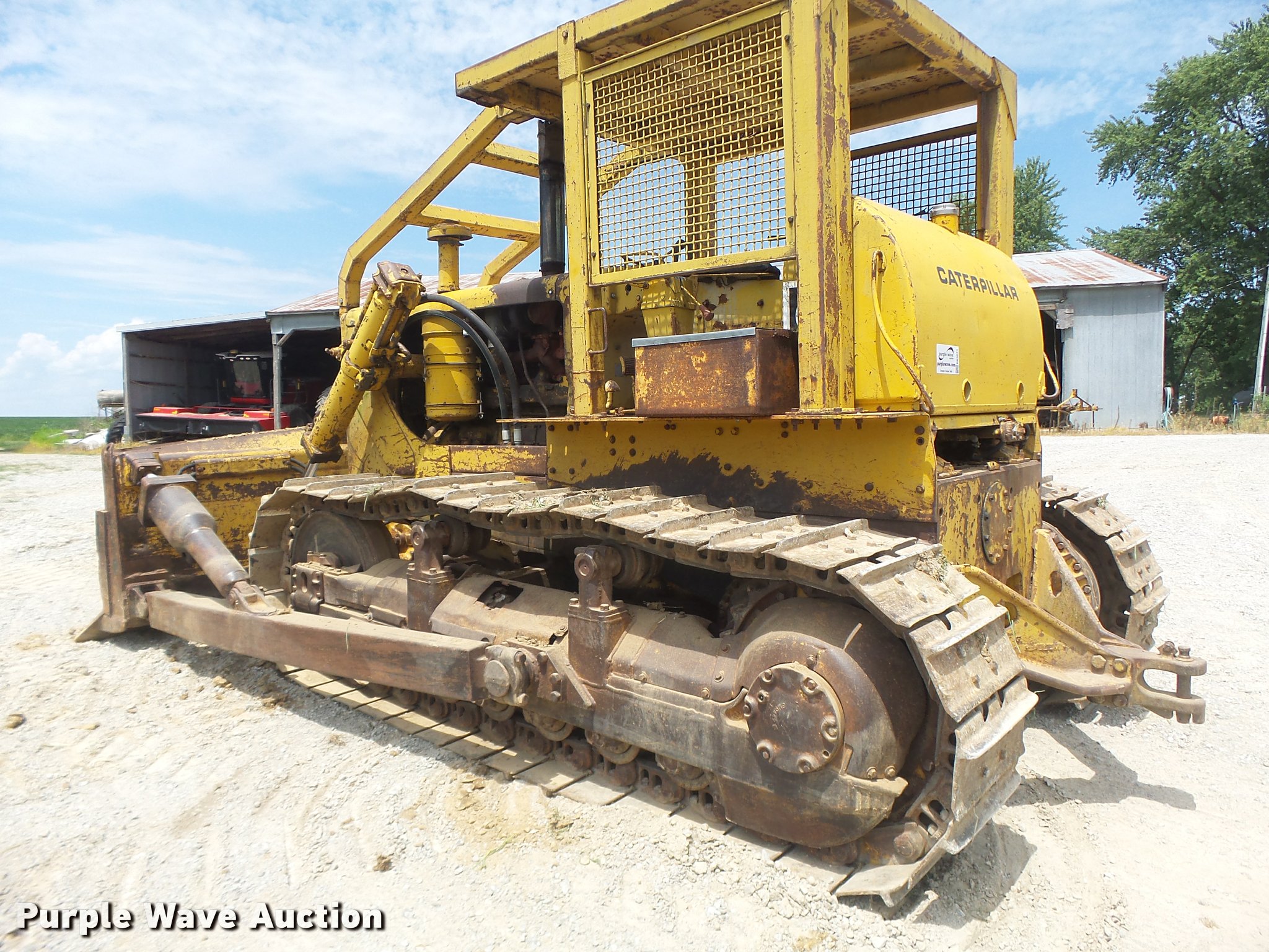 Purple Wave is selling a used Crawler Dozer in Missouri. This item is a 1963 Caterpillar D7E dozer with the following: Unknown hours on meter, Caterpillar four cylinder turbo diesel engine, Powershift transmission, 3F-3R gears, Canopy, Suspension seat, Sweeps, 141" angle dozer blade, Rear hitch, Six bottom rollers, 22" single grouser track pads, Serial 48A2384