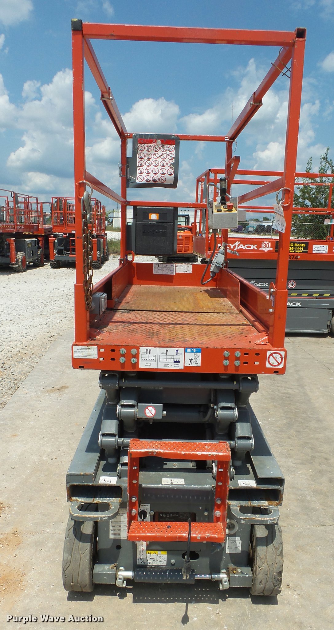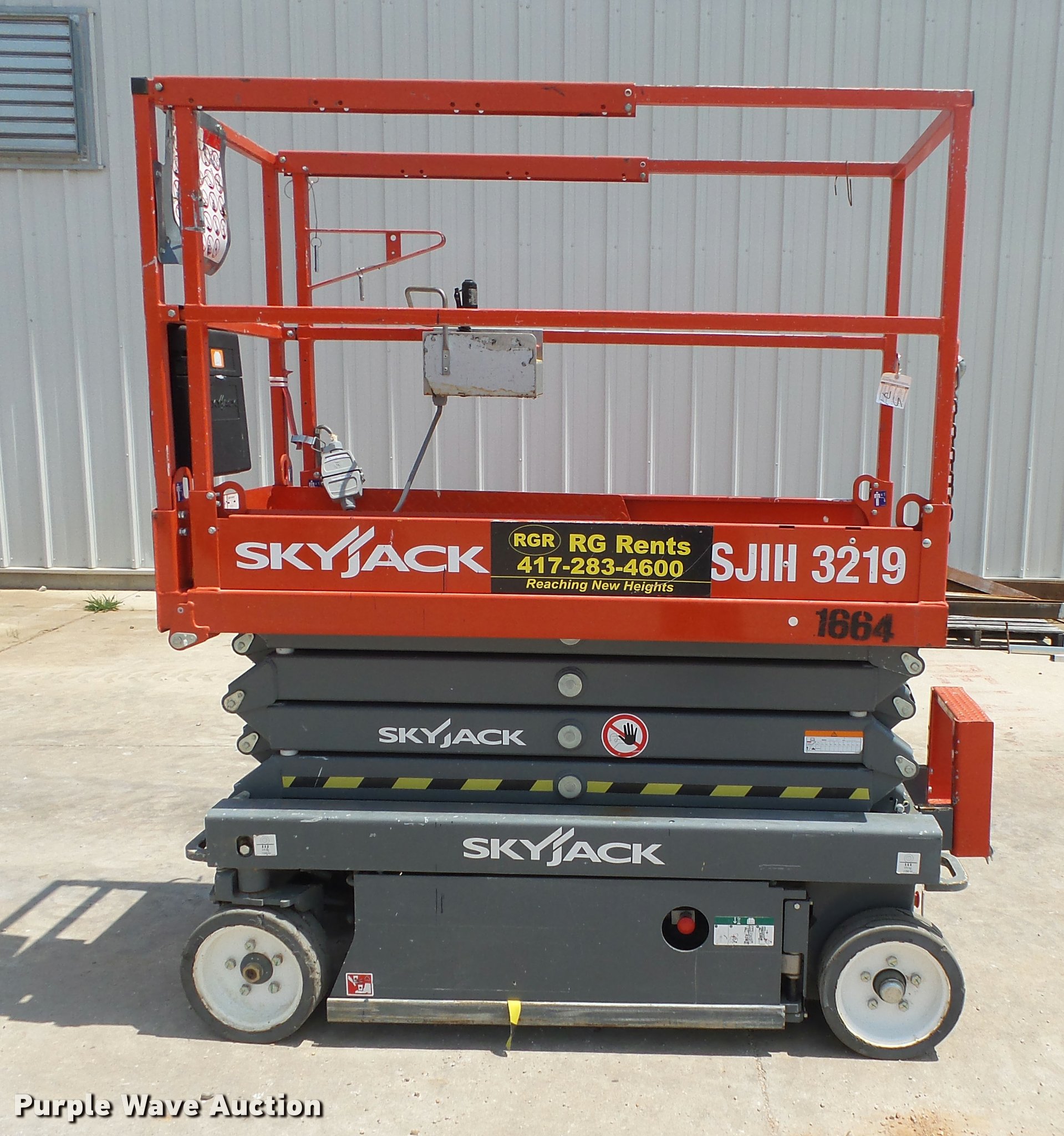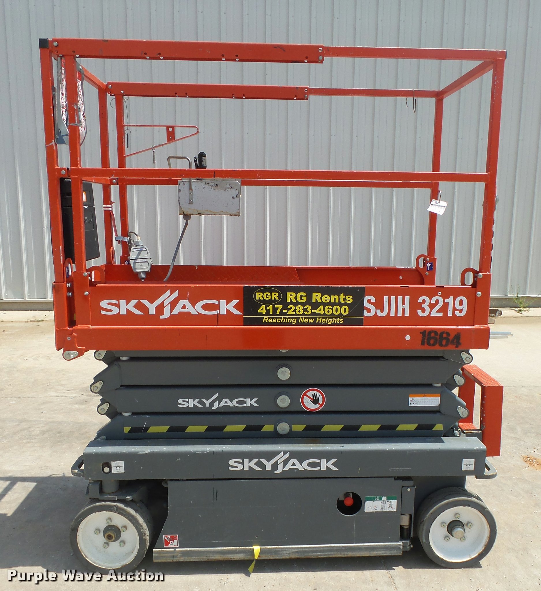 Purple Wave is selling a used Scissor or Vertical Lift in Missouri. This item is a 2015 Sky Jack SJIII 3219 scissor lift with the following: 27 hours on meter, 24V electric operation, 550 lbs maximum lift capacity, 19' maximum lift height, 63"L x 28"W platform, AC power outlet, Manual platform extensions, Ground and platform controls, 12 x 4 solid non-marking tires, Serial 22083076