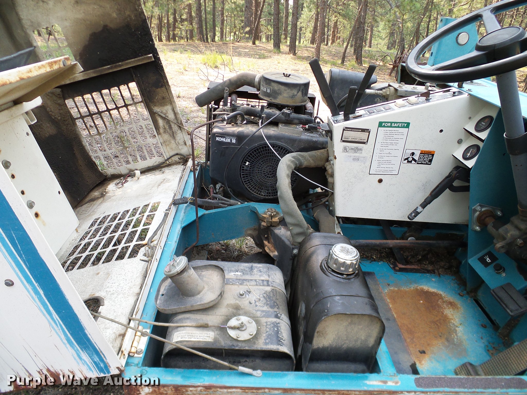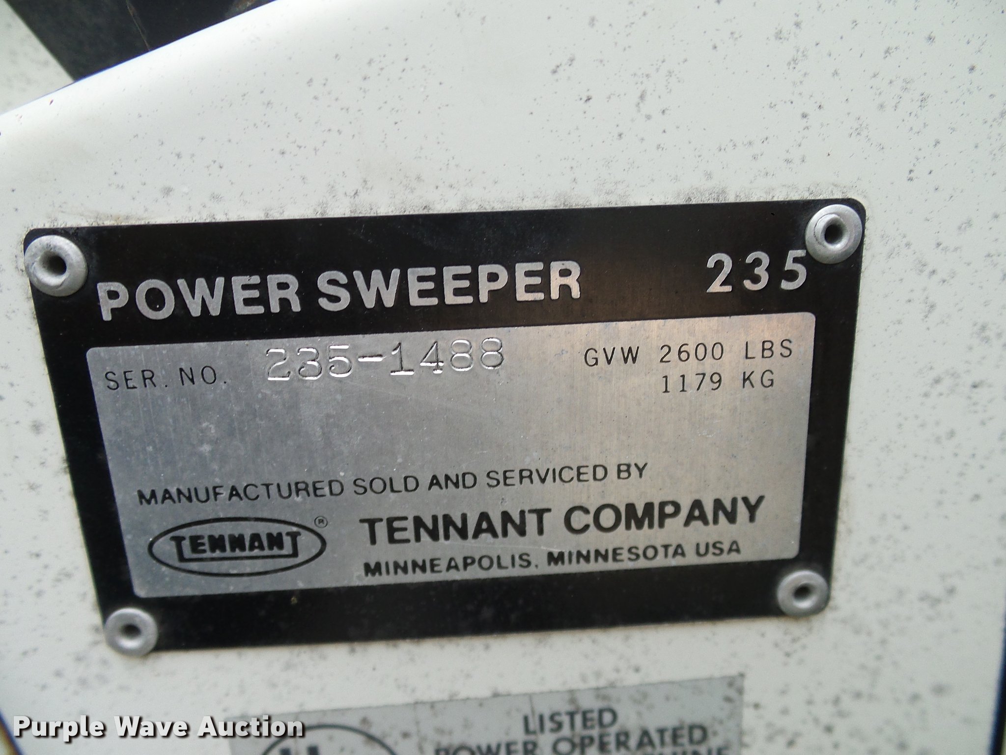 Purple Wave is selling a used Sweeper in Colorado. This item is a Tennant 235 sweeper with the following: 519 hours on meter, Kohler Magnum 18 two cylinder gas engine, 18 HP, Hydrostatic transmission, GVWR 2,600 lbs, Broom removed, Damaged, Serial 235-1488