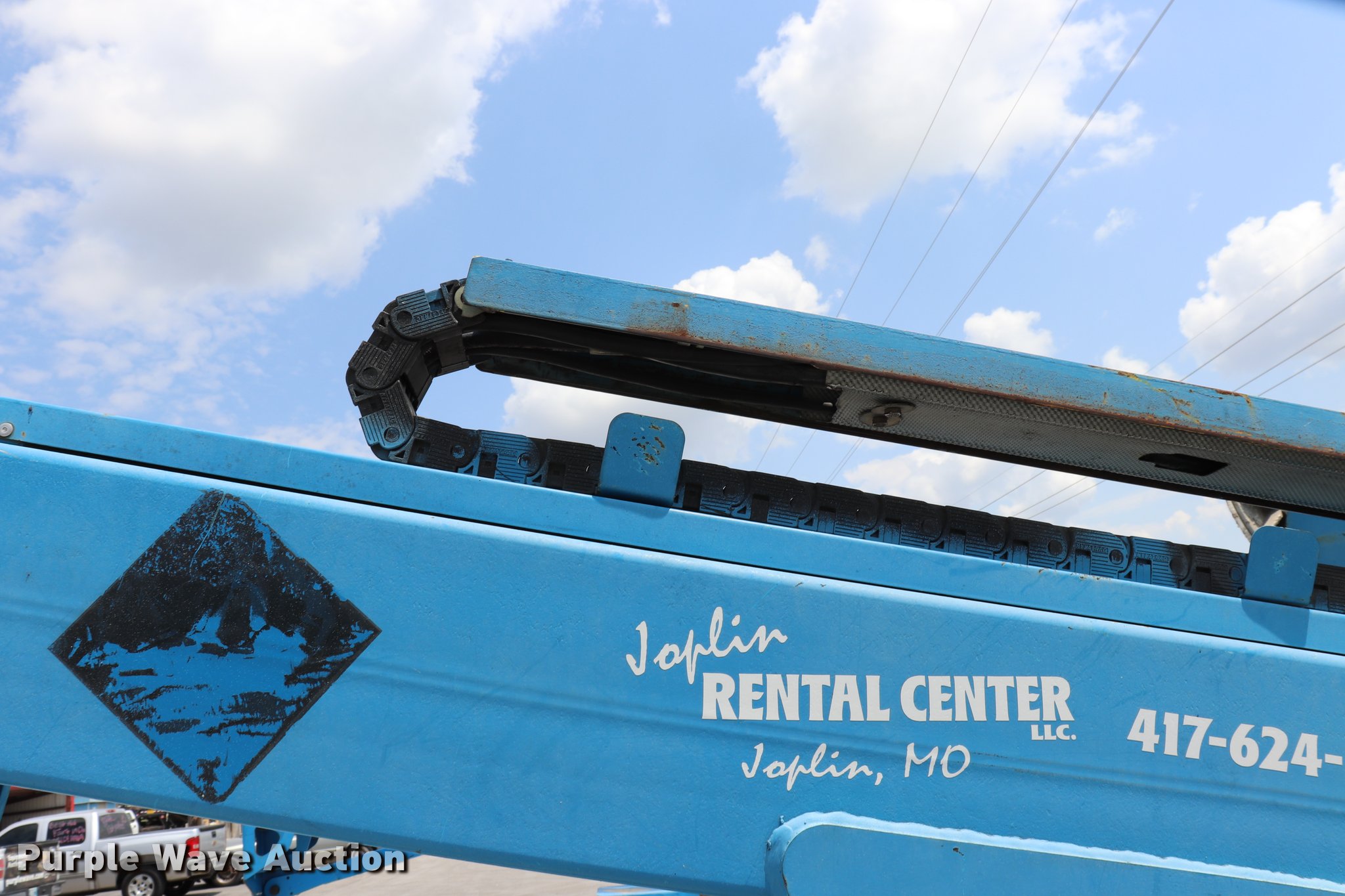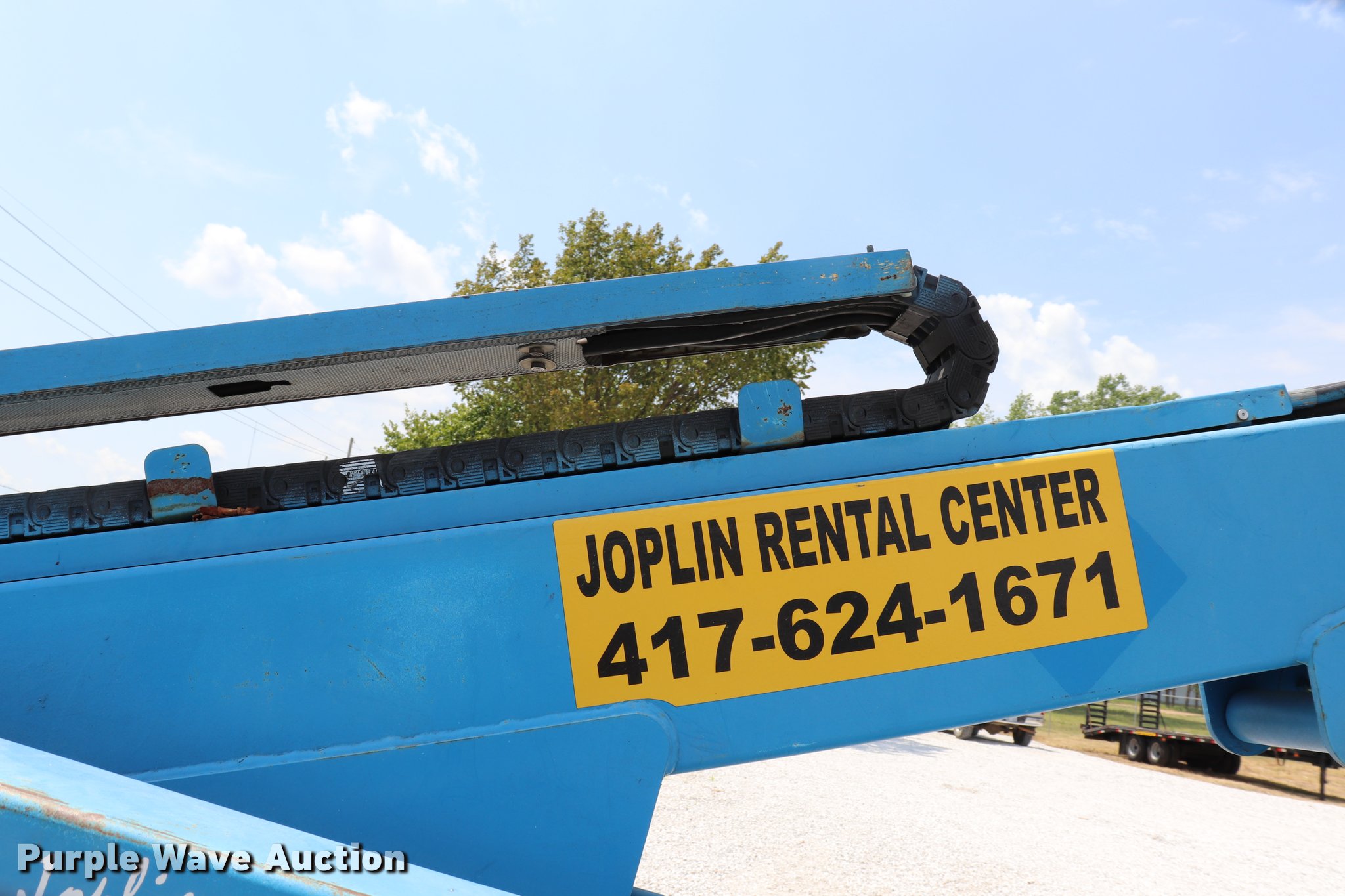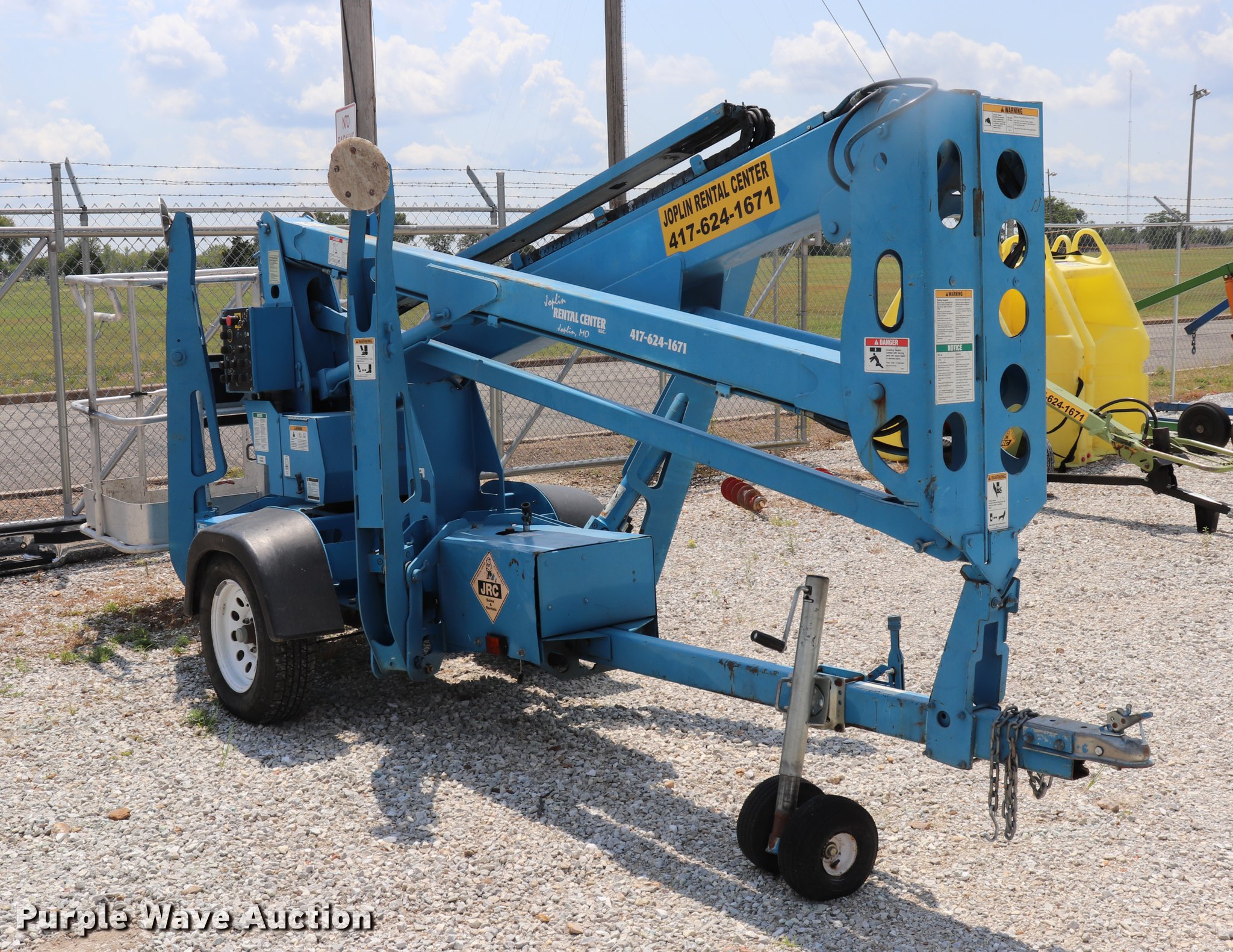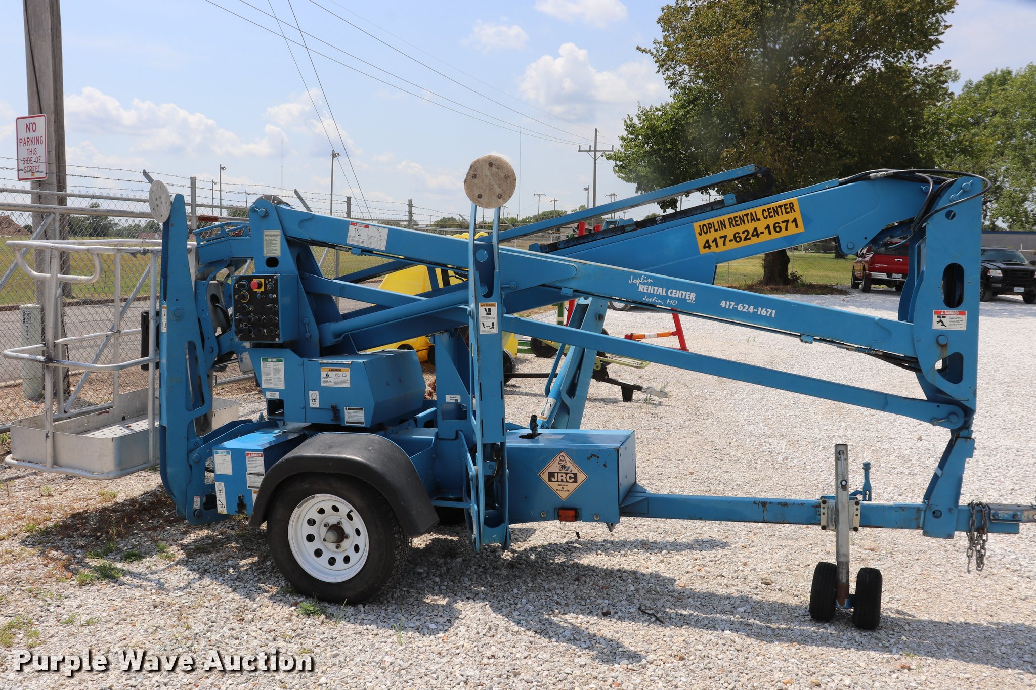2005 Genie T234 boom lift. 181 hours on meter, Electric operation, 3,120 lbs maximum lift capacity, 34' maximum lift height, 46"L x 27"W platform AC power outlet, Platform and ground controls, Hydraulic outriggers, Jack stand, 2" ball hitch, 195/75R14 pneumatic tires, Serial T23405-583. Transfer of ownership documentation will be a bill of sale. Joplin Rental Center LLC. 1617 W 10th. Joplin, MO 64801