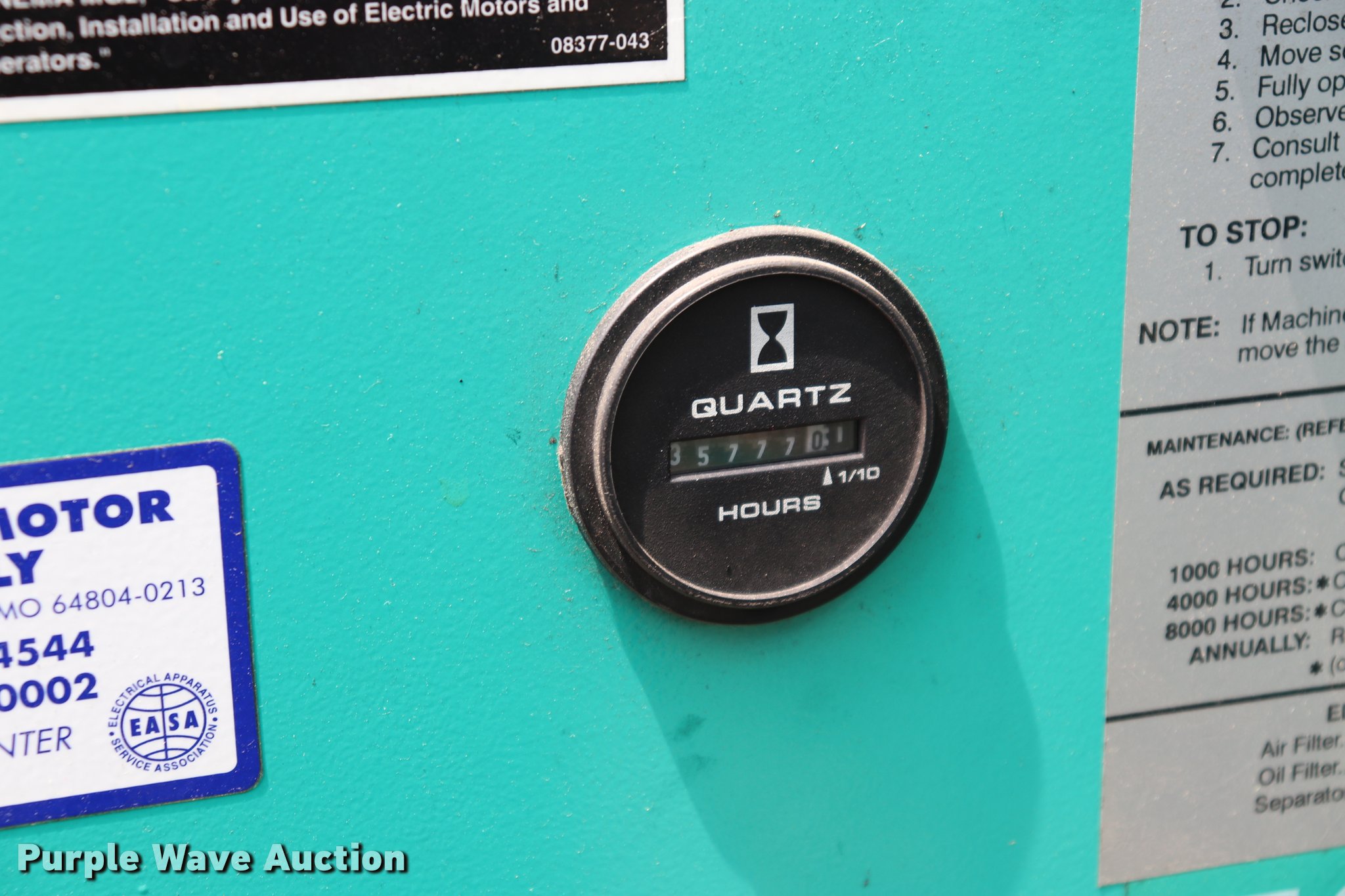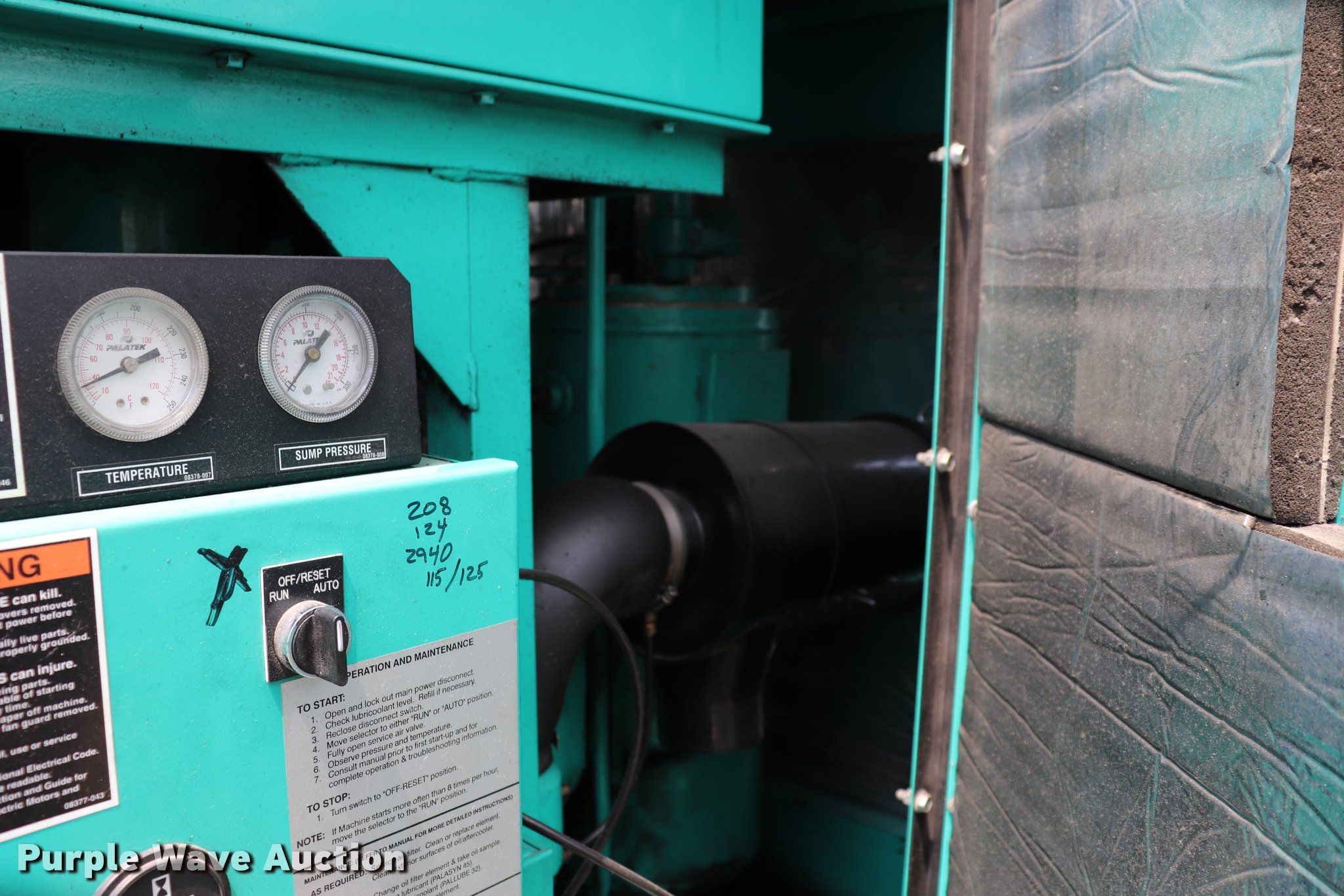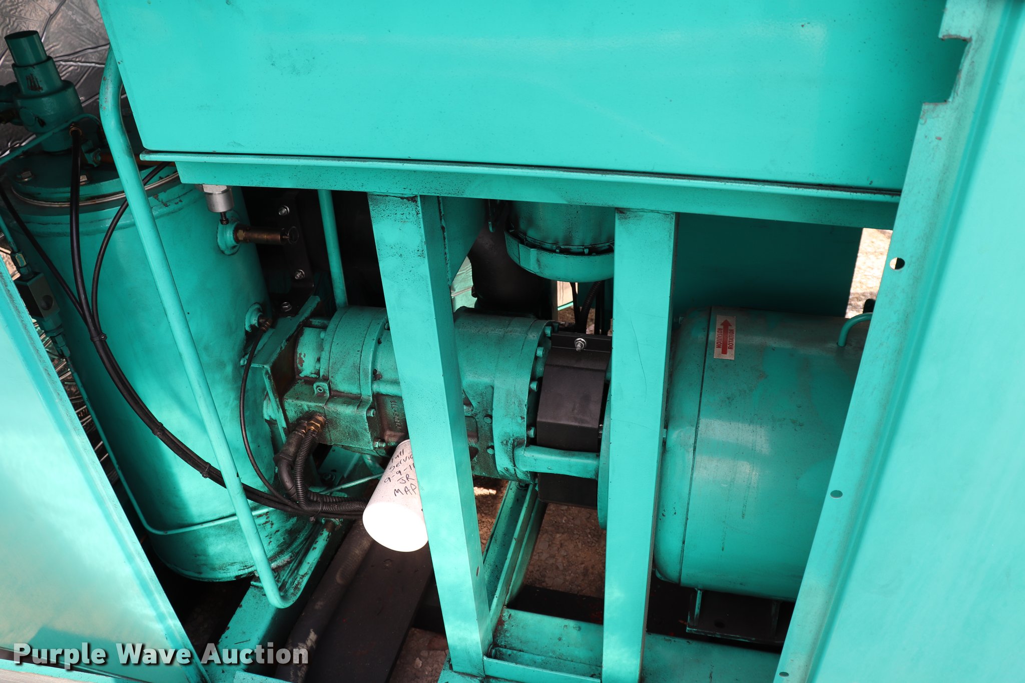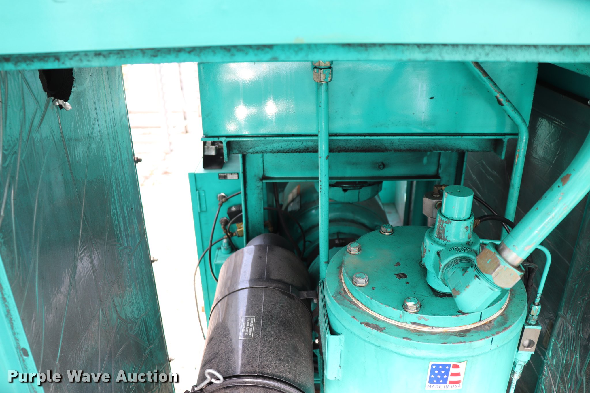 Purple Wave is selling a used Air Compressor in Missouri. This item is a Sullivan Palatek 07711-011 air compressor with the following: 35,777 hours on meter, Lincoln electric motor, 50 HP, Three phase, 230V, Sullivan pump, 200 psi, Sight glass, Skid mounted, Serial Y2014/09/1759