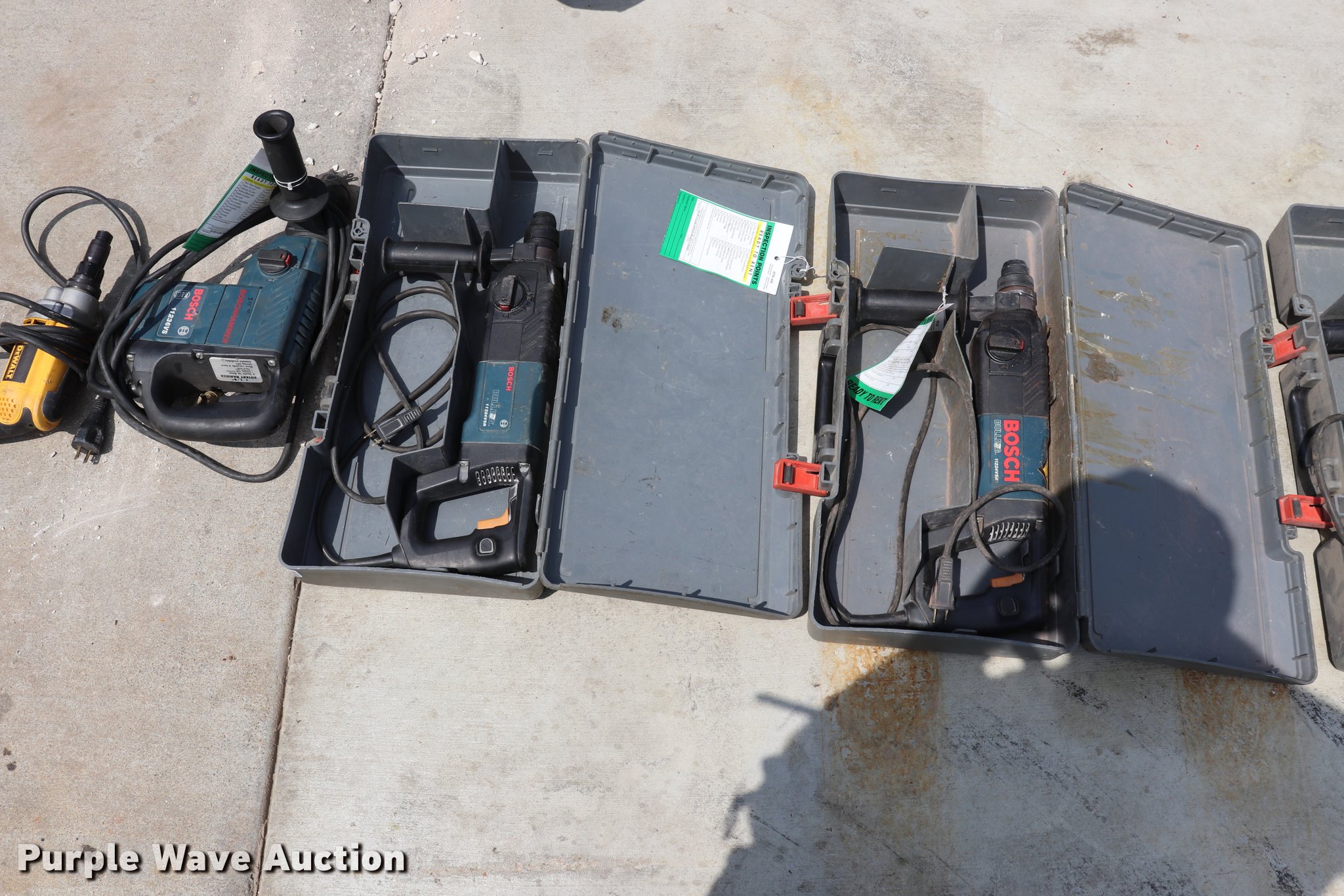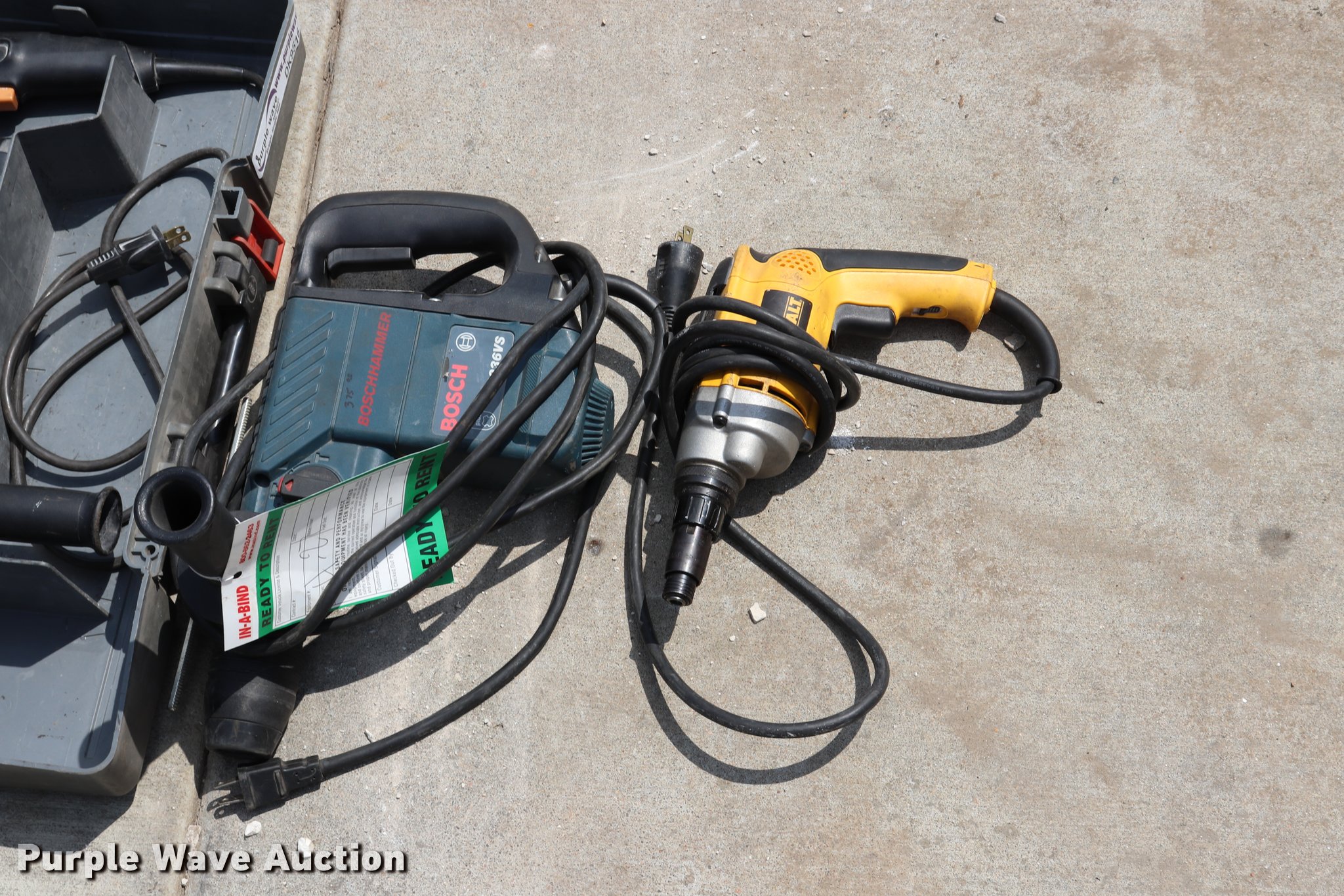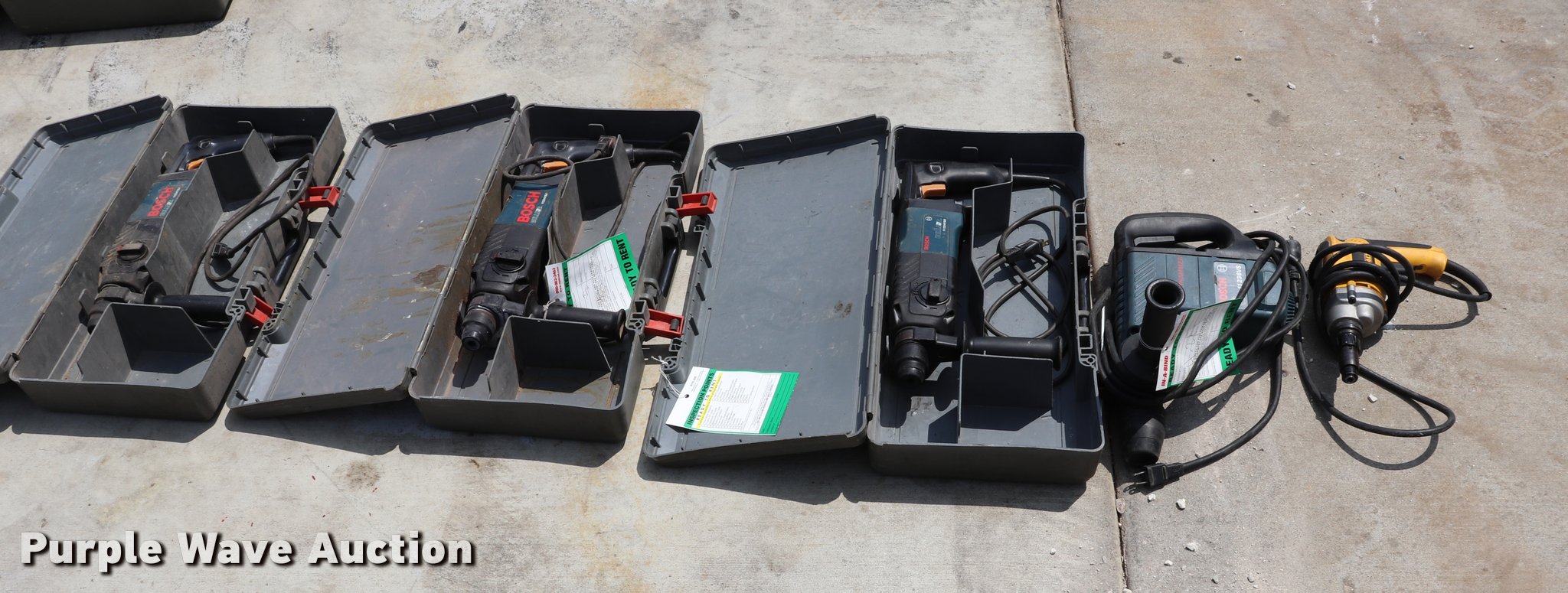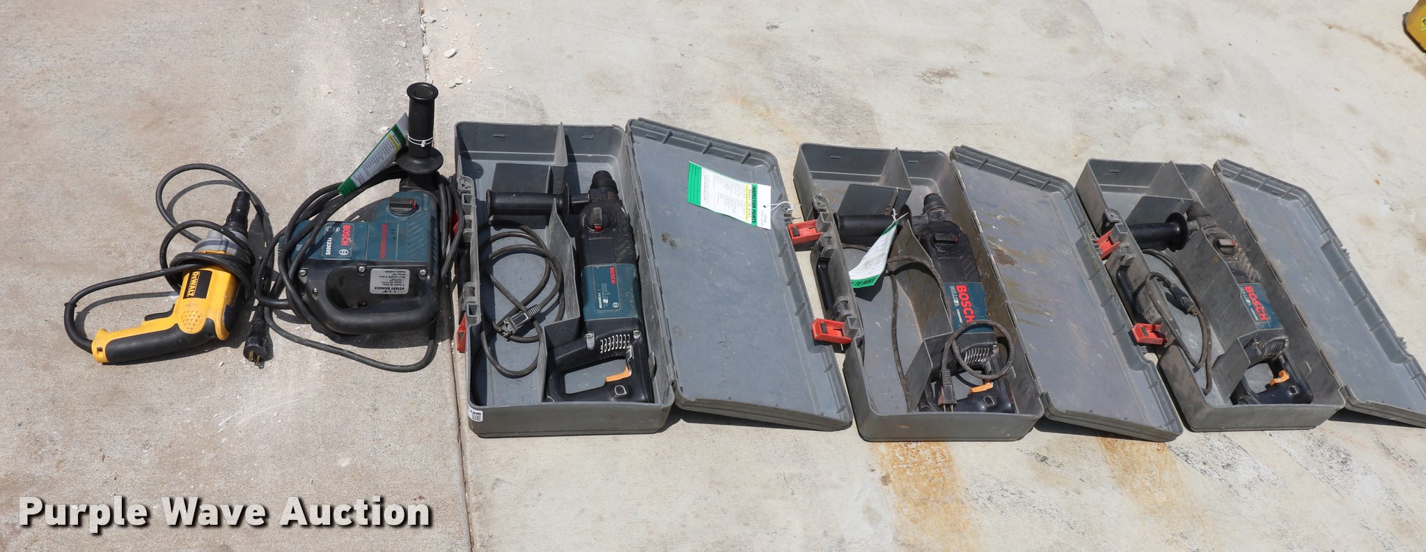 Purple Wave is selling a used Tools in Missouri. This item is a (5) drills with the following: (3) Bosch 11224VSR drills, Bosch 21111236VS drill, DeWalt drill, 120V