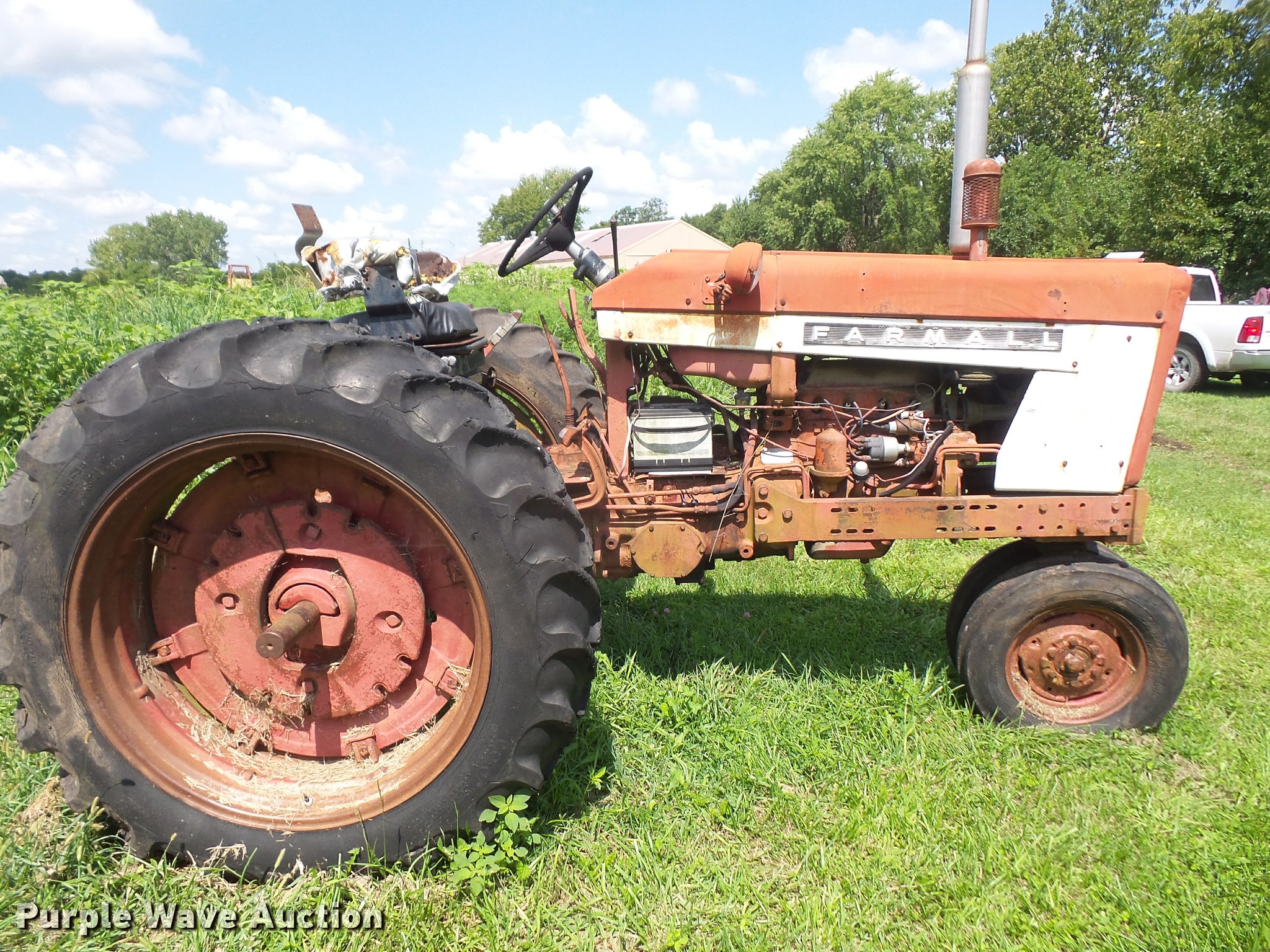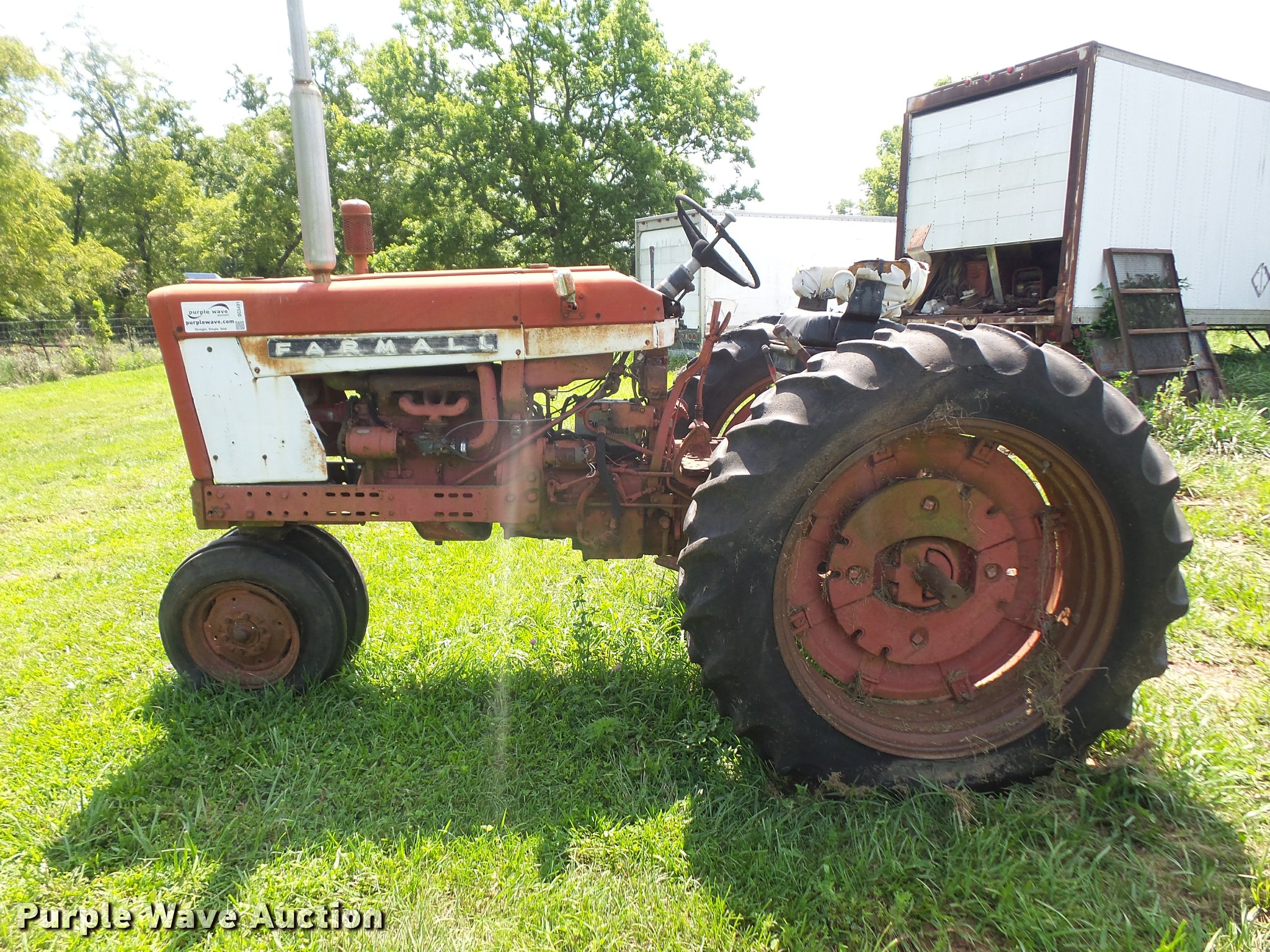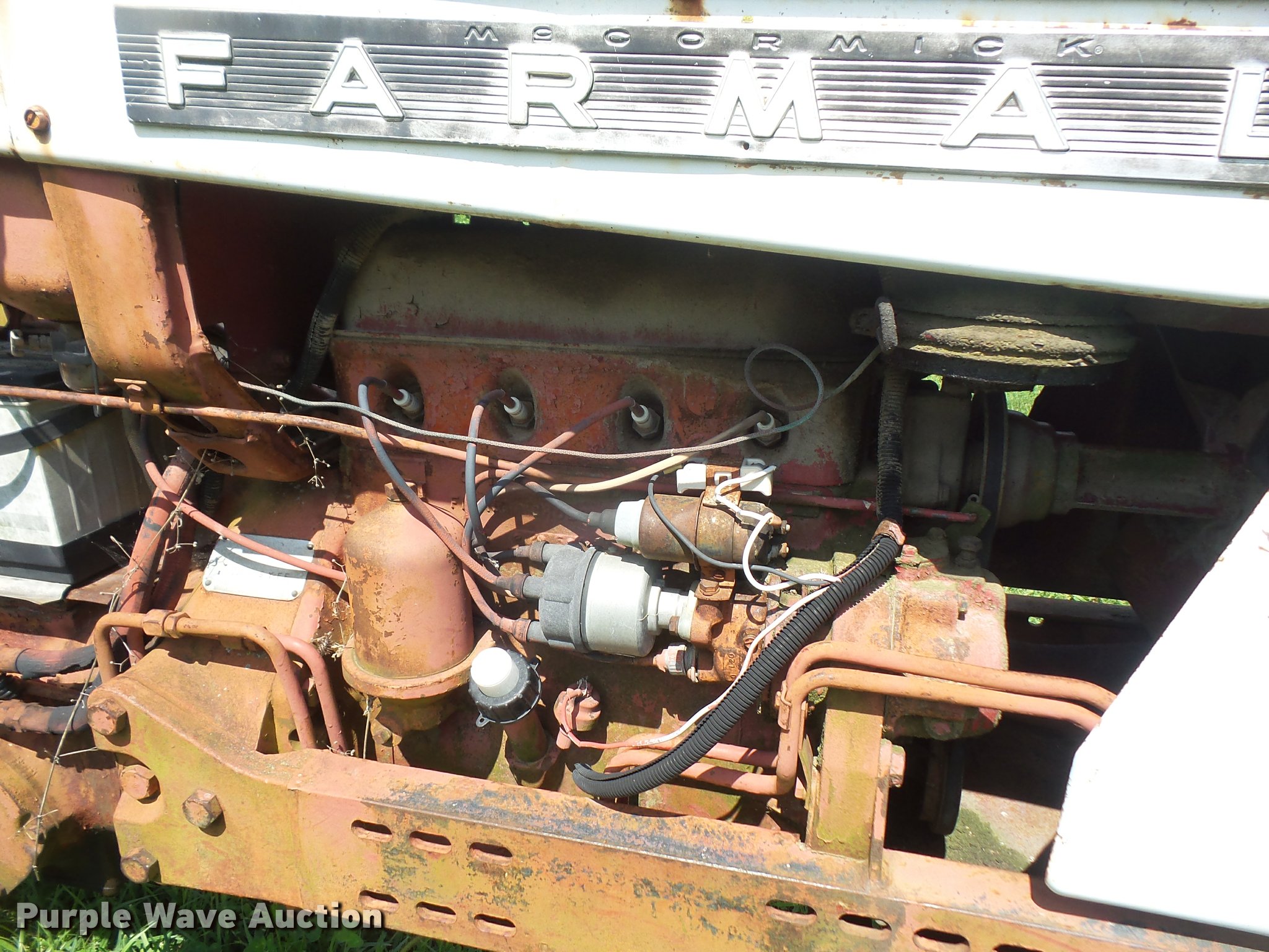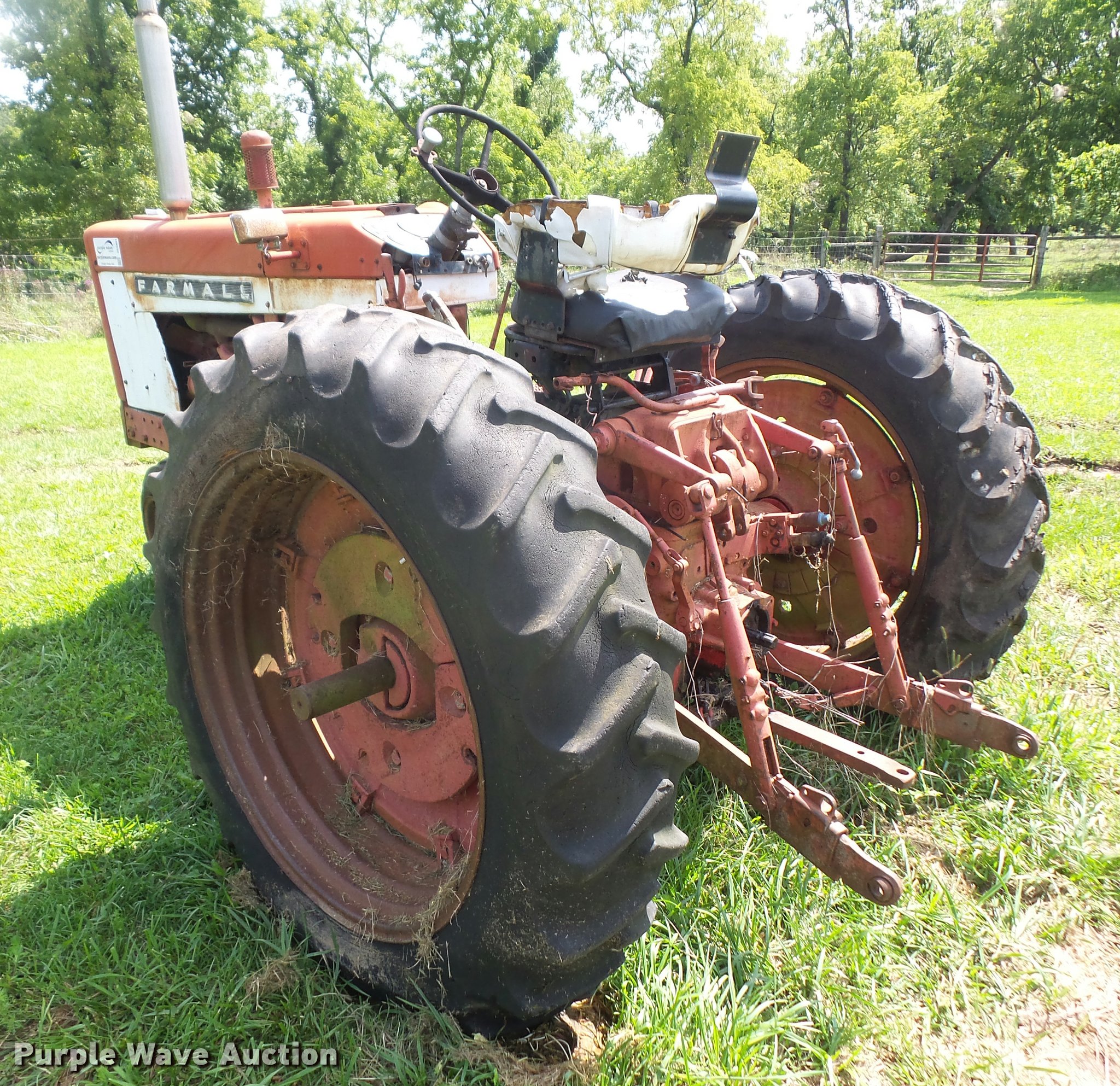 Purple Wave is selling a used Tractor in Kansas. This item is a 1965 Farmall 504 tractor with the following: 3,399 hours on meter, International 2.5L four cylinder gas engine, 46 HP, Torque amplifier transmission, 10F-2R gears, Three point, 540 PTO, Rear hydraulic remote set, 6.00-15 front tires, 13.6-38 rear tires, Additional tires and wheel, Left rear tire leaks air, Non-operational unit, Serial 10848
